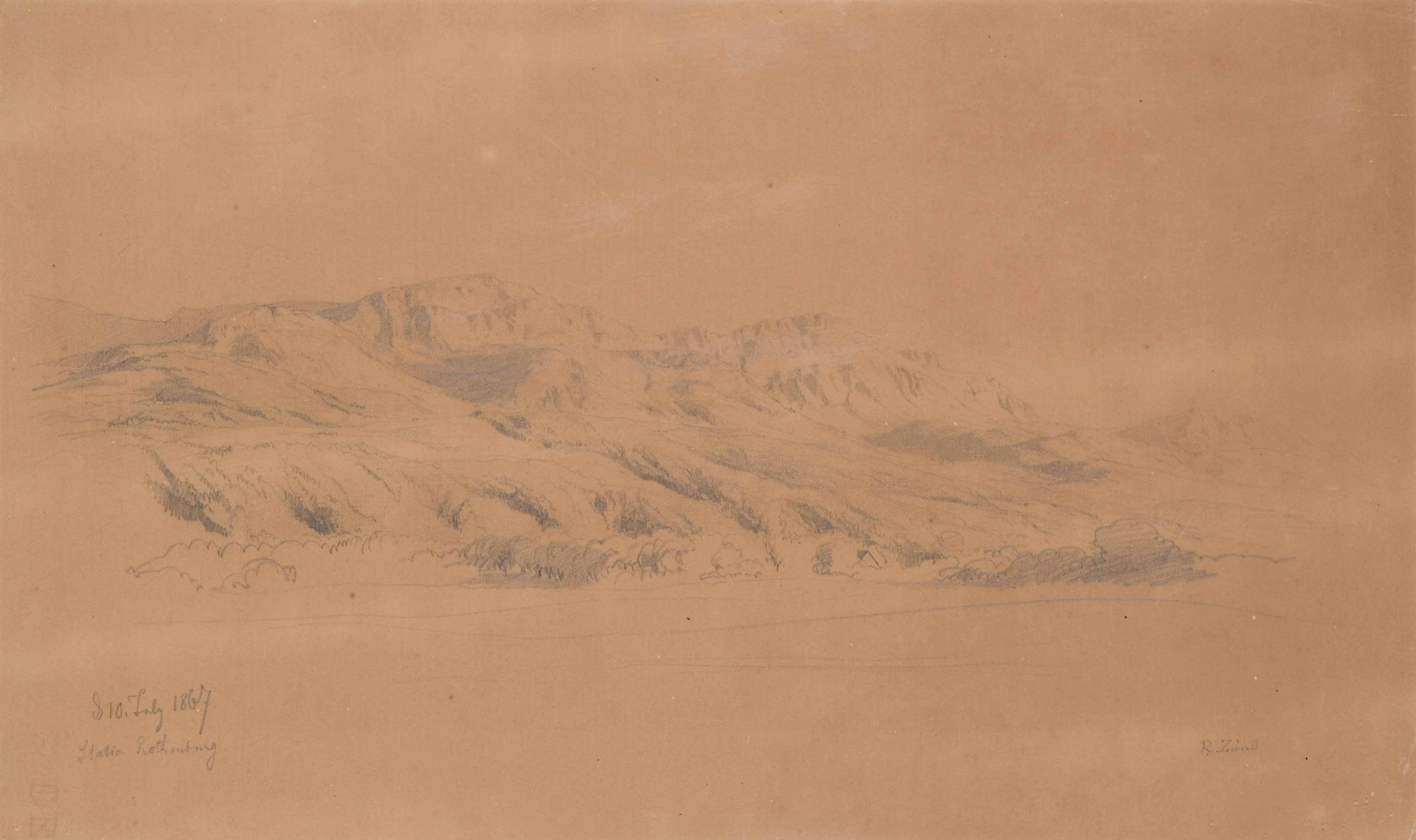 Bergpartie bei der Station Rothenburg. Bleistiftzeichnung, unt. rechts sign., unt. links bez. "d. 10. Iuly 1867, Station Rotheburg." Ca. 28x46 cm (Blatt). Gerahmt. - Gebräunt.