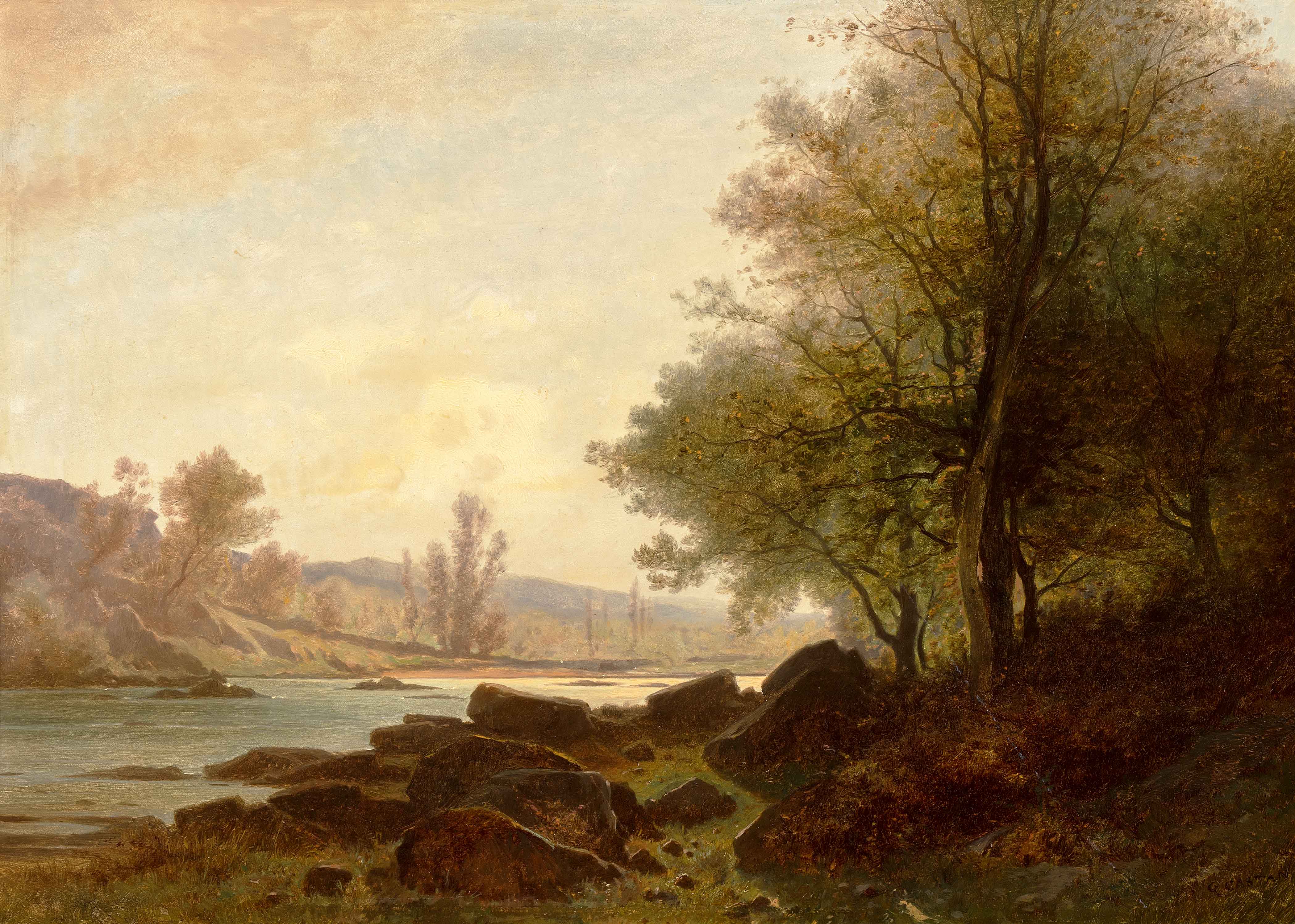 Flusslandschaft. Öl auf Holz. Unten rechts signiert. 38,5x54,5 cm. -Oberflächliche Kratzspur im rechten Bildteil.