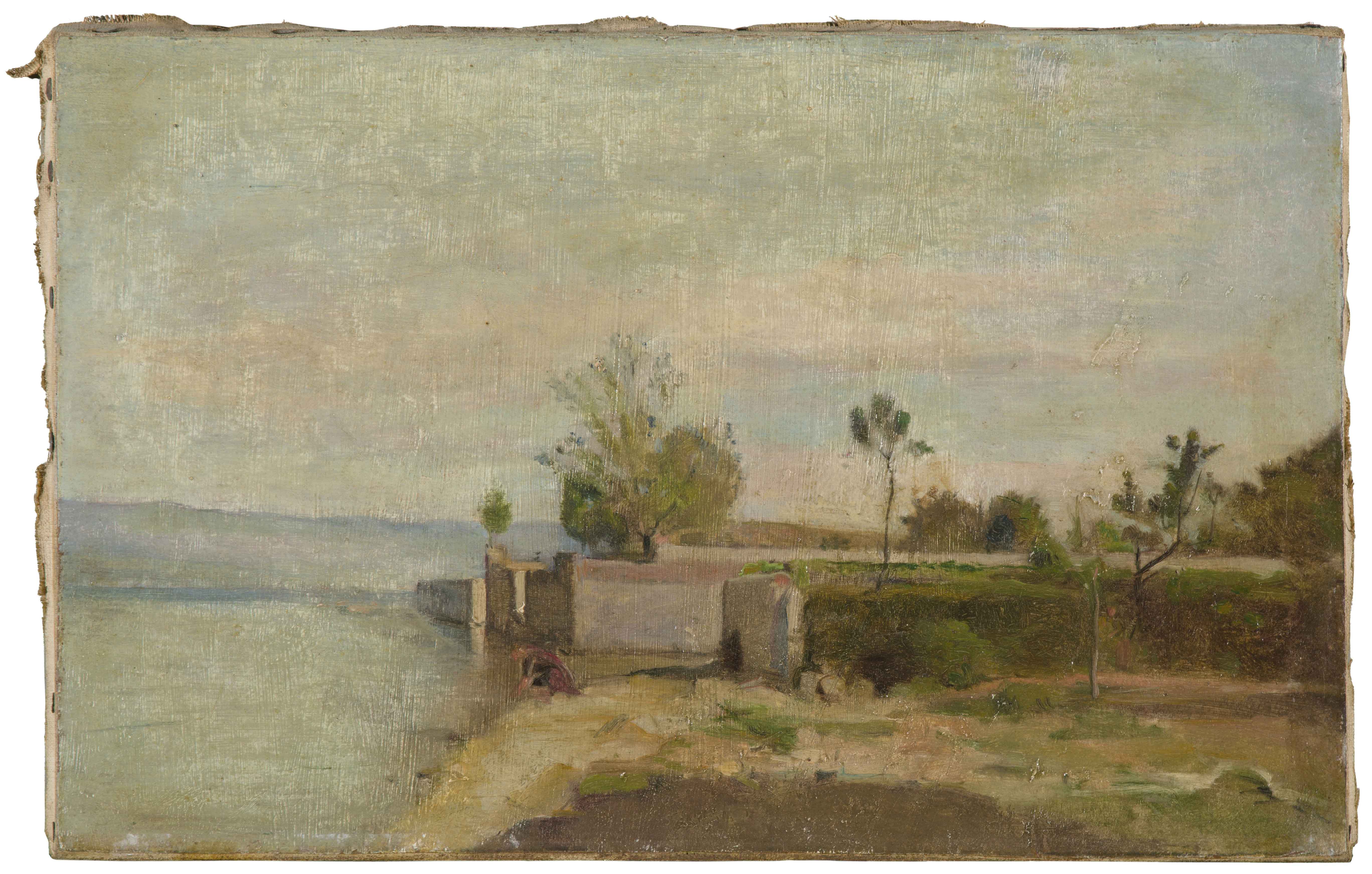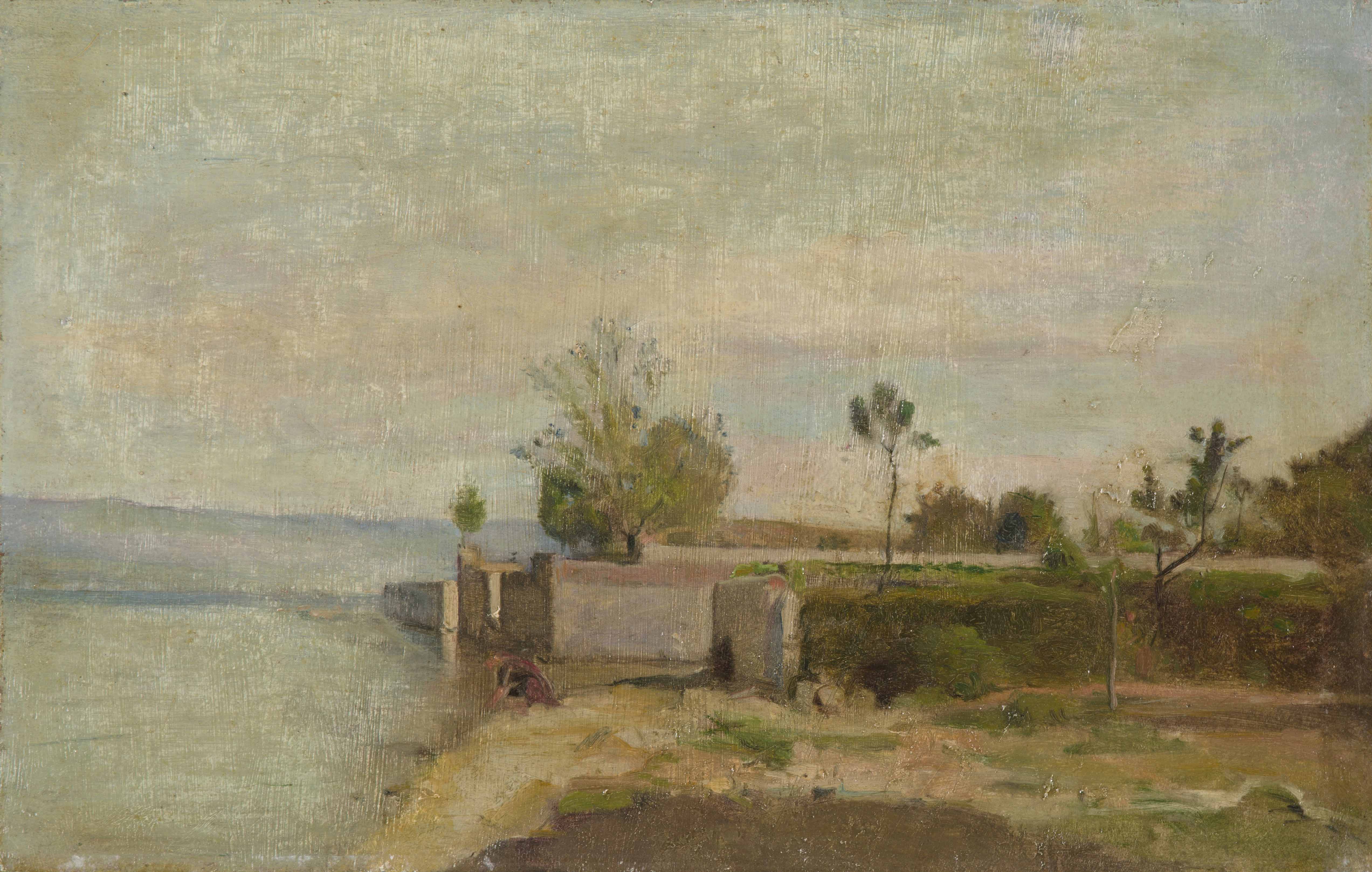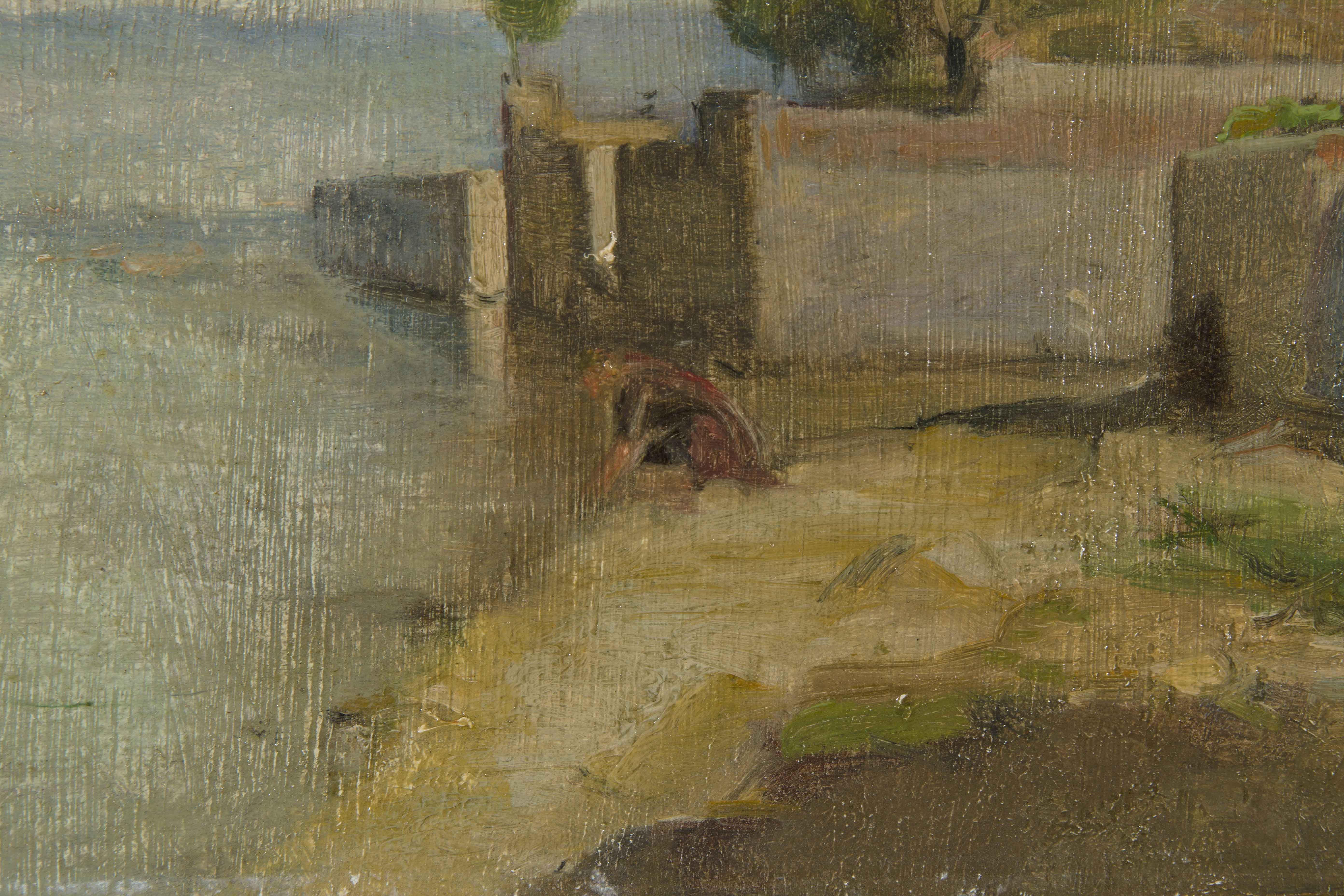 Wäscherin am Ufer des Genfersees. Öl auf Papier über Leinwand. 21,4x34,2 cm. -Vereinzelte Retuschen.