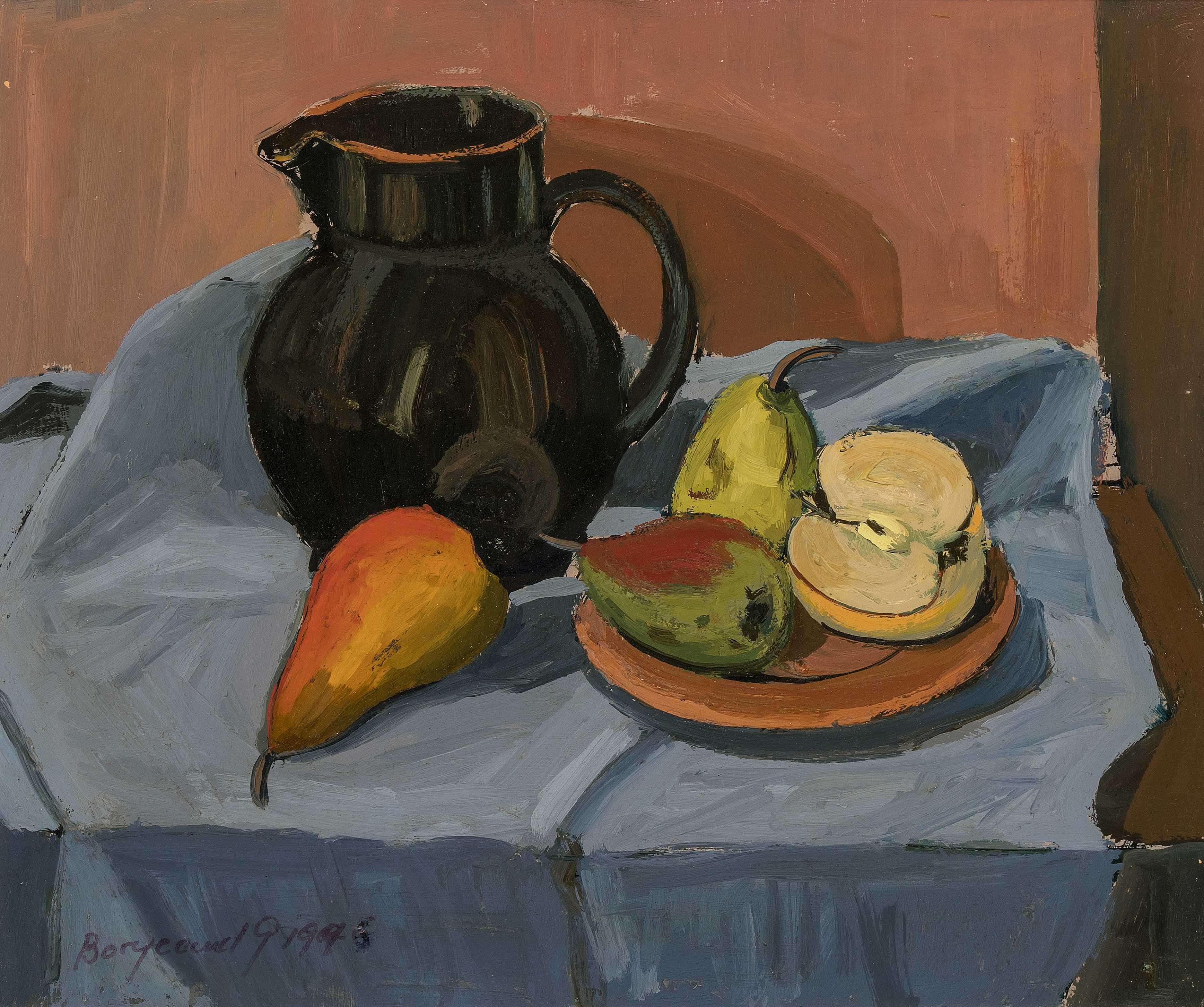 Nature morte au pichet, 1996. Öl auf Hartfaserplatte. Unten links signiert und datiert, verso dediziert. 38x46 cm.