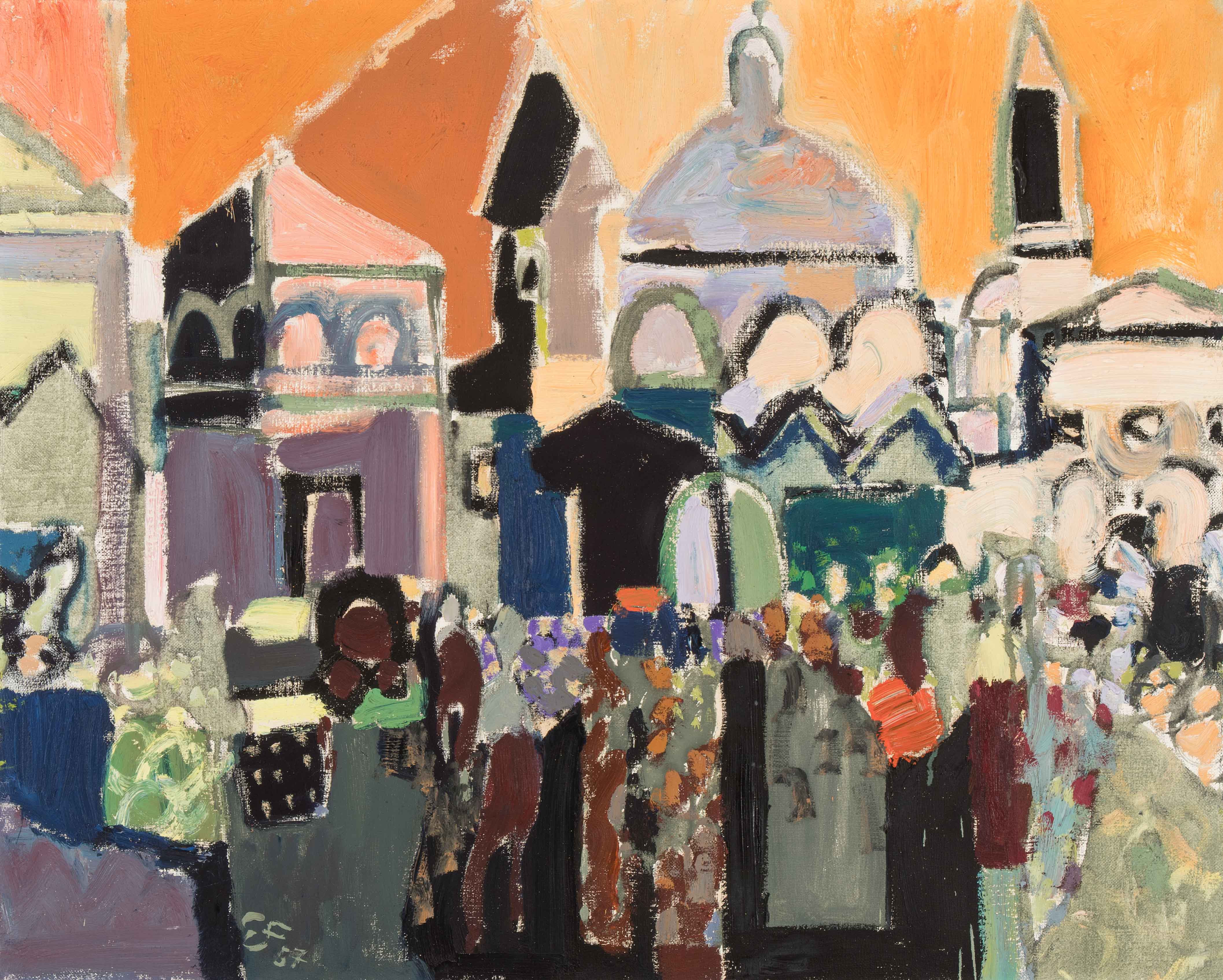 Belebte Piazza, 1957. Öl auf Leinwand. Unten links monogrammiert und datiert. 65x81 cm.