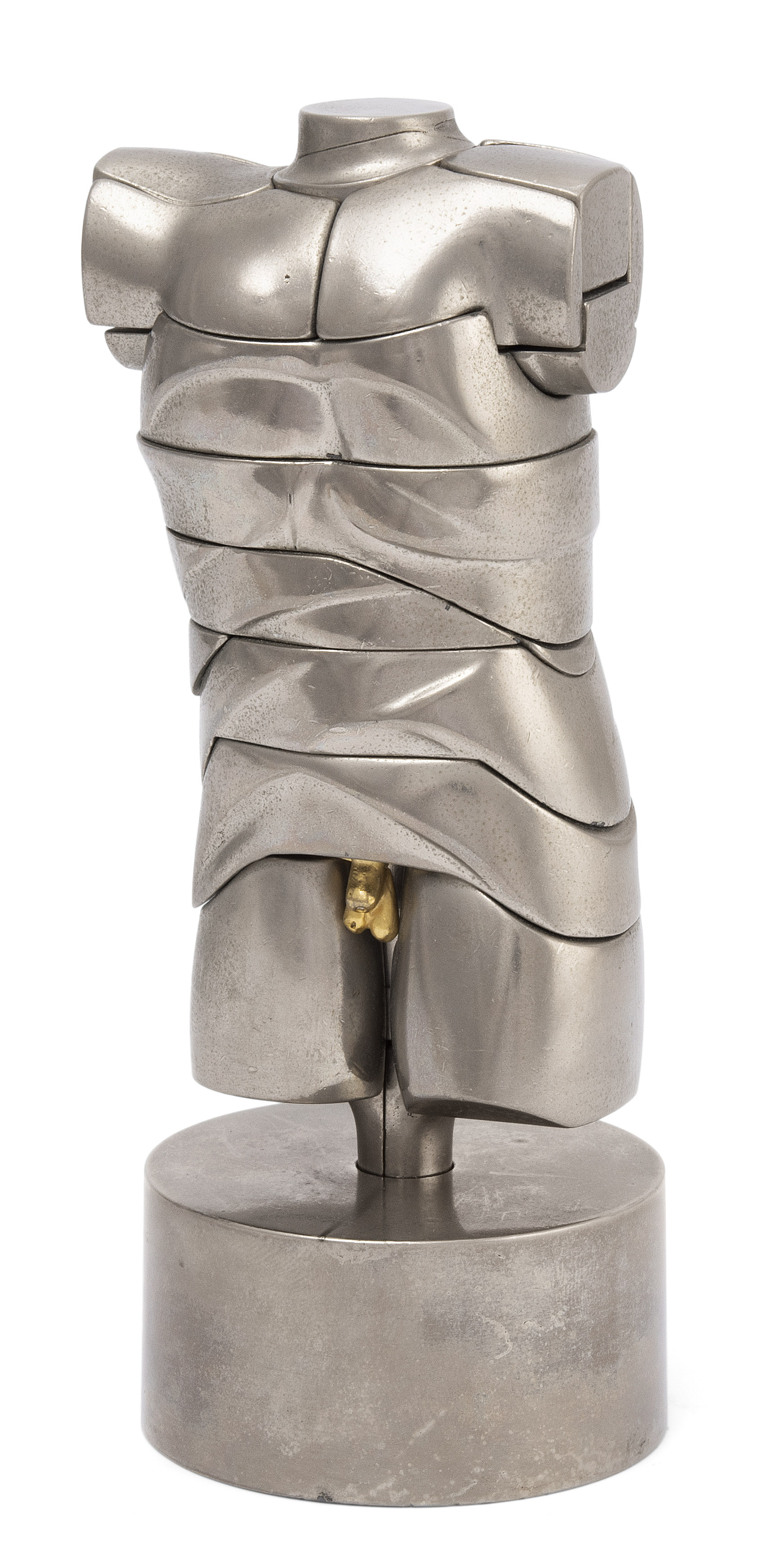 "Mini-David". 1968. Alpaka und Messing mit Aluminiumlegierung, vernickelt mit einem Nephrite im Ring. 8981/10000. Zerlegbare Plastik aus 22 Elementen, davon ein Ring. Auf der Schulter nummeriert und signiert. 5,4x10x3,6 cm. -Patina. Wenige Bestossungen und winzige Kratzer.