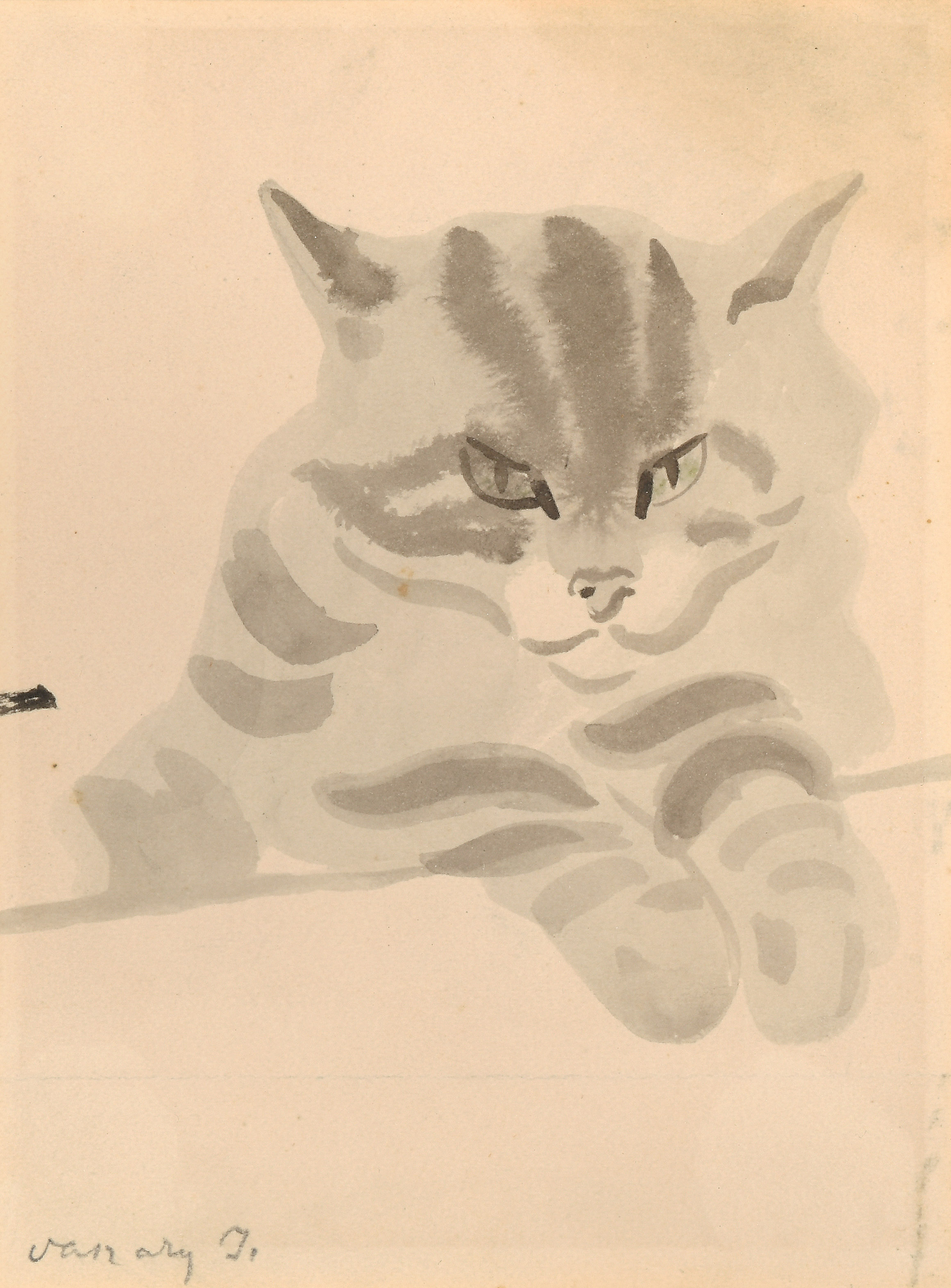 Katze. Tusche laviert. Unten links in Bleistift signiert. Blattgrösse 21,5x16,3 cm. Gerahmt. -Blatt leicht gebräunt und etwas fleckig. Hellerer Lichtrand. Horizontale Falte in der unteren Bildhälfte. Verso an allen Rändern an Passepartout montiert. Klebrestspuren.