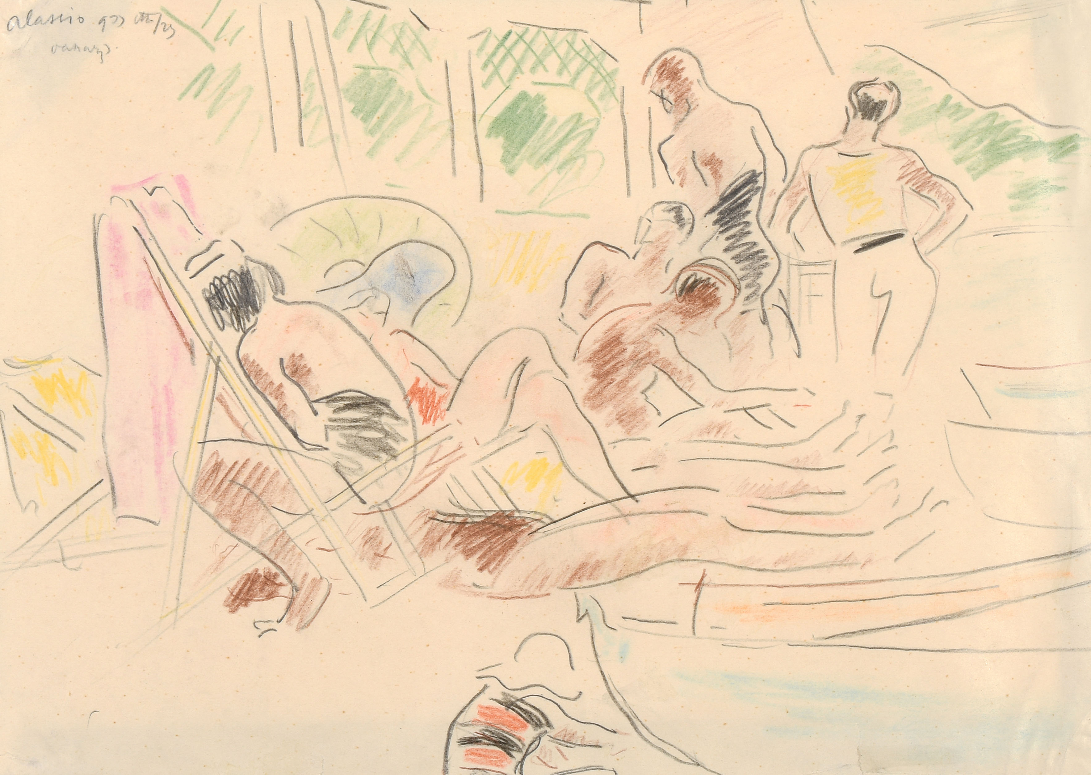 Strand in Alassio. Bleistift und Buntstift auf Papier. Oben links in Bleistift bezeichnet: "Alassio", unleserlich datiert und signiert. Verso mit Etikett der Galerie Semiha Huber. Lichtmass 19,5x27,6 cm. -Blatt leicht gebräunt und fleckig. Wenige Knitter und kleine Einrisse an den Rändern. Blatt wurde zwischen Passepartout und Rückkarton montiert.