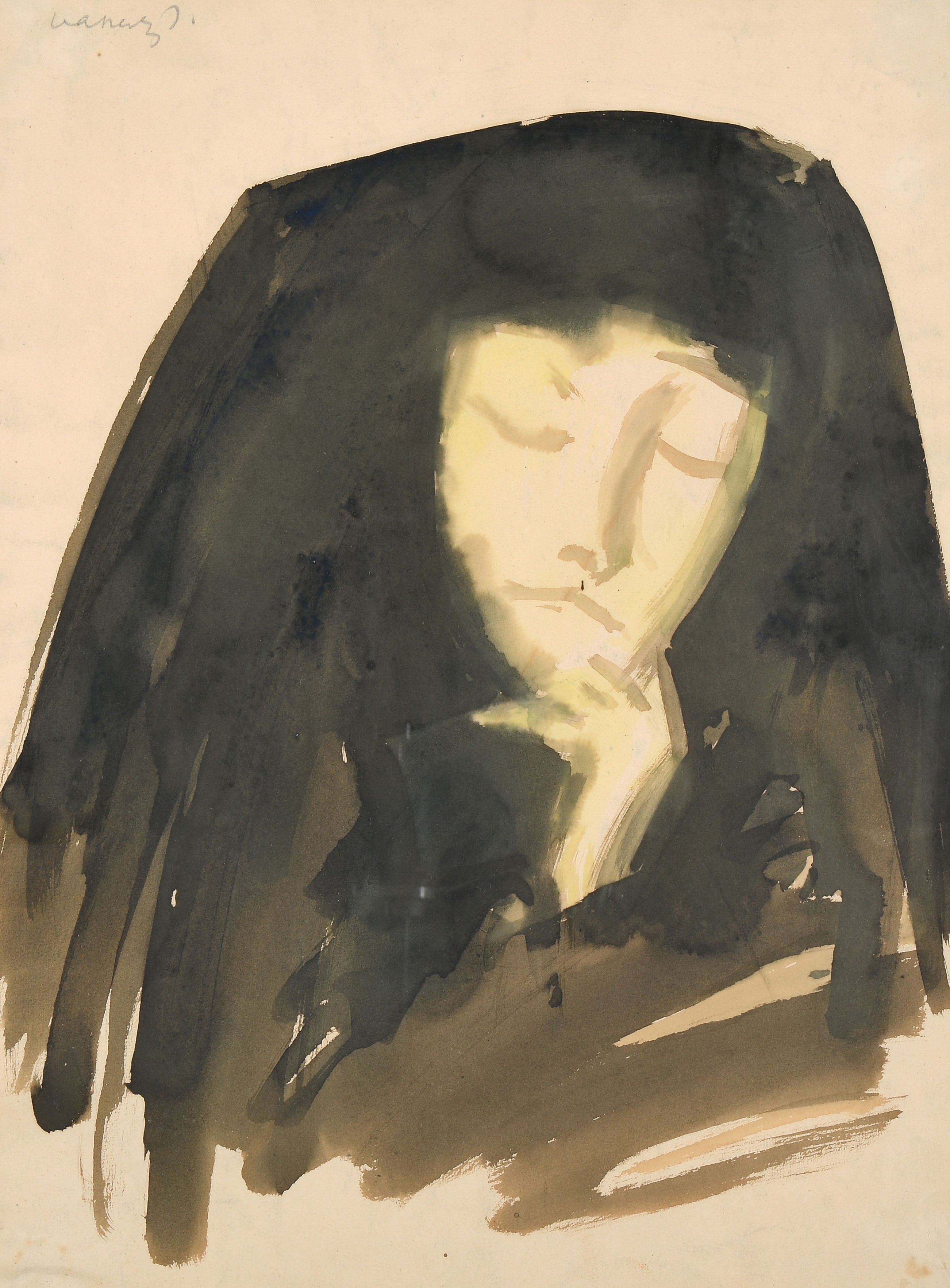 Trauernde Frau. Tusche und Aquarell auf Papier. Oben links in Bleistift signiert. Blattgrösse 40,8x30,2 cm. Gerahmt. -Blatt gebräunt mit Knitter und wenig gewellt. Verso partiell an Rückkarton montiert. Klebspurreste recto und verso.