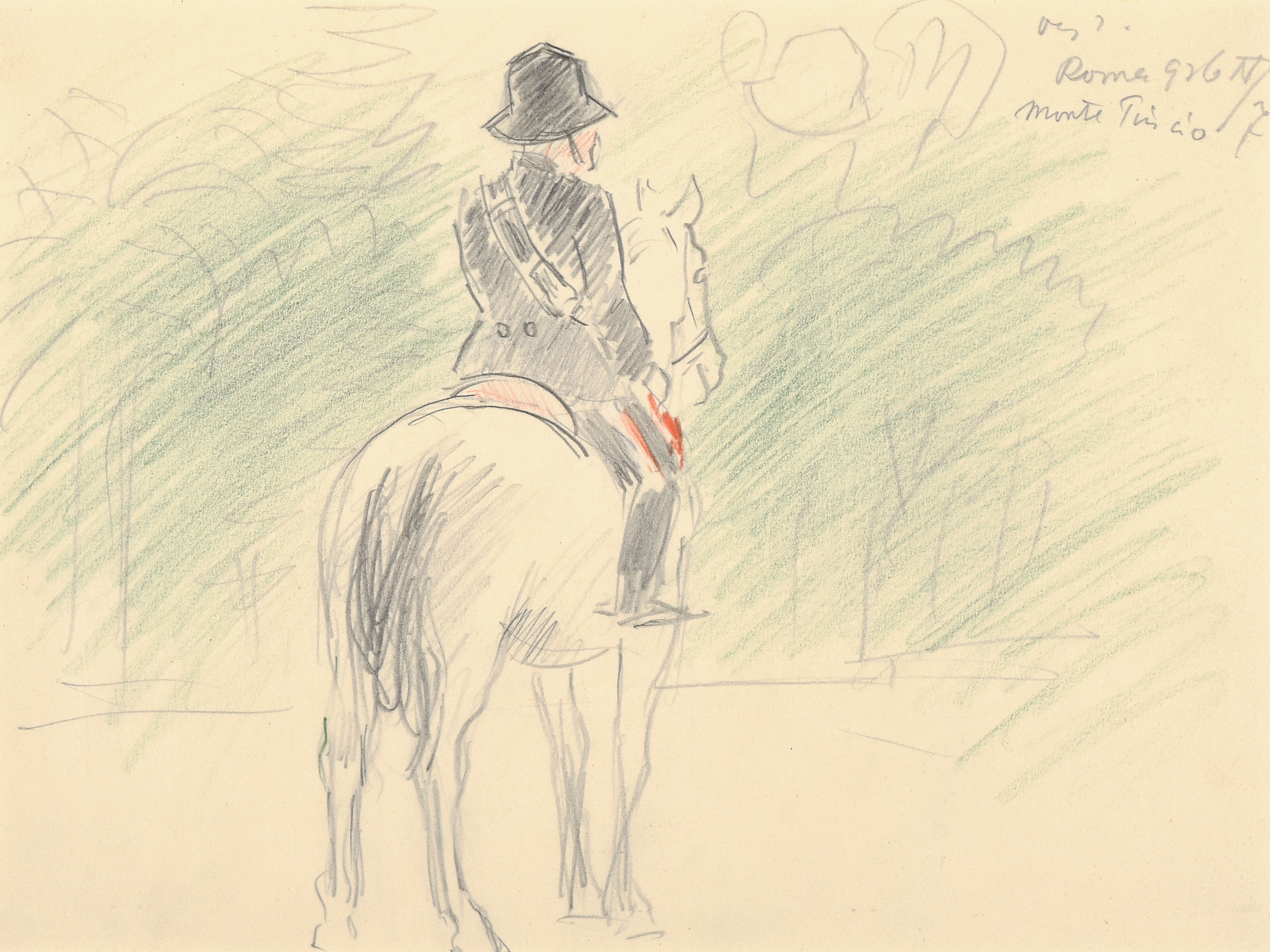 Uniformierter Reiter. Bleistift und Buntstift auf Papier. Oben rechts bezeichnet: "Roma", unleserlich nummeriert und bezeichnet: "Monte ...". Blattgrösse 24,6x33,3 cm. Gerahmt. -Blatt leicht gebräunt. Blatt mit Knitter. Verso an allen Rändern an Passepartout montiert.