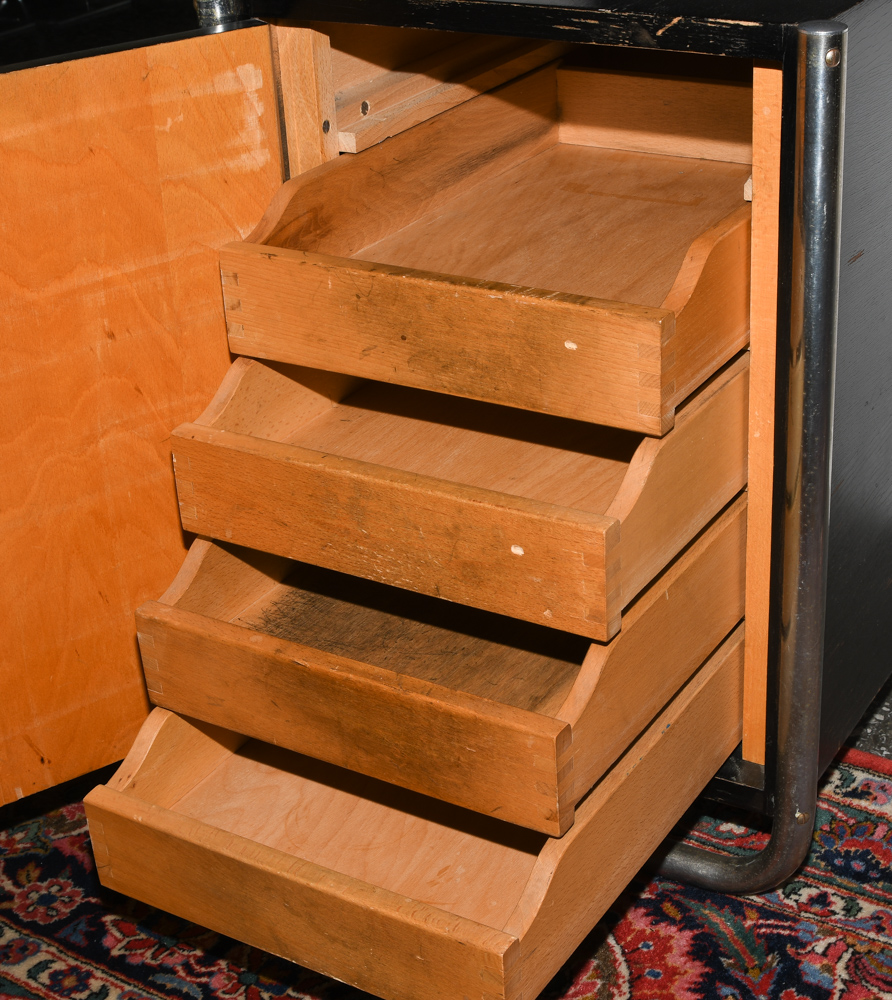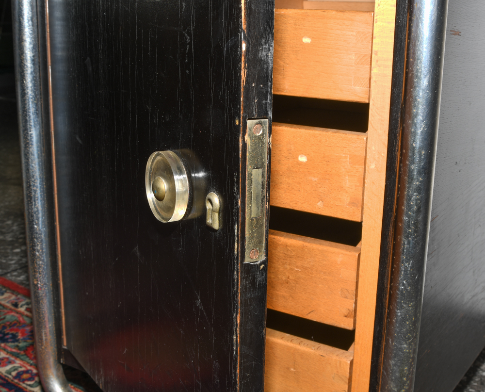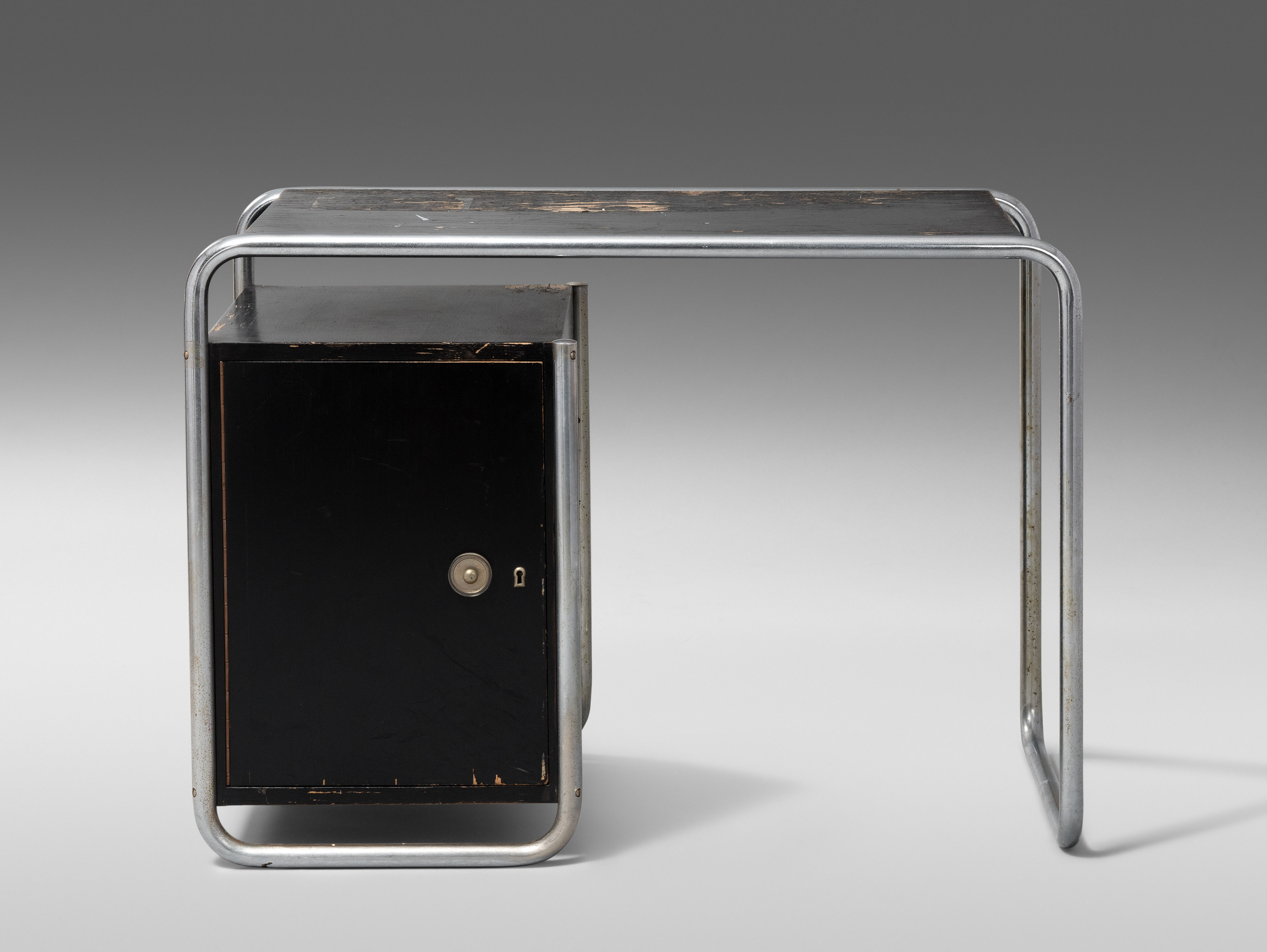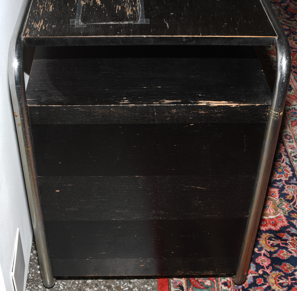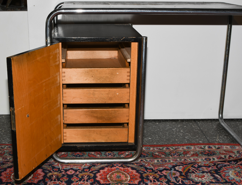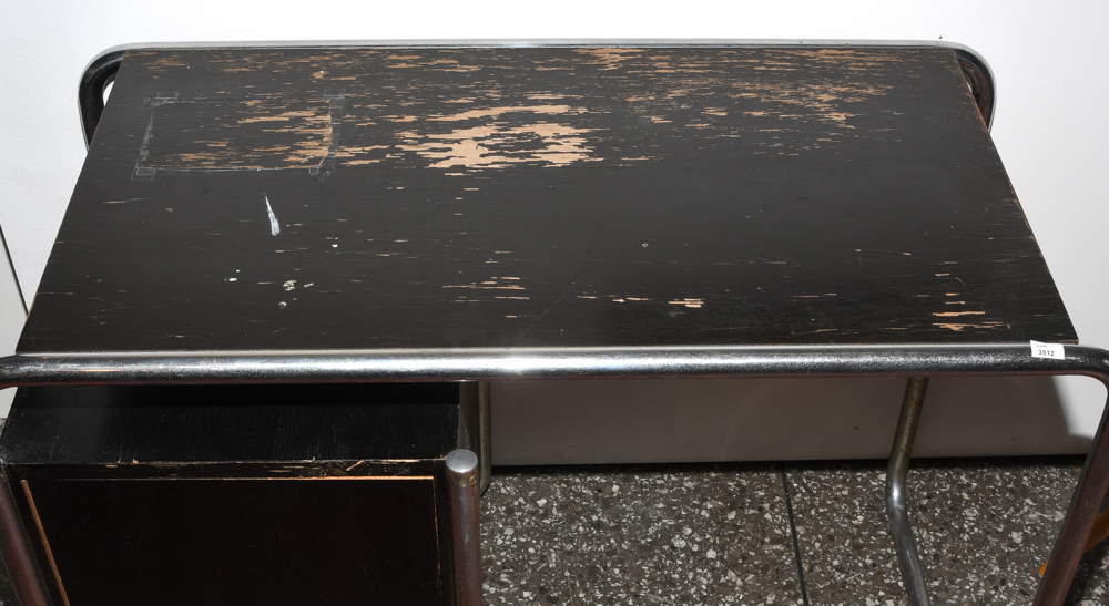 Schreibtisch B21, Entwurf ca. 1930. Ausführung Thonet, aus der Entwurfszeit. Verchromtes Metallrohr und Holz schwarz gebeizt. Altersbedingte starke Gebrauchsspuren, Farb- und Chromabsplitterungen. Guter Zustand. 92x48x67 cm.