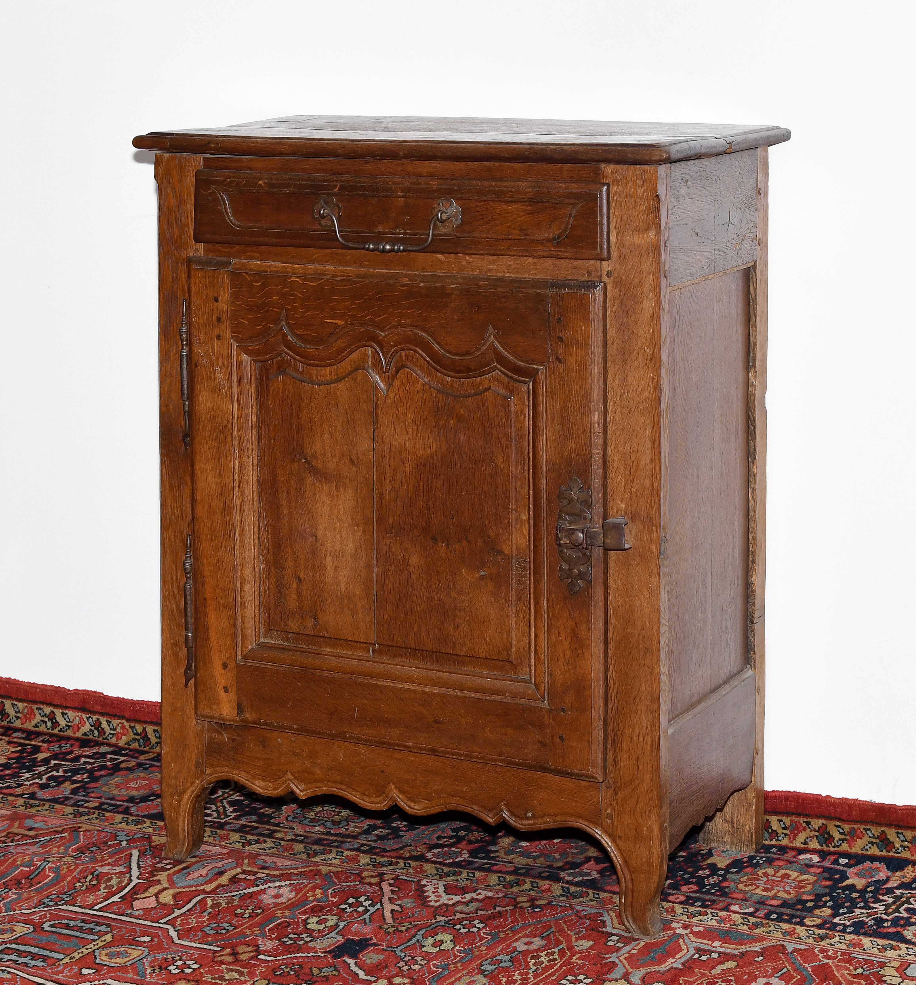 Barock 18.Jh. Eiche. Rechteckiger eintüriger Korpus mit oben angelegter Schublade. Türe mit beschnitzten Zargen und dreiseitig eingeschobenen Füllungen. Gebrauchsspuren. 78x41x102 cm.