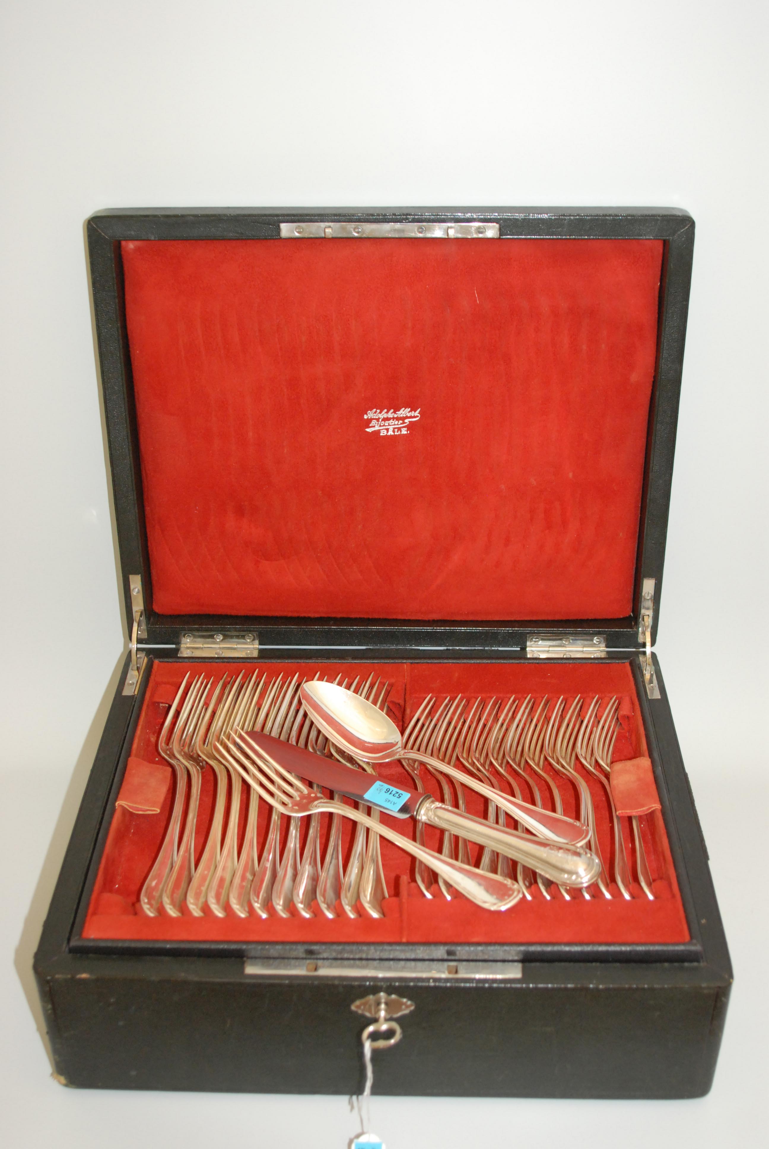 Paris, um 1900. Silber, 72-teilig. Meistermarke Henri Soufflot. Bestand: 12 Suppenlöffel, 12 Fleischmesser u. 12 -gabeln, 12 Dessertlöffel, 12 -messer und 12 -gabeln. Rückseitig monogrammiert. Garantie-, Meistermarke, Feingehalt 950. Ca. 3130 g (o. Messer). In Originalkasten.