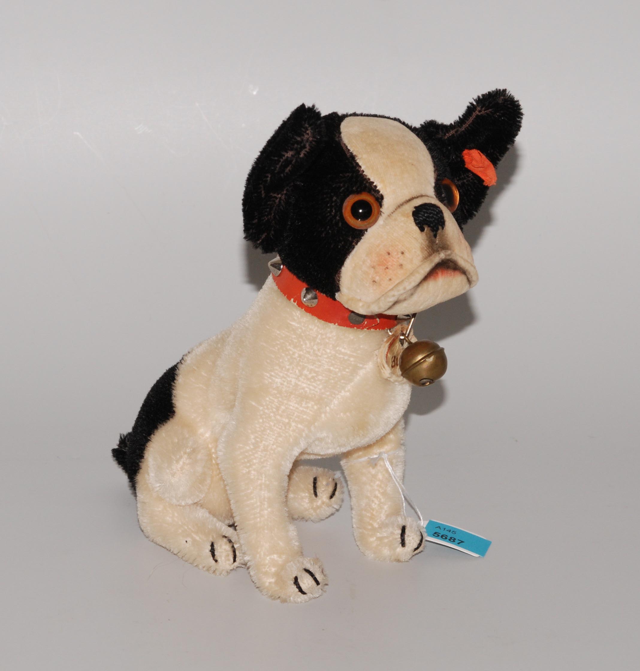 Deutschland, um 1930. Sitzende Bulldogge aus weiss-schwarzem Samt. Mit rotem Lederhalsband und Glöckchen. Mit Knopf und Fahne. Schild beschädigt. H 18 cm.