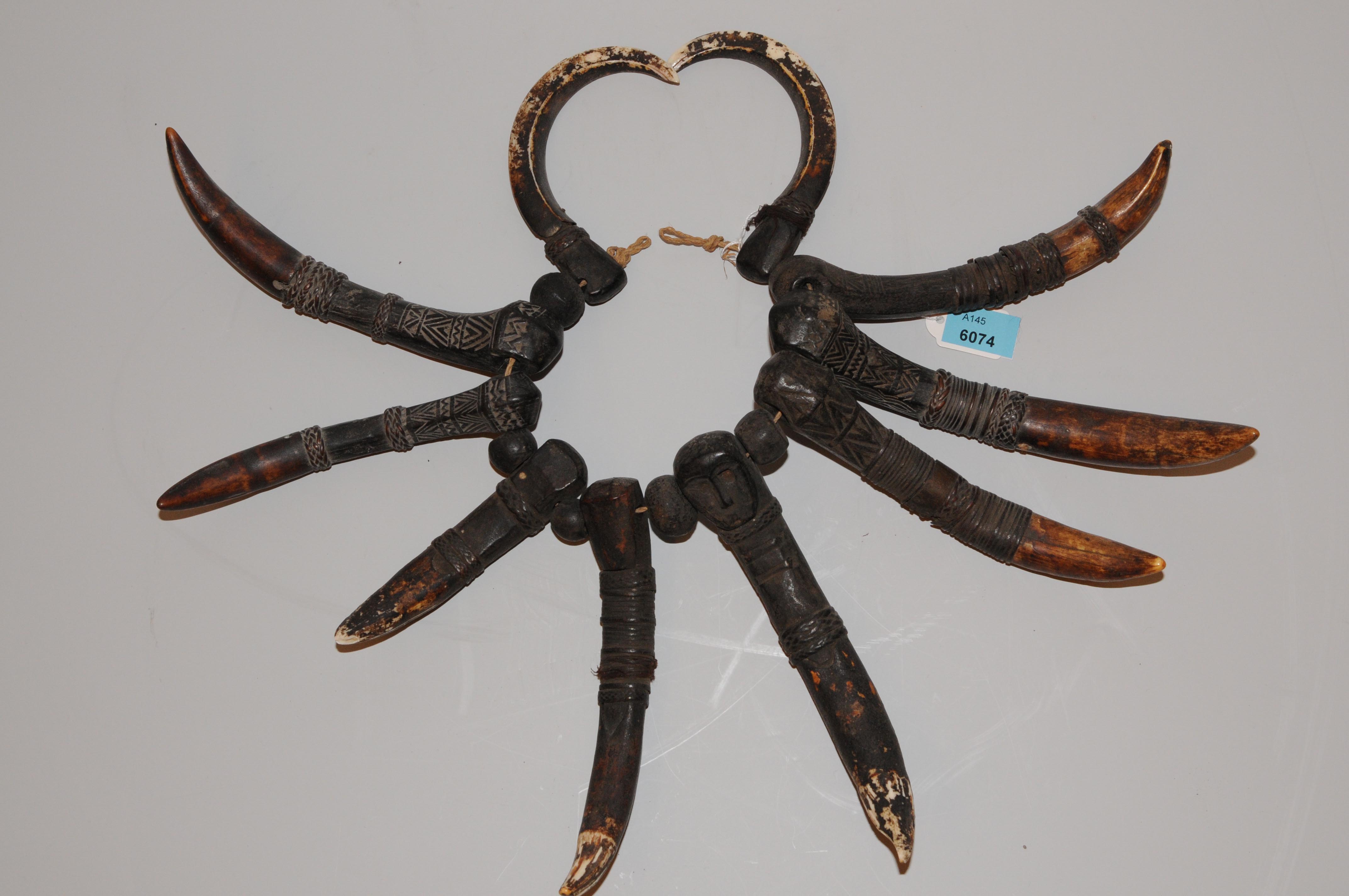 Indonesien, Sulawesi. Männlicher Halsschmuck aus acht Krokodilzähnen und zwei Eberhauern. L 10–17 cm (Zähne).