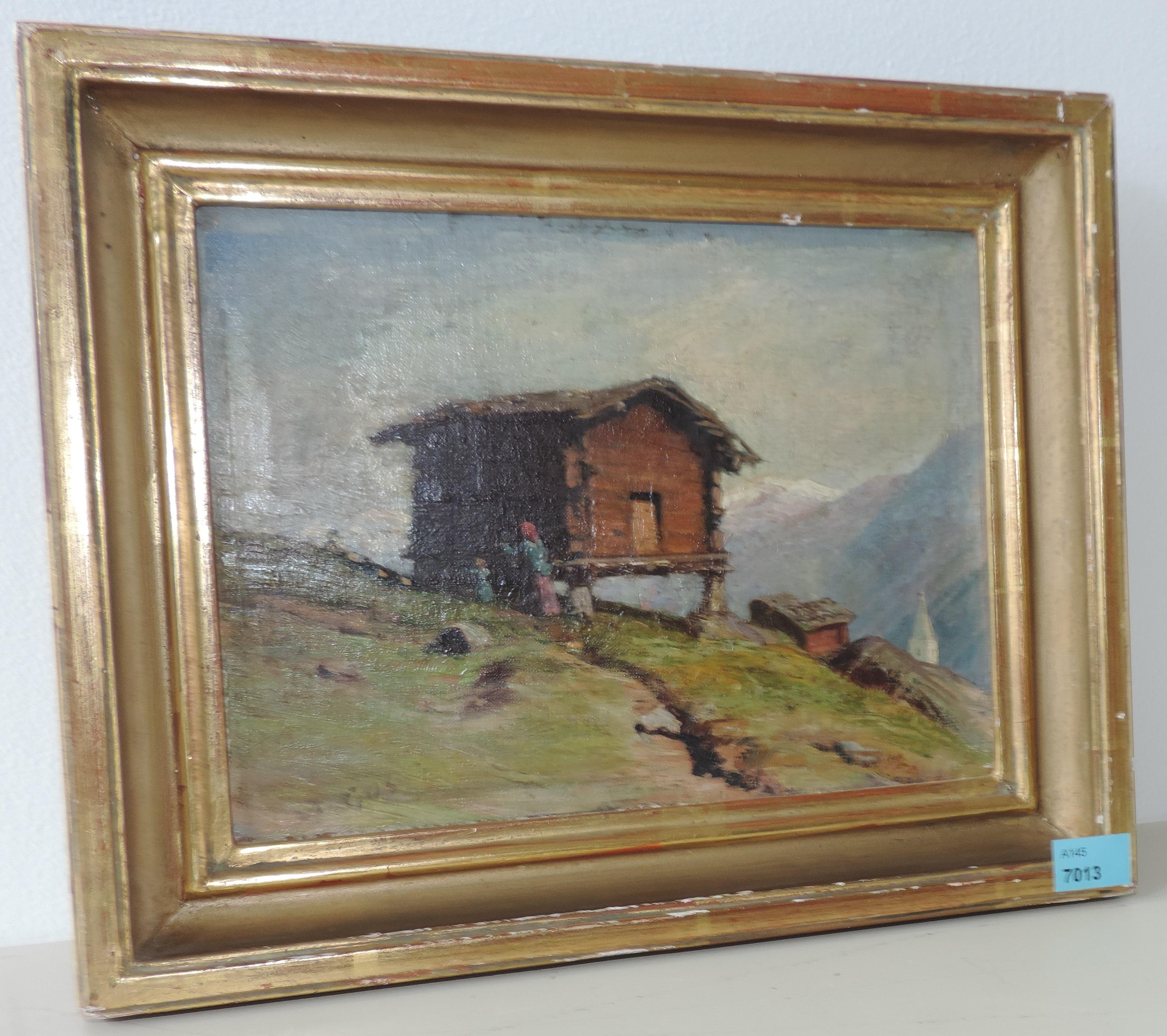 Walliser Gebirgslandschaft mit Speicher. Öl auf Leinwand über Karton. Unten links signiert. 16,5x22,5 cm.