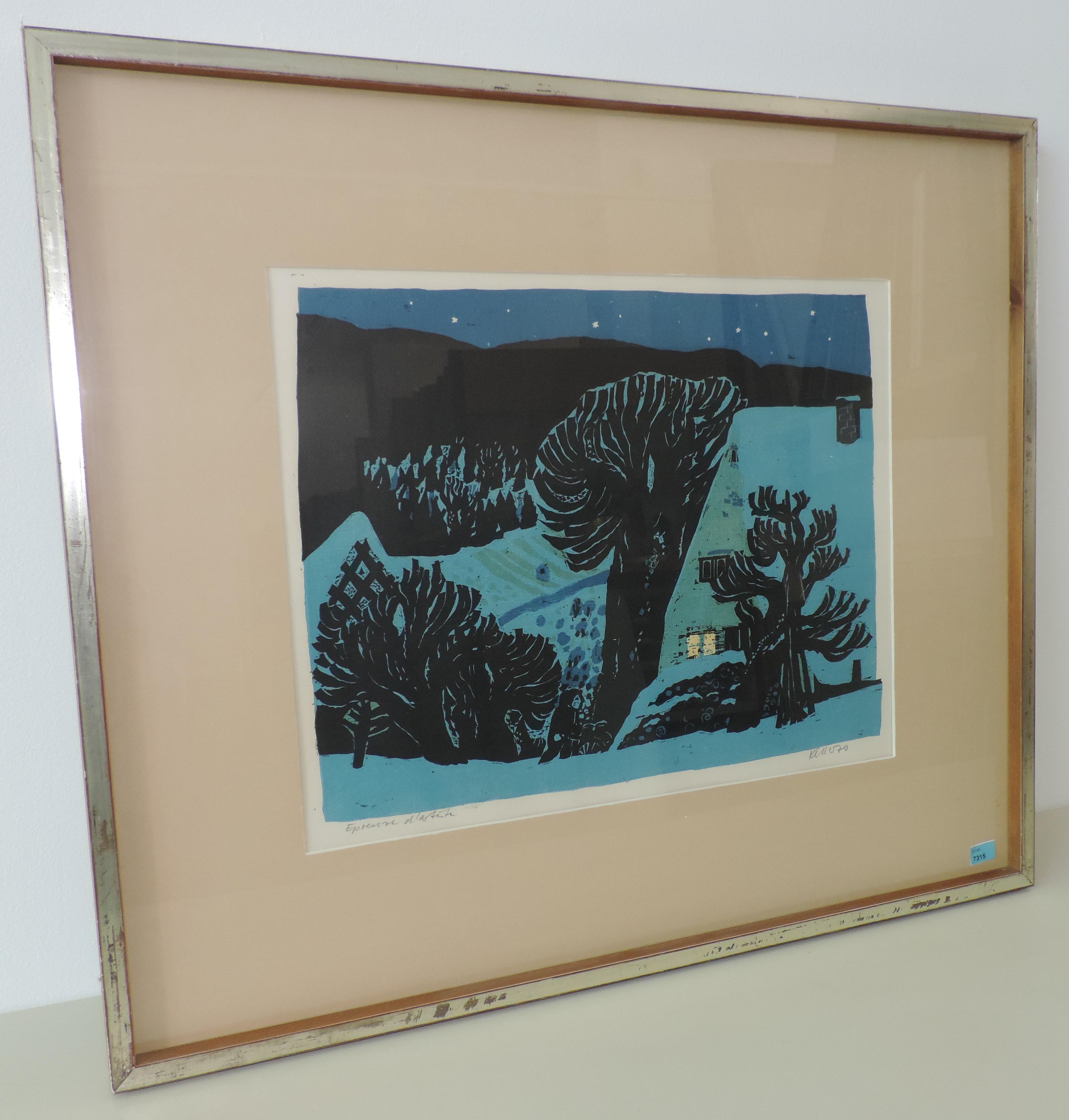 Nächtliche Landschaft. 1970. Farbholzschnitt. Unten rechts signiert und datiert. Lichtmass 35,5x44 cm. Gerahmt.