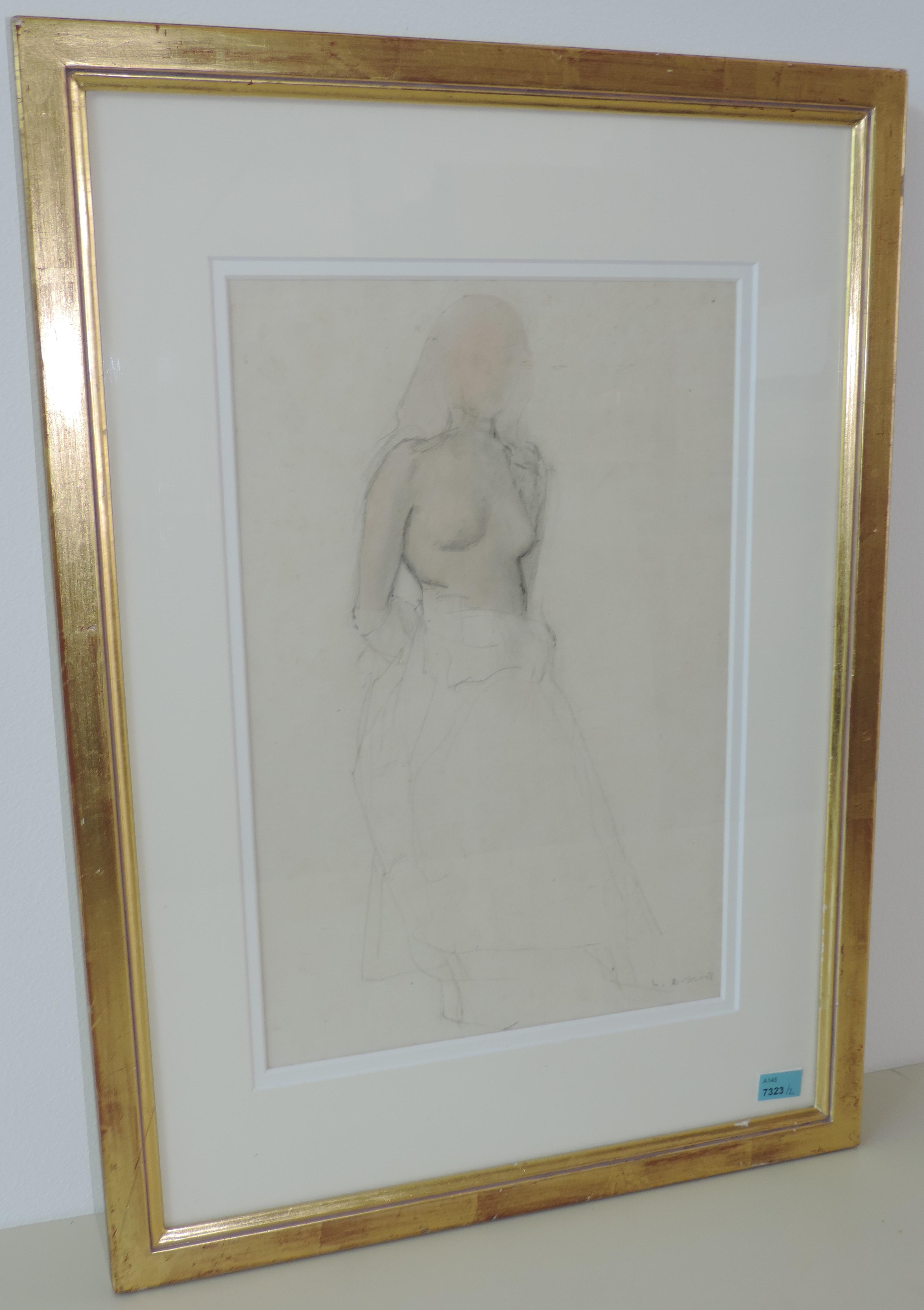Weiblicher Halbakt. Bleistift und Rötel auf Papier. Unten rechts signiert. Lichtmass 34,5x22,8 cm. Gerahmt.