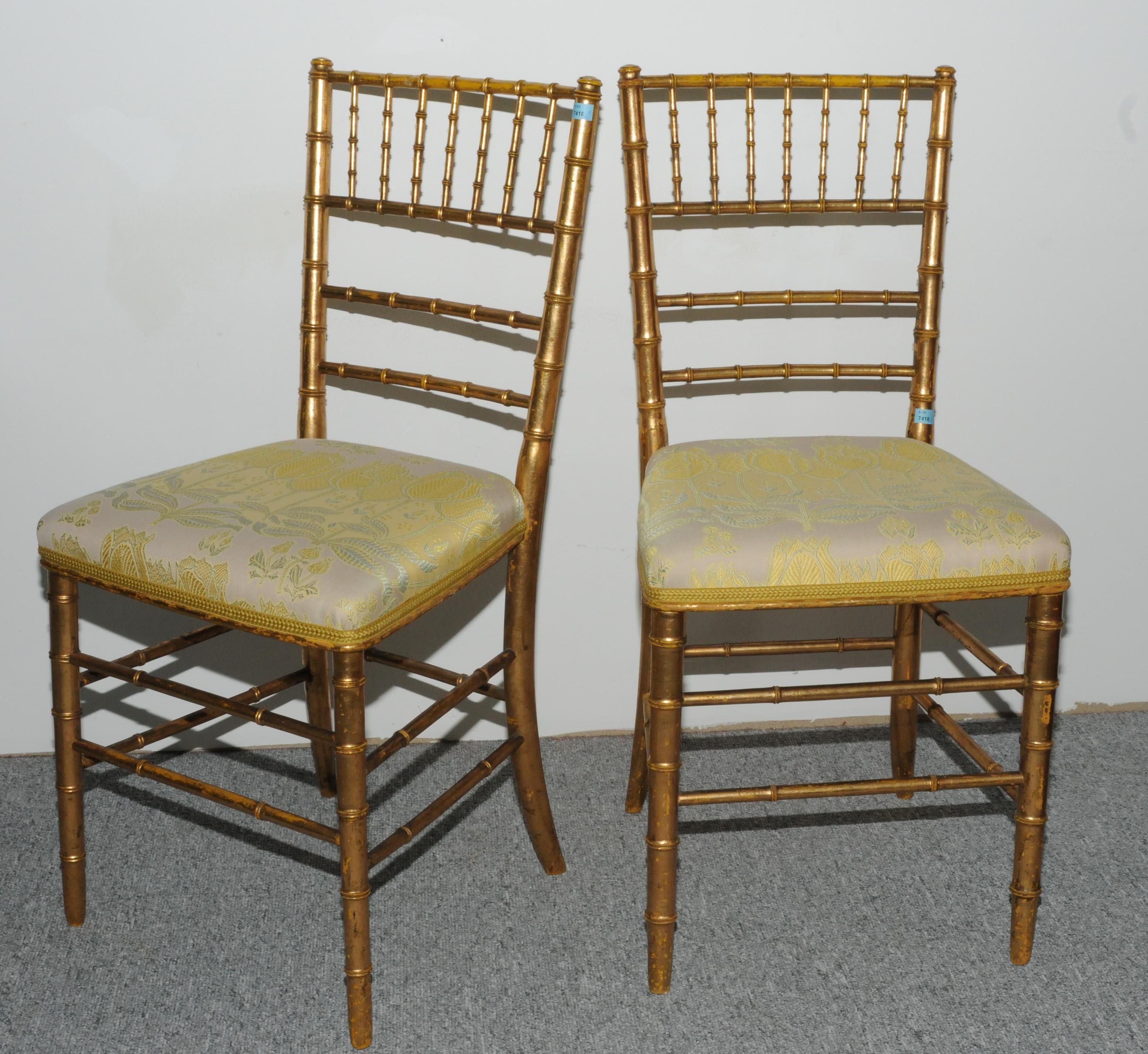 Napoleon III. Trapezförmige gepolsterte Sitzfläche auf goldfarbenen, runden und umseitig verstrebten Beinen mit verstäbelter Rückenlehne. Aufzufrischen. 39x43x83 cm.