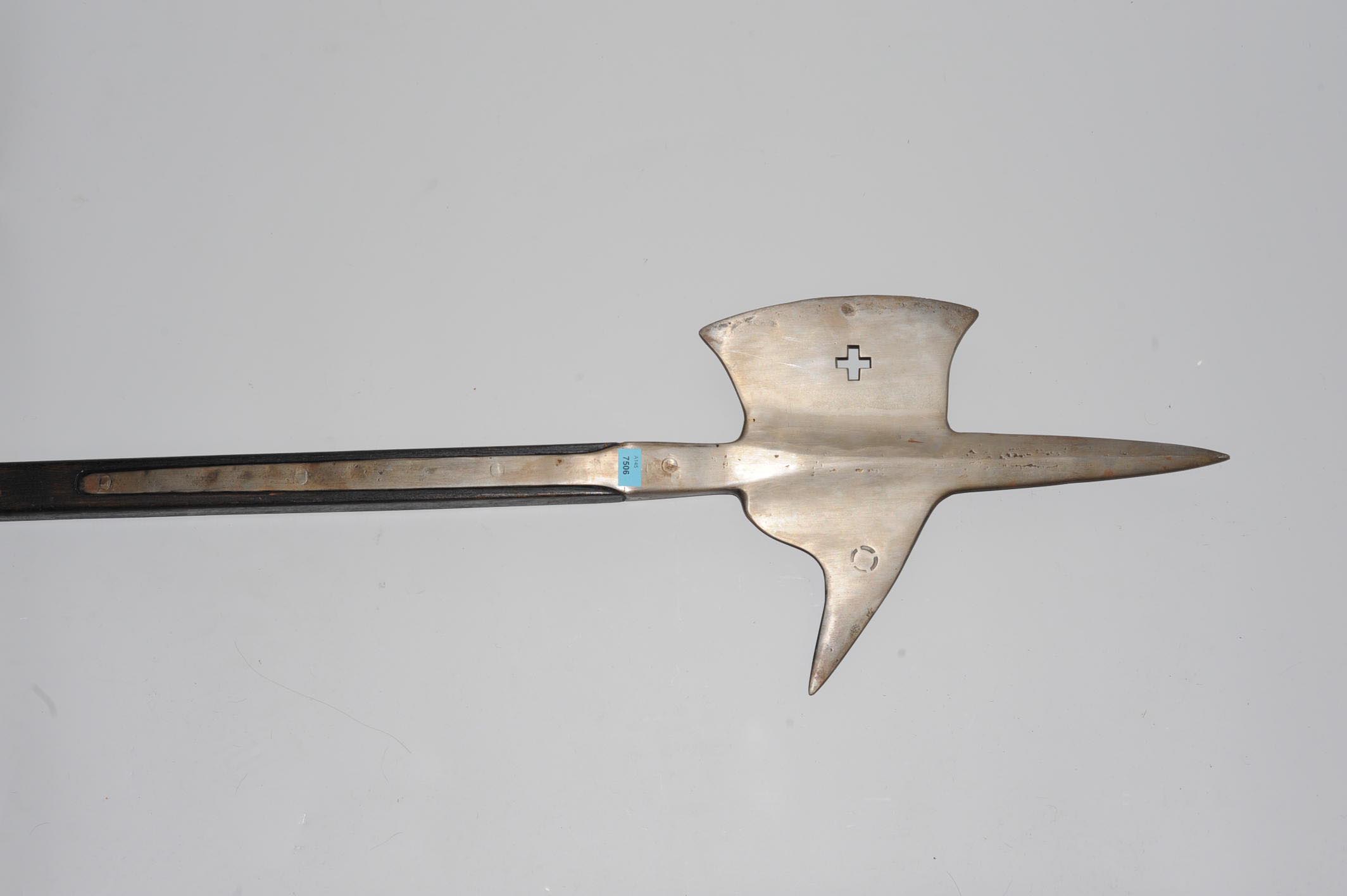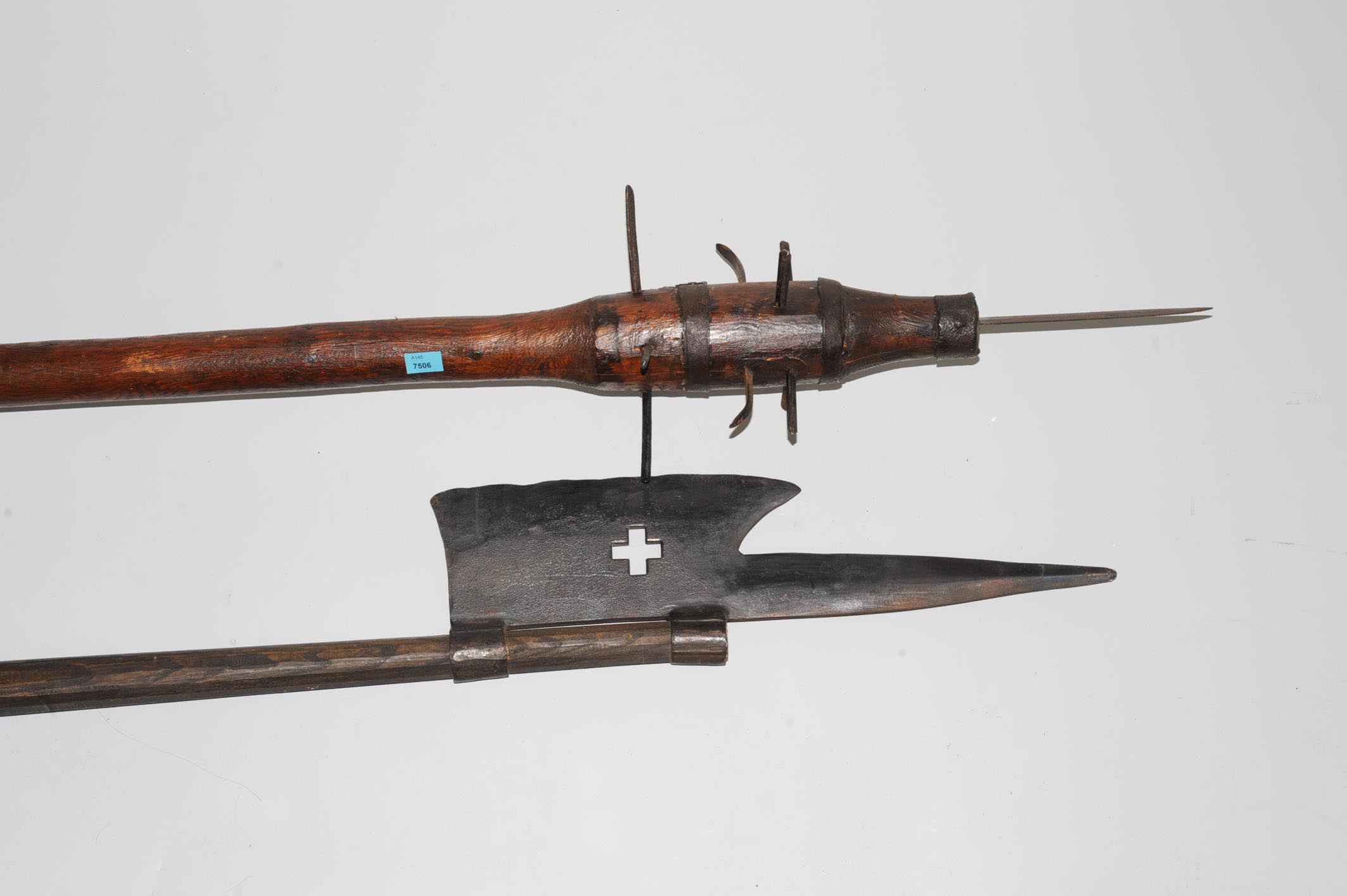 7506. Lot 4 Stangenwaffen in der Art des 16.Jh.: 3 Halbarden mit breiten Federn und Haken, tlw. mit Schweizerkreuz, ein Morgenstern mit zahlreichen Eisendornen. Holzschäfte, L ca. 200-215cm.