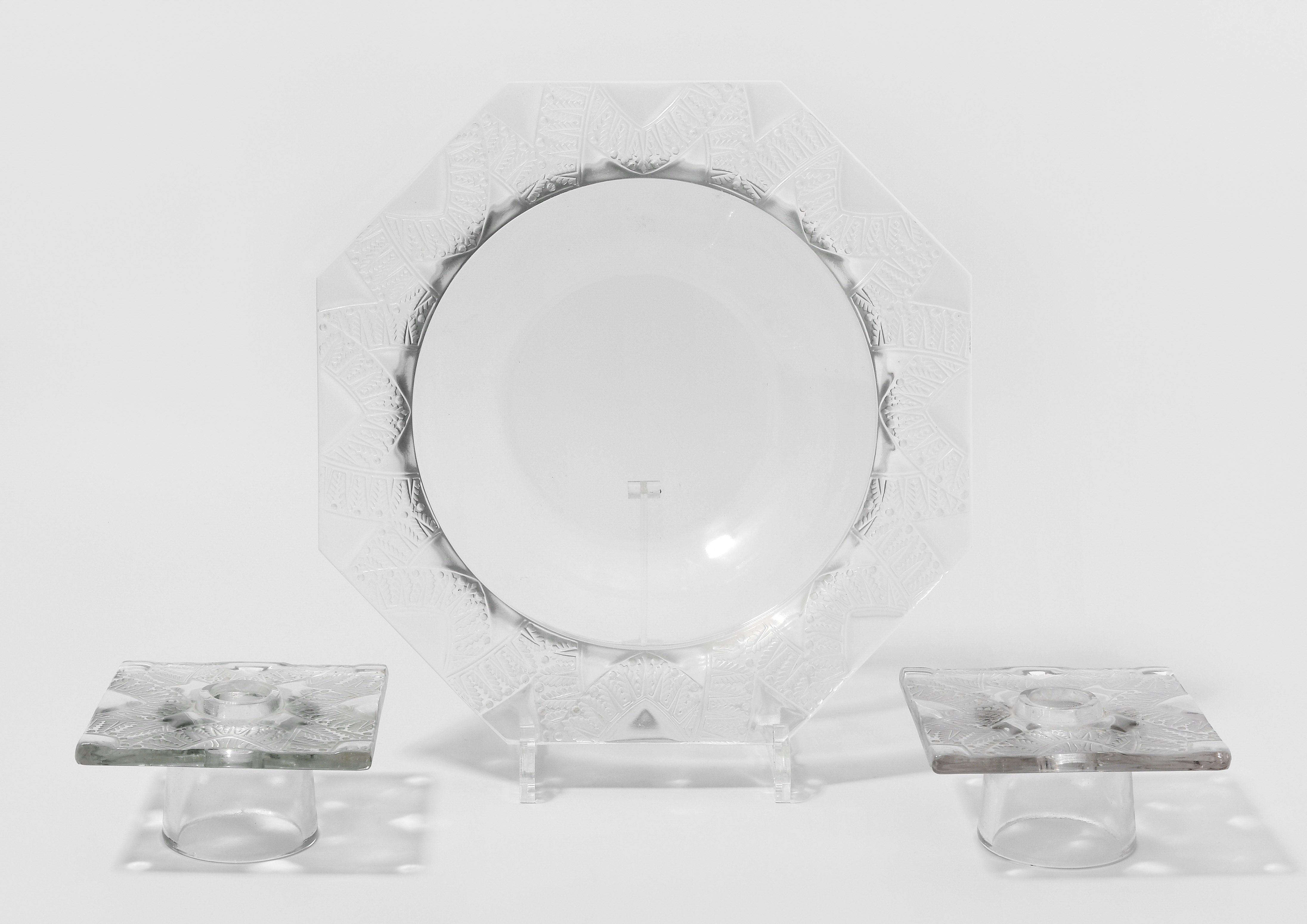82. Schale und 1 Paar Kerzenstöcke, Lalique