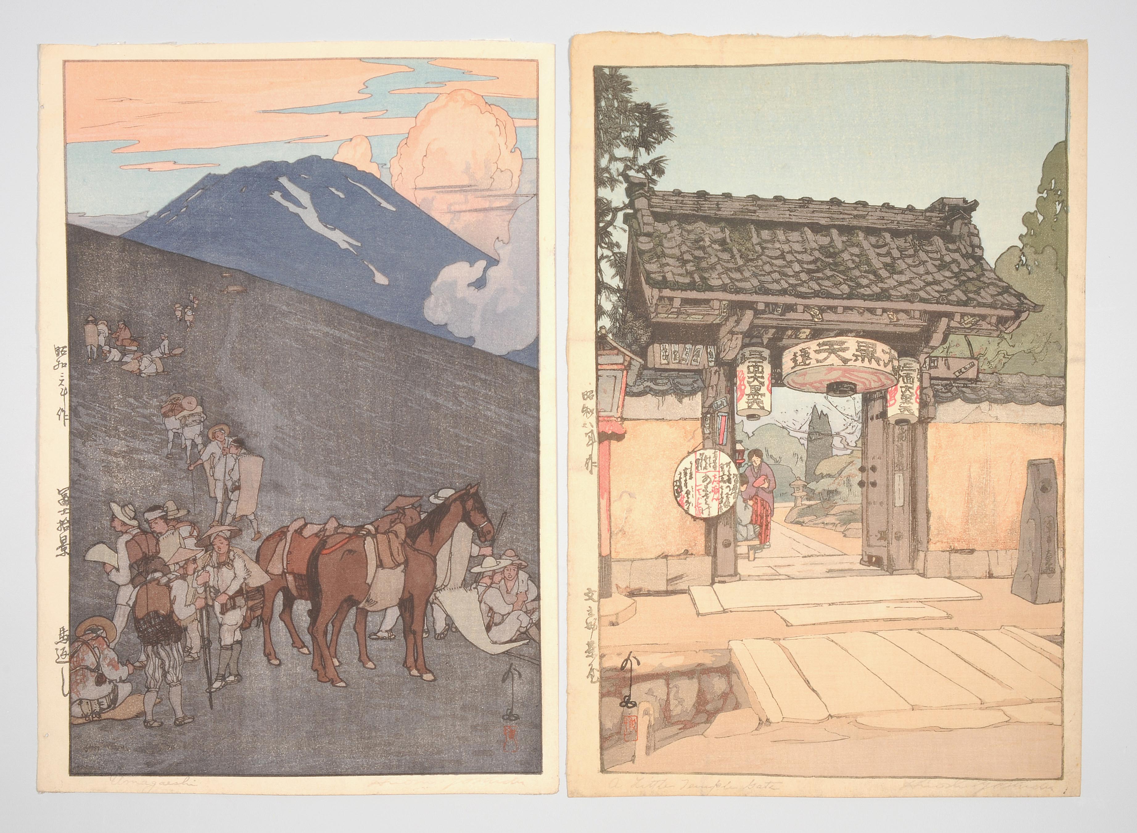 Shinhanga. Links datiert Shôwa 3 (1928) und betitelt " Fuji jûkkei (Zehn Aussichten von Fuji)", "Umagaeshi" (der Punkt, ab dem man das Pferd, mit dem man gekommen ist, heimschicken muss und zu Fuss weitergehen muss). Unten betitelt und signiert, auch in Roma-ji. Leicht vergilbt, Leimspuren. / Links datiert Shôwa 8 (1933) und betitelt "Bunnosukejaya". Unten betitelt "a Littel Tempel Cafe" und signiert. Vergilbt. Je Ôban-Format.