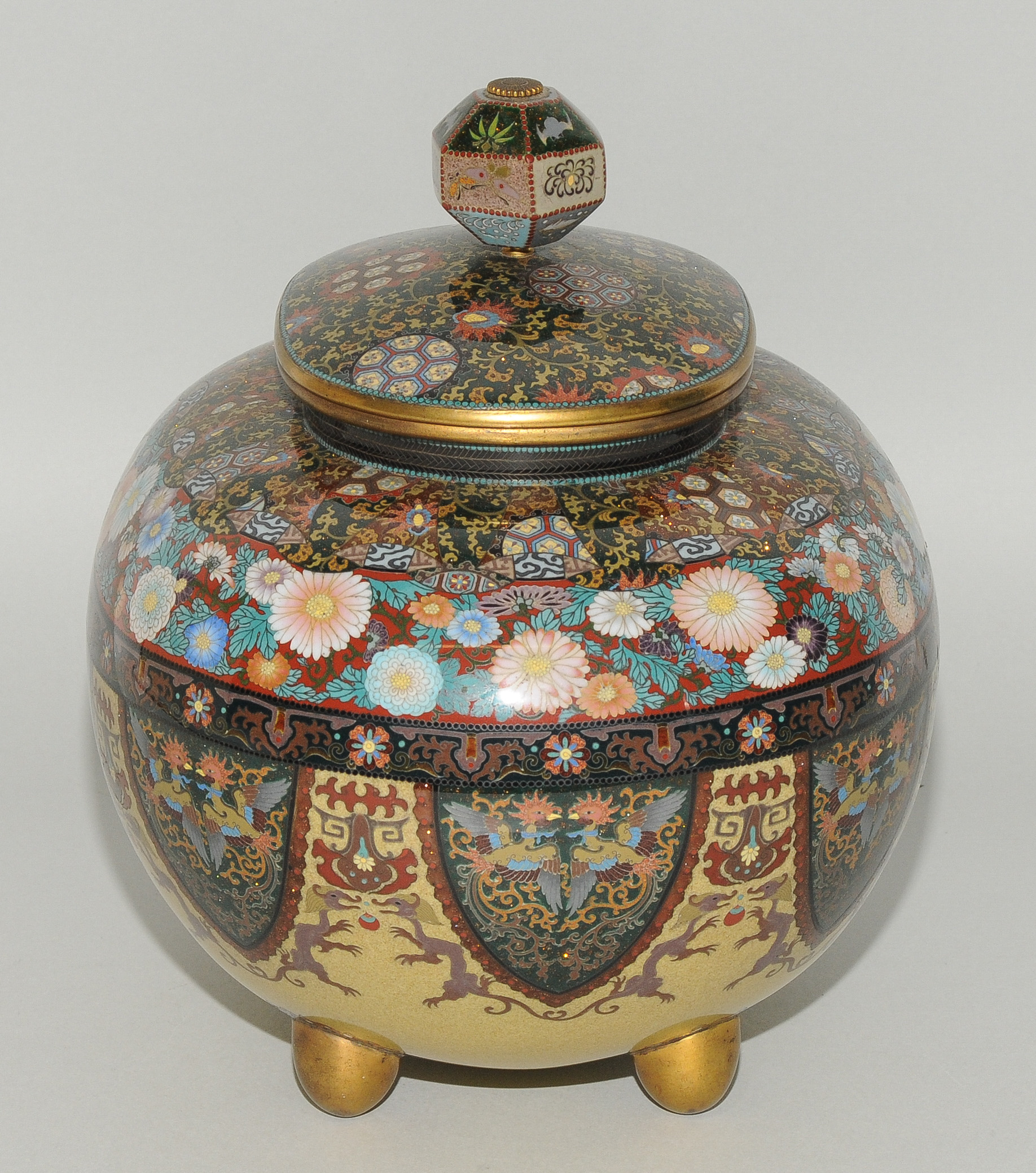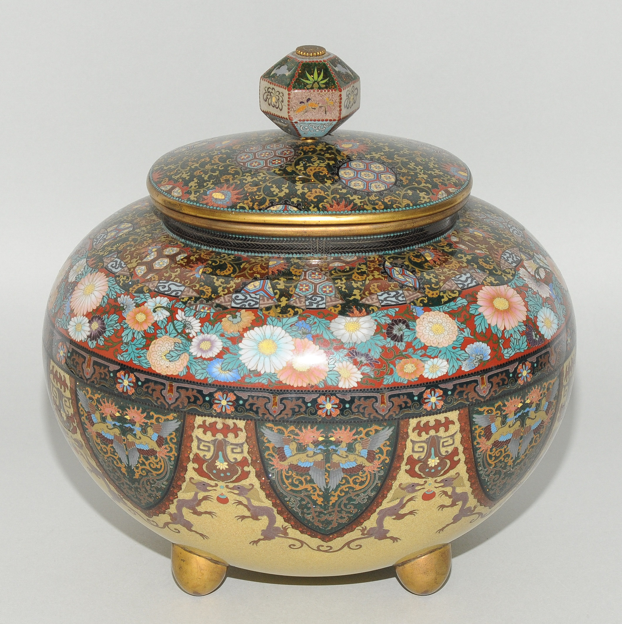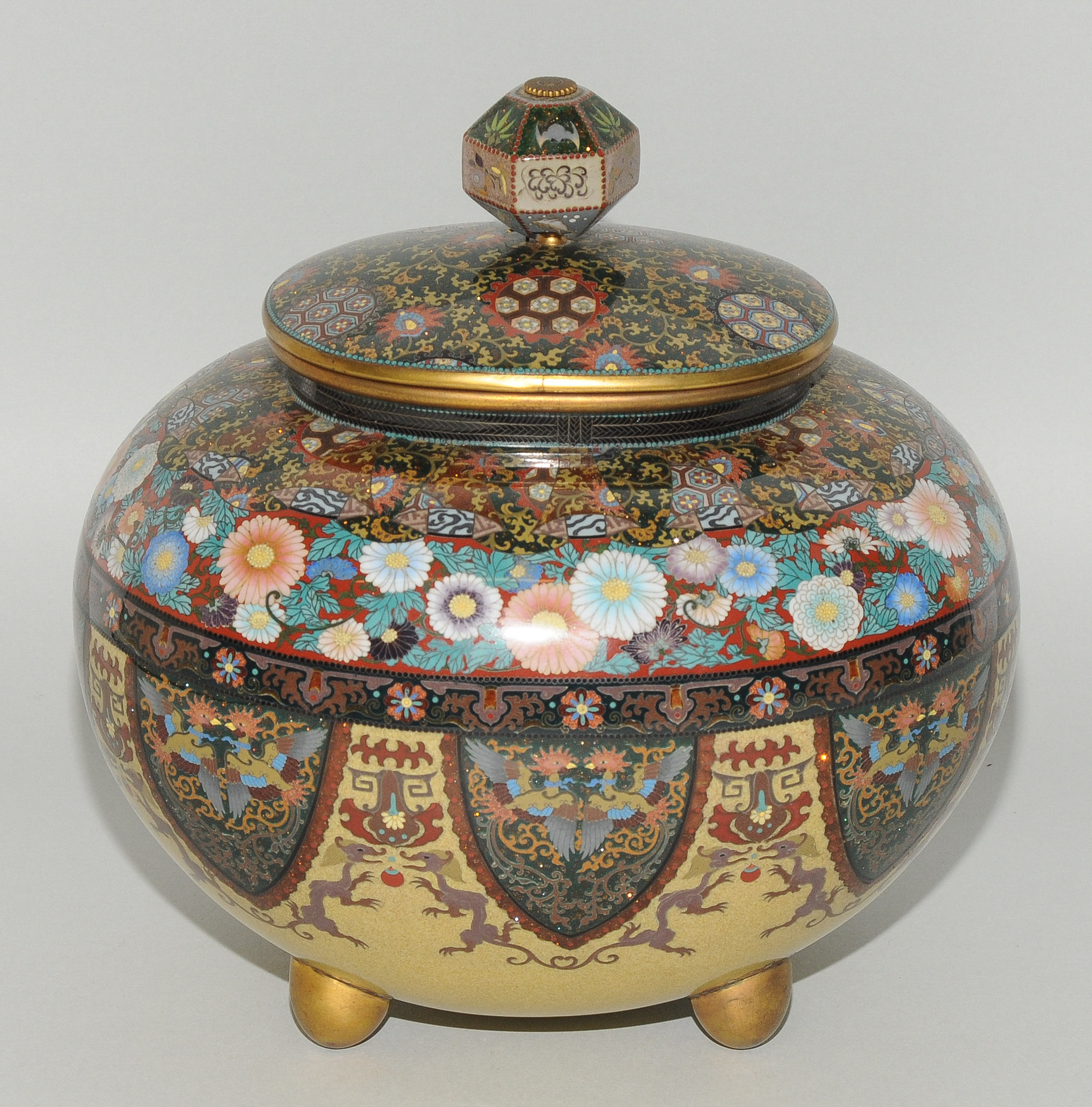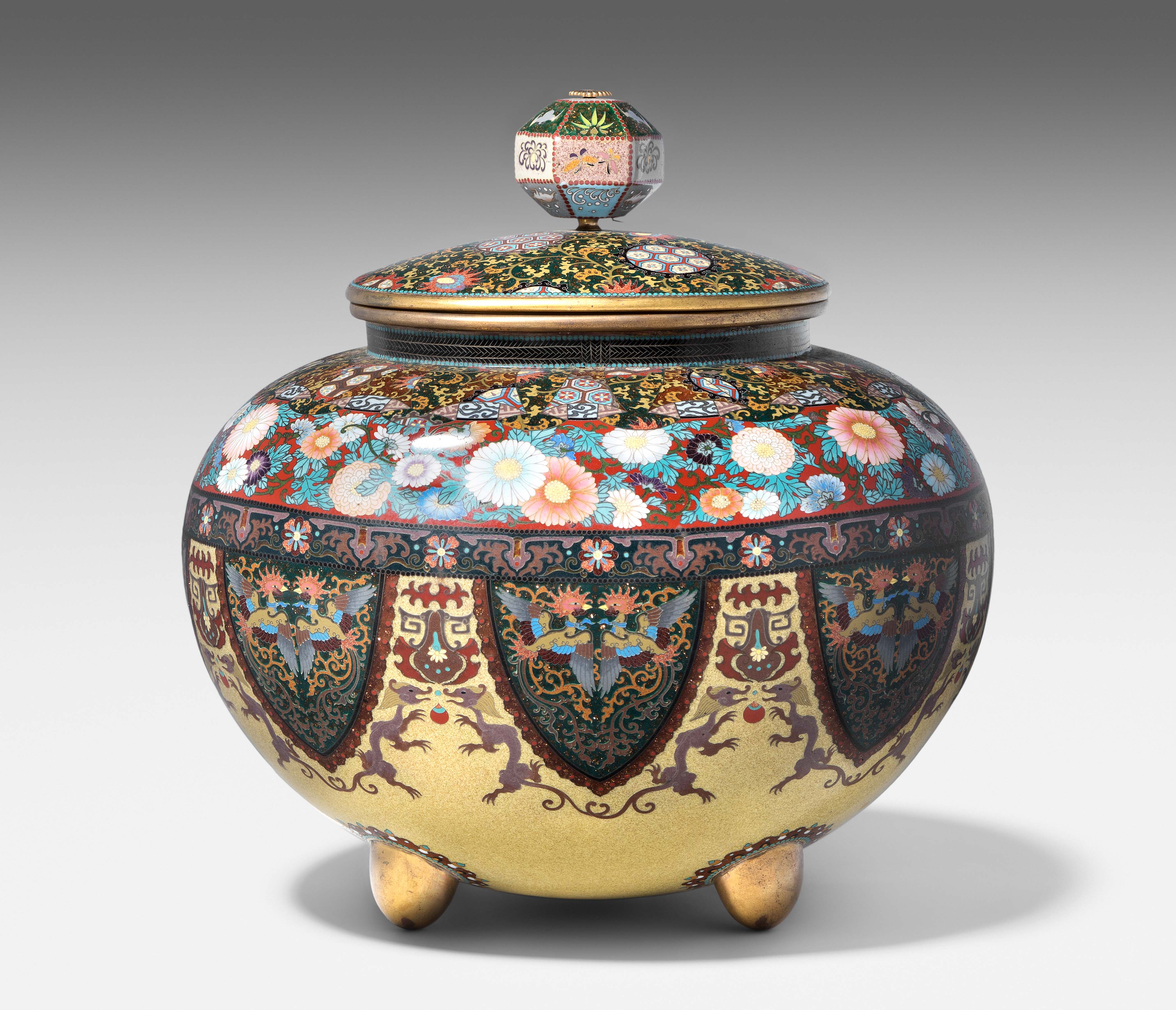 Japan, Meiji-Zeit. Email cloisonné. Räuchergefäss. In der Art von Honda Yasaburo (tätig um 1880). Gedrückte Ovoidform auf vier kugeligen Füssen. Polychromes Email in Silberdraht. Friese mit spiegelsymmetrisch platzierten Drachen und Phönixen in zipfelförmigen Kartuschen. Darüber Chrysanthemen sowie geometrischer Dekor und Blattranken auf stoffartig faltigen Rerserven. Leicht bombierter Deckel verziert mit Perlen des Drachens und Feuer des Phönix auf Karakusa-Motiv. Polygonförmiger Knauf verziert mit Fledermaus, Bambus, Schmetterling und Hasen. Kleine Schadstelle. H 24,5, L 23 cm.