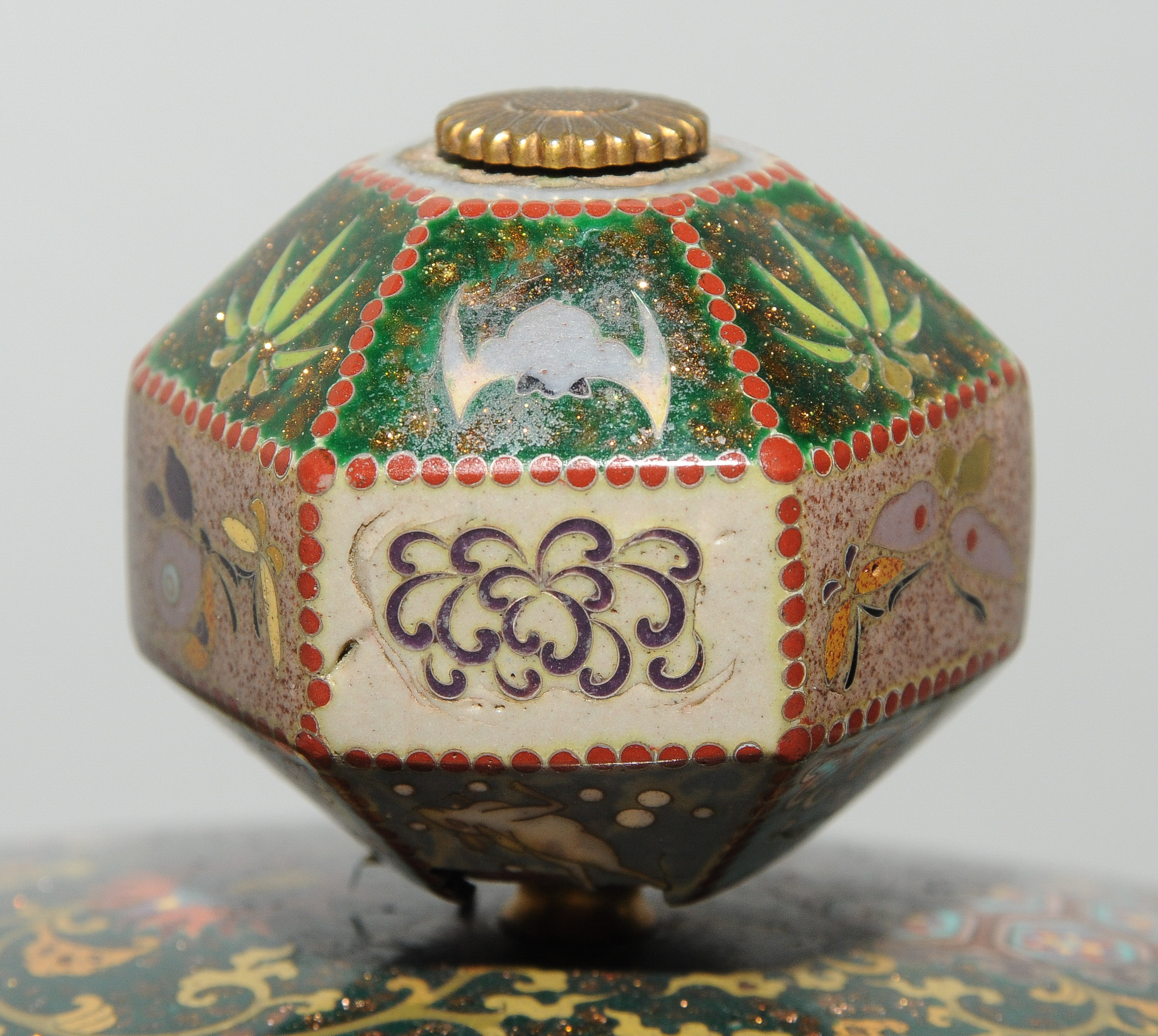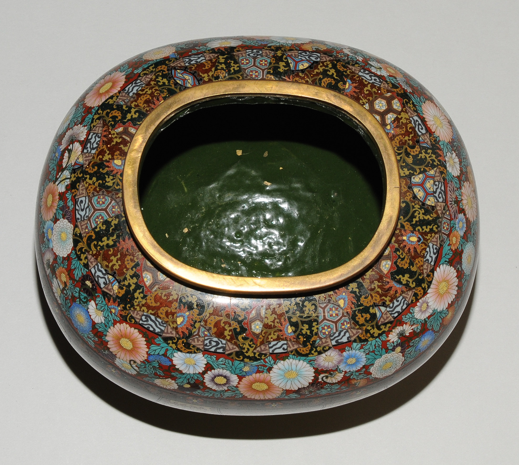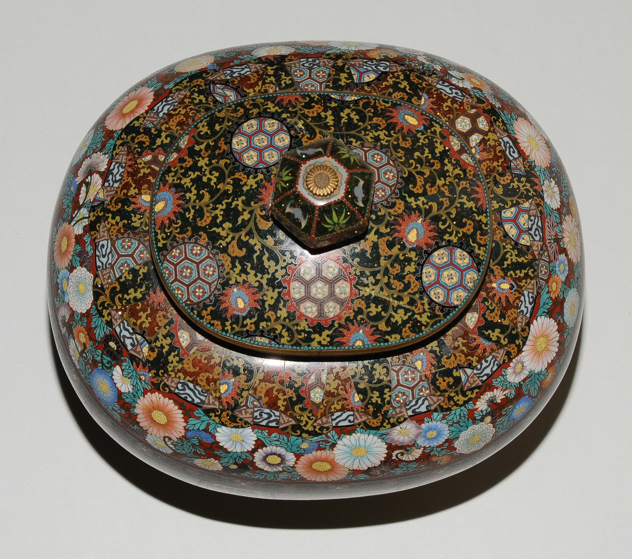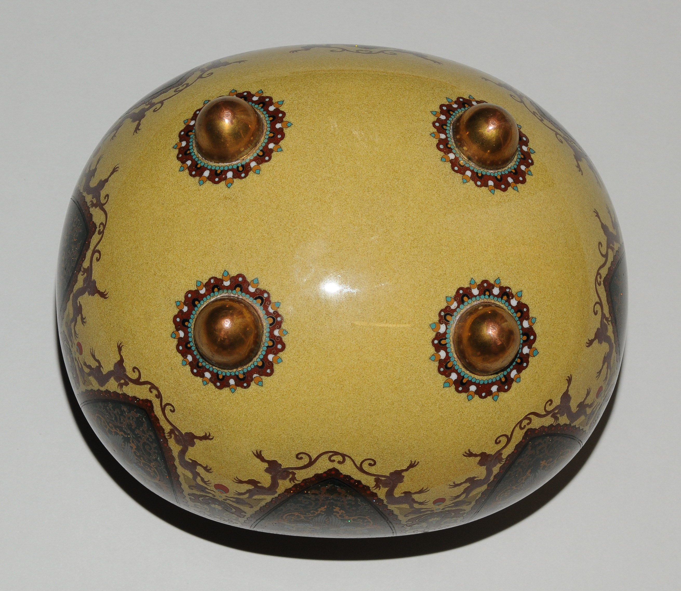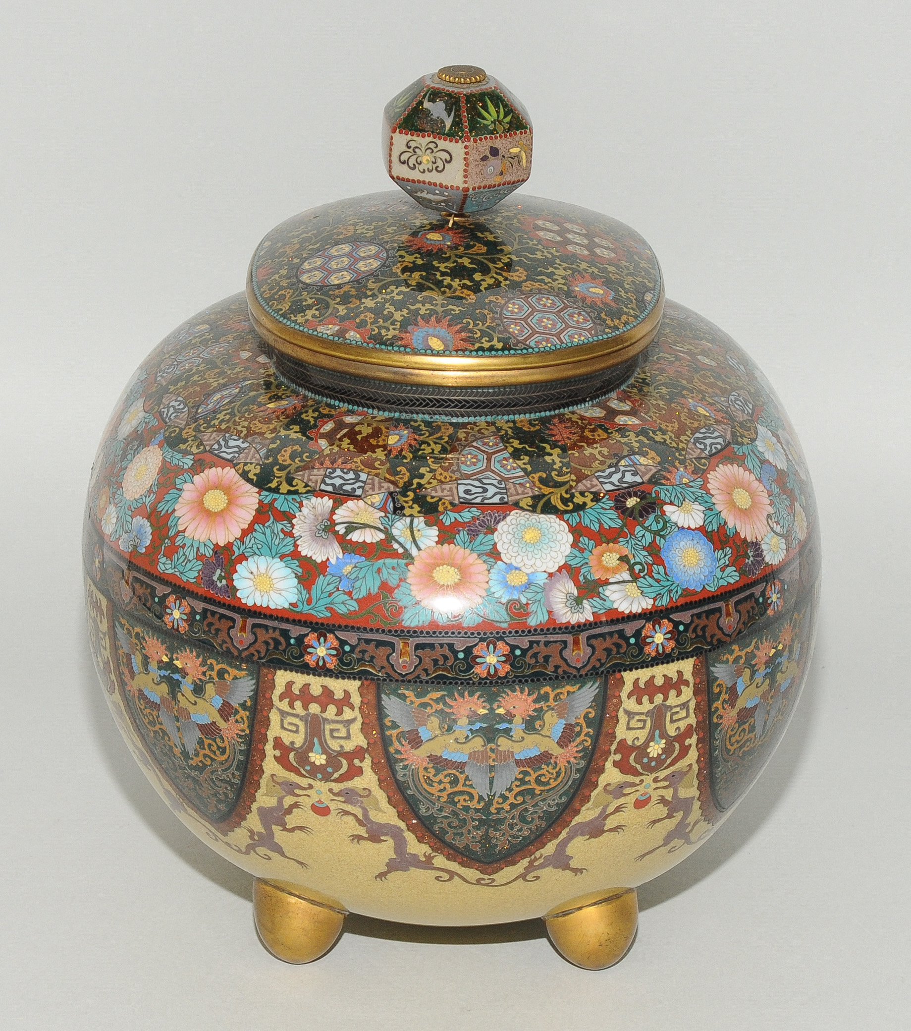 Japan, Meiji-Zeit. Email cloisonné. Räuchergefäss. In der Art von Honda Yasaburo (tätig um 1880). Gedrückte Ovoidform auf vier kugeligen Füssen. Polychromes Email in Silberdraht. Friese mit spiegelsymmetrisch platzierten Drachen und Phönixen in zipfelförmigen Kartuschen. Darüber Chrysanthemen sowie geometrischer Dekor und Blattranken auf stoffartig faltigen Rerserven. Leicht bombierter Deckel verziert mit Perlen des Drachens und Feuer des Phönix auf Karakusa-Motiv. Polygonförmiger Knauf verziert mit Fledermaus, Bambus, Schmetterling und Hasen. Kleine Schadstelle. H 24,5, L 23 cm.