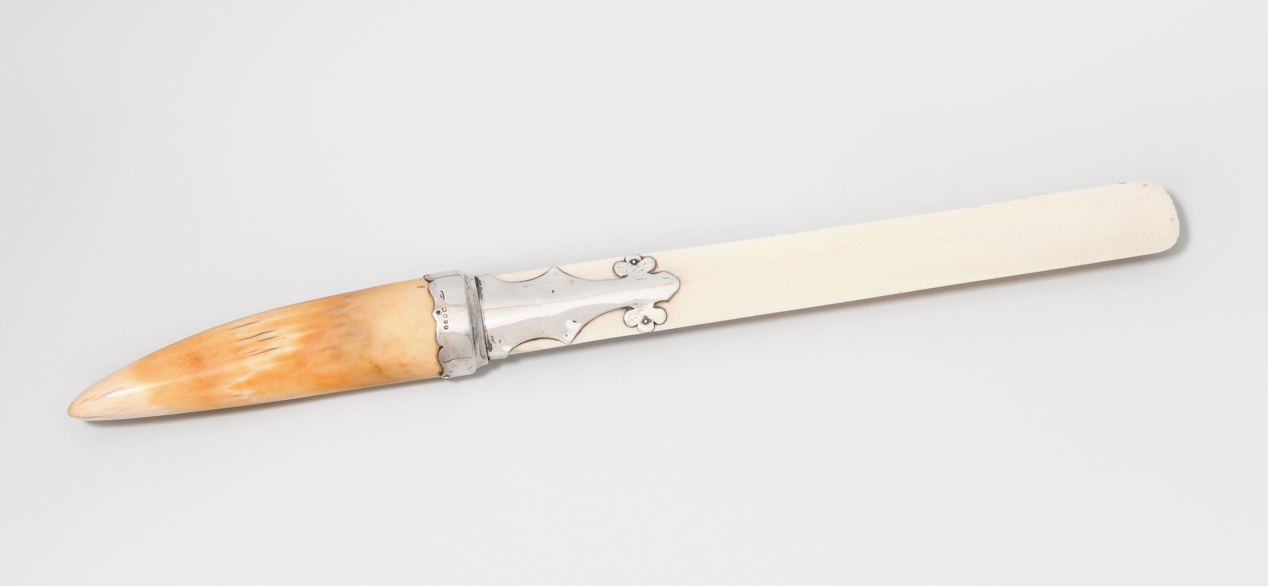 London, 1878. Meistermarke William Frederick Williams. Elfenbein in Silberfassung. Elfenbeinzahn-Spitze als Griff. Gemarkt, Feingehalt 925. L 43 cm.