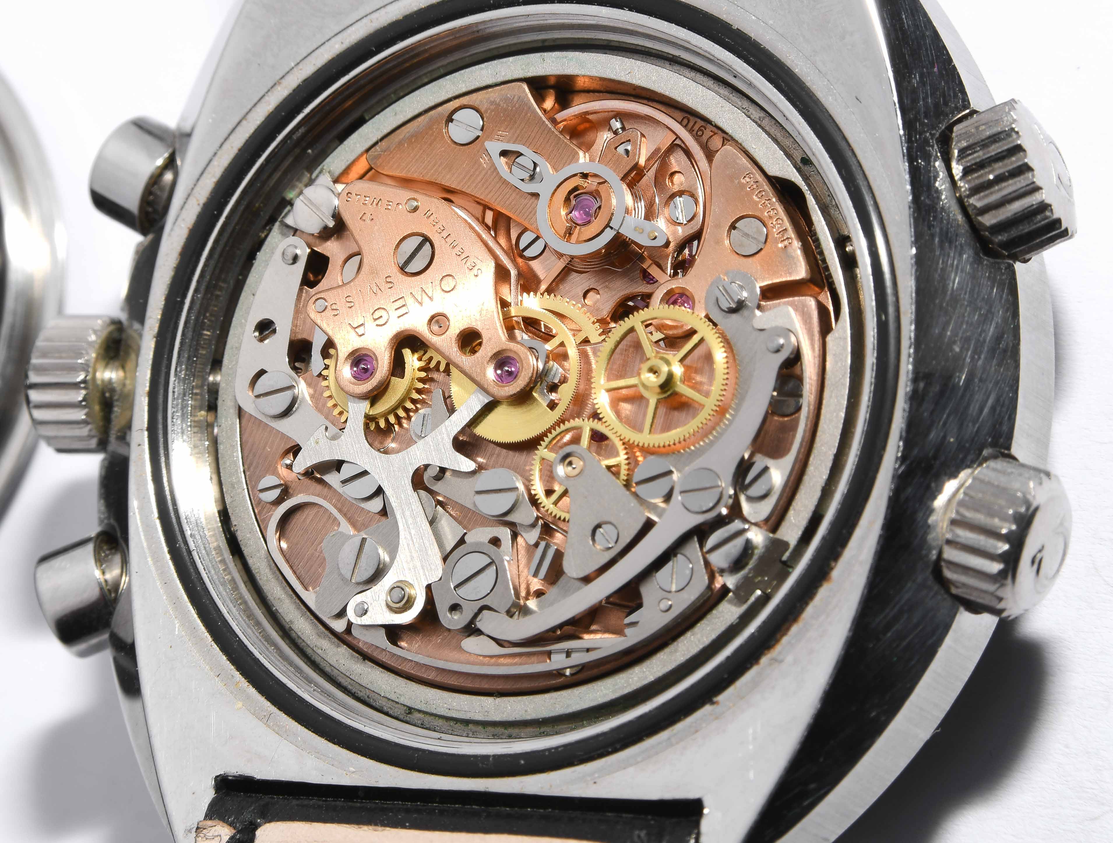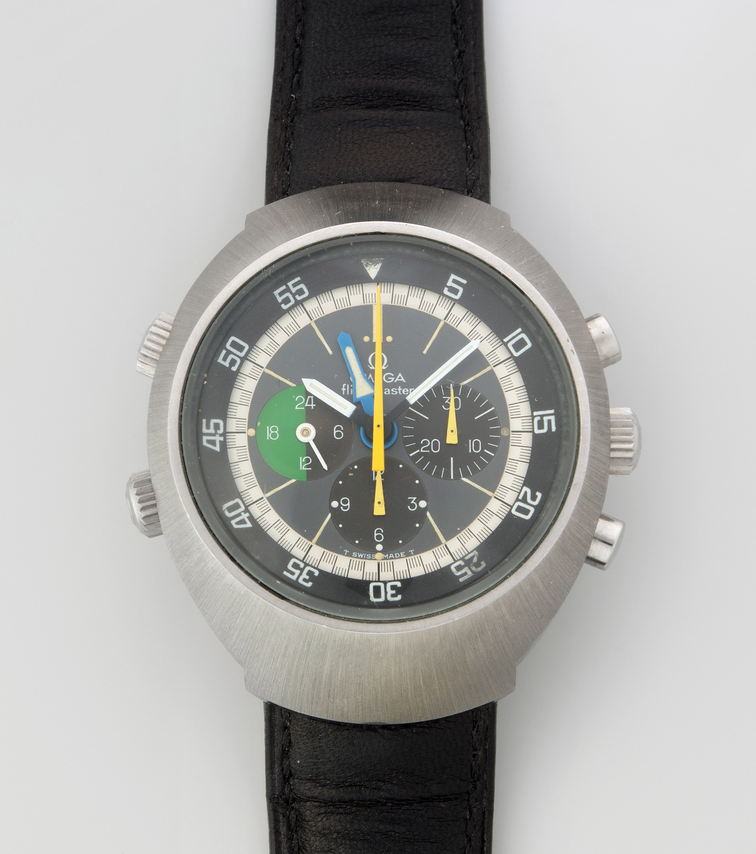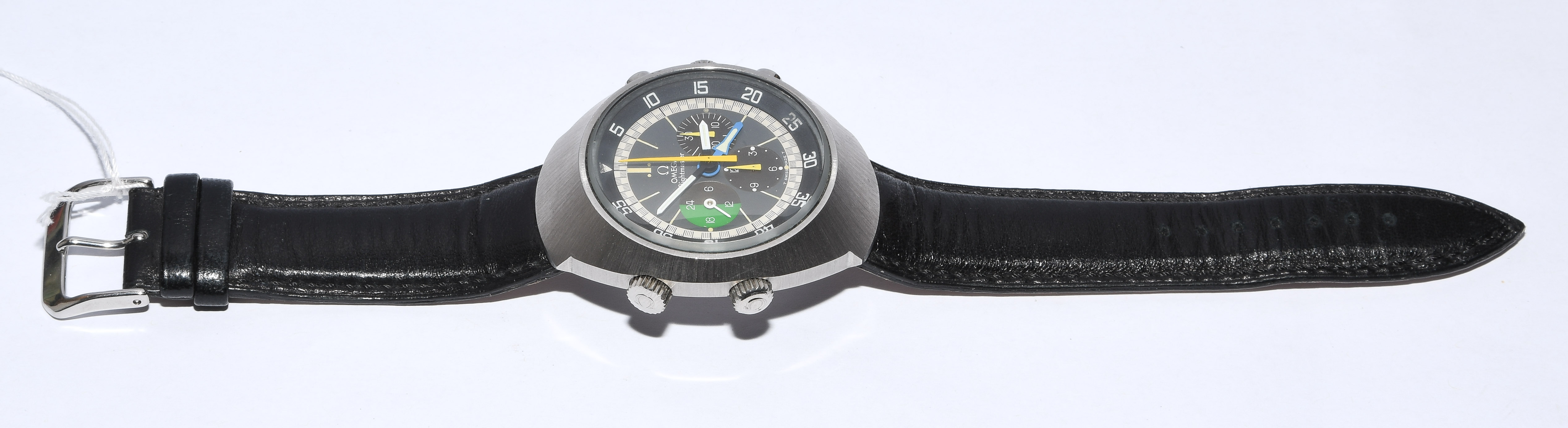 Runder, mechanischer Herrenchronograph 1970 mit Handaufzug in tonneauförmigem Stahlgehäuse. Boden verschraubt, Werknummer 31634048, Kaliber 910, Referenznummer 145.013, D 43 mm. Schwarzes Zifferblatt mit weissen Stundenindizes, schwarze Minuten- Sekundenindizes auf weissem Zifferring, schwarze drehbare Lünette über Krone bei 8 Uhr mit 60er Einteilung. Weisse Stab-Zeiger, zentraler Chronographenzeiger, kleine 30 Minutenanzeige bei 3 Uhr, kleine 12 Stundenanzeige bei 6 Uhr, kleine 24 Stundenanzeige bei 9 Uhr. Krone bei 3 Uhr, Chronographendrücker bei 2 und 4 Uhr. Krone bei 10 Uhr funktioniert nicht. Schwarzes Lederarmband mit Dornschliesse. Gebrauchsspuren.