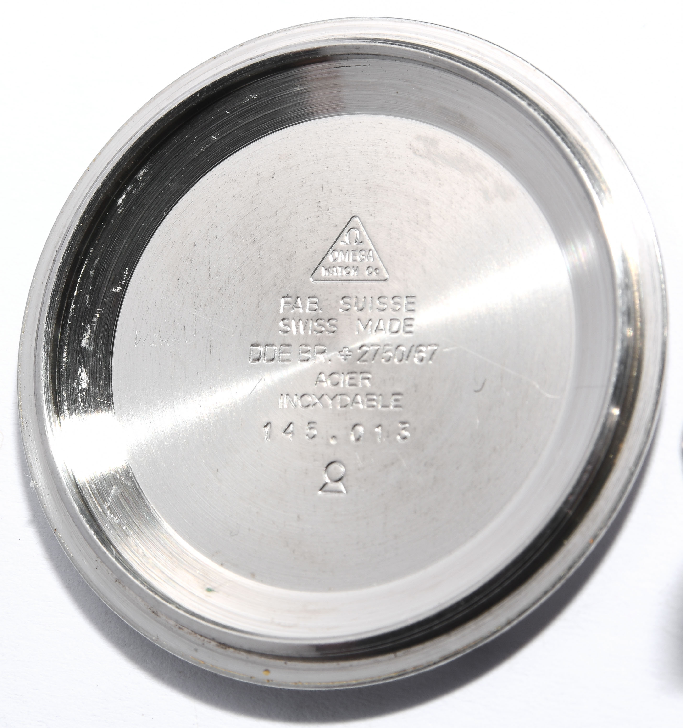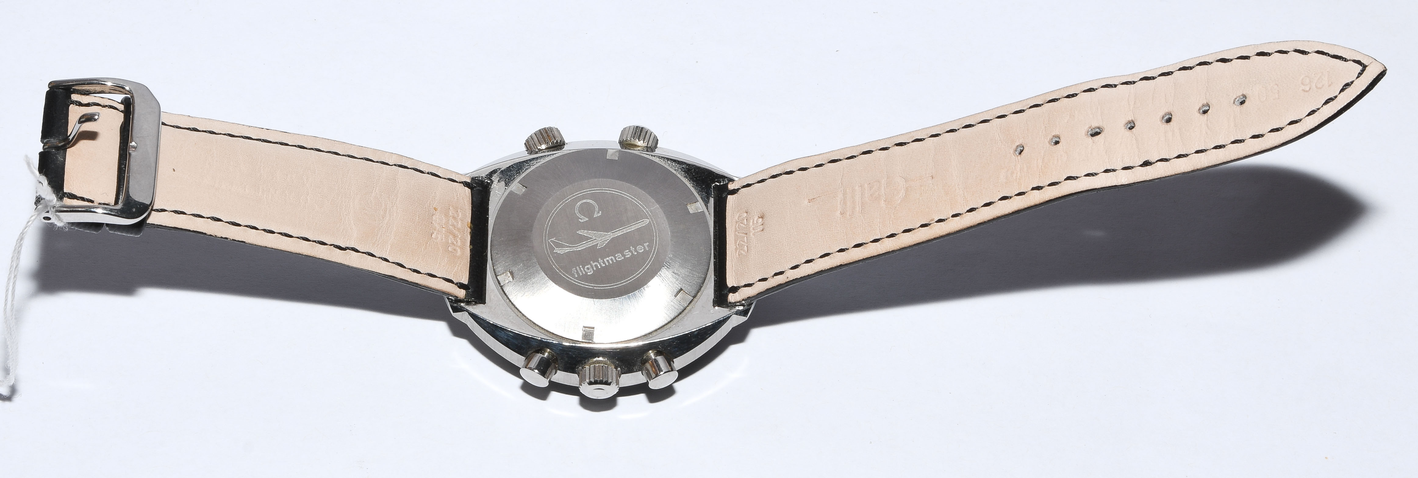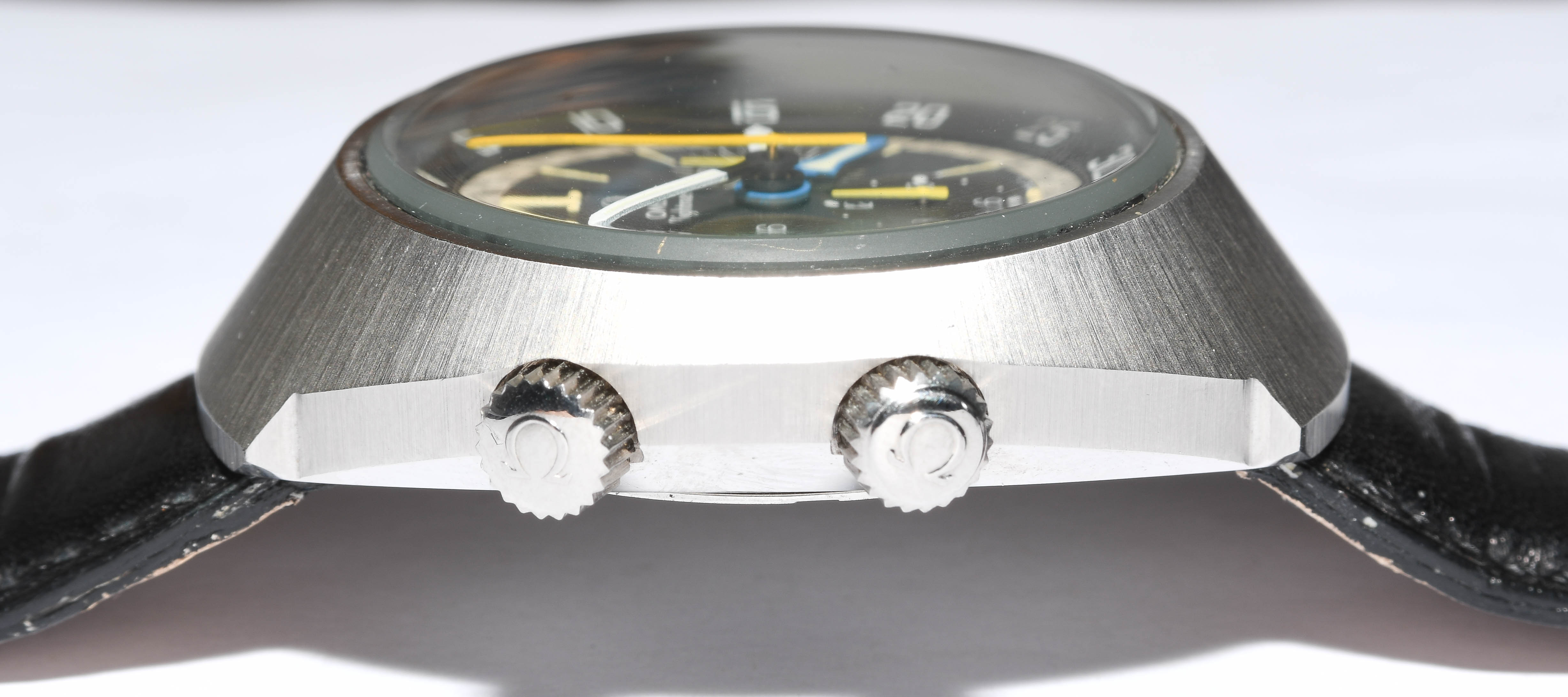 Runder, mechanischer Herrenchronograph 1970 mit Handaufzug in tonneauförmigem Stahlgehäuse. Boden verschraubt, Werknummer 31634048, Kaliber 910, Referenznummer 145.013, D 43 mm. Schwarzes Zifferblatt mit weissen Stundenindizes, schwarze Minuten- Sekundenindizes auf weissem Zifferring, schwarze drehbare Lünette über Krone bei 8 Uhr mit 60er Einteilung. Weisse Stab-Zeiger, zentraler Chronographenzeiger, kleine 30 Minutenanzeige bei 3 Uhr, kleine 12 Stundenanzeige bei 6 Uhr, kleine 24 Stundenanzeige bei 9 Uhr. Krone bei 3 Uhr, Chronographendrücker bei 2 und 4 Uhr. Krone bei 10 Uhr funktioniert nicht. Schwarzes Lederarmband mit Dornschliesse. Gebrauchsspuren.
