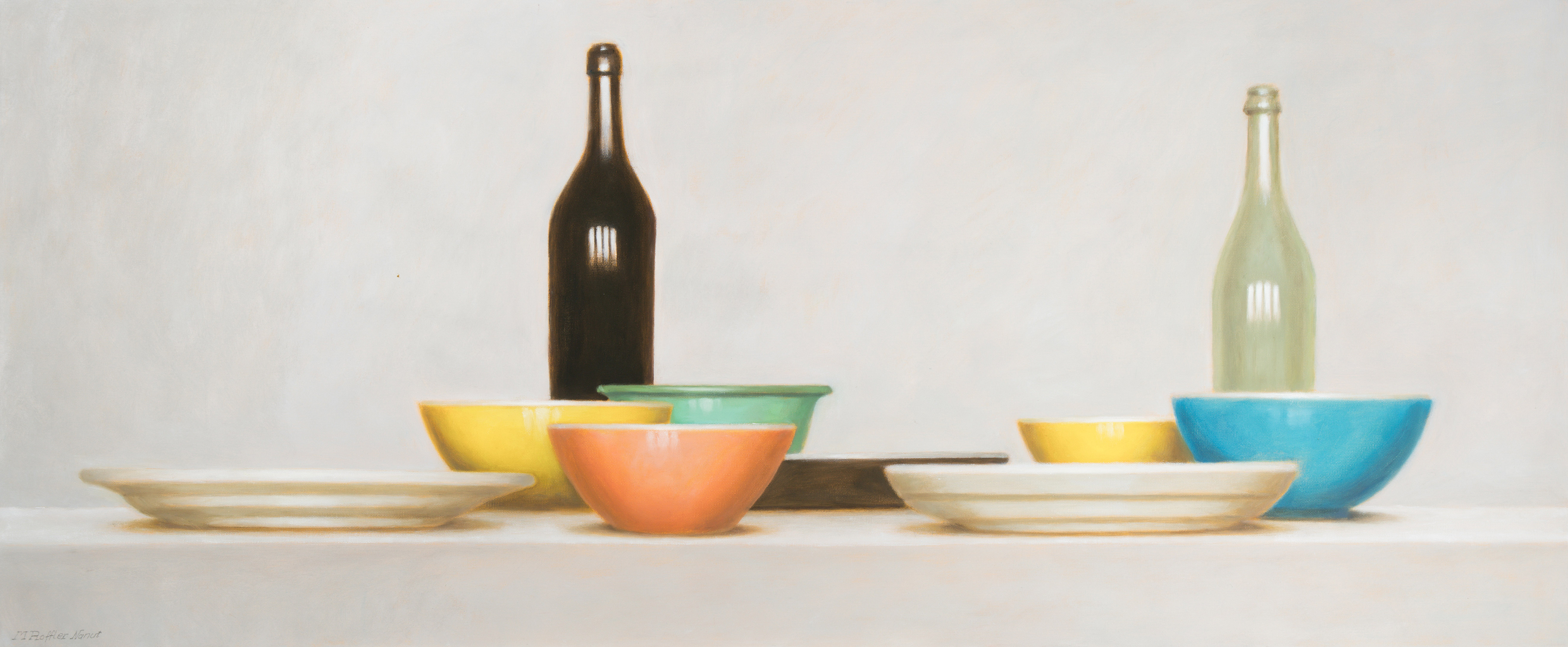 Stillleben mit Porzellan und Glas, um 2015. Öl auf Leinwand. Unten links signiert. 58x140 cm. -Ohne Rahmen.
