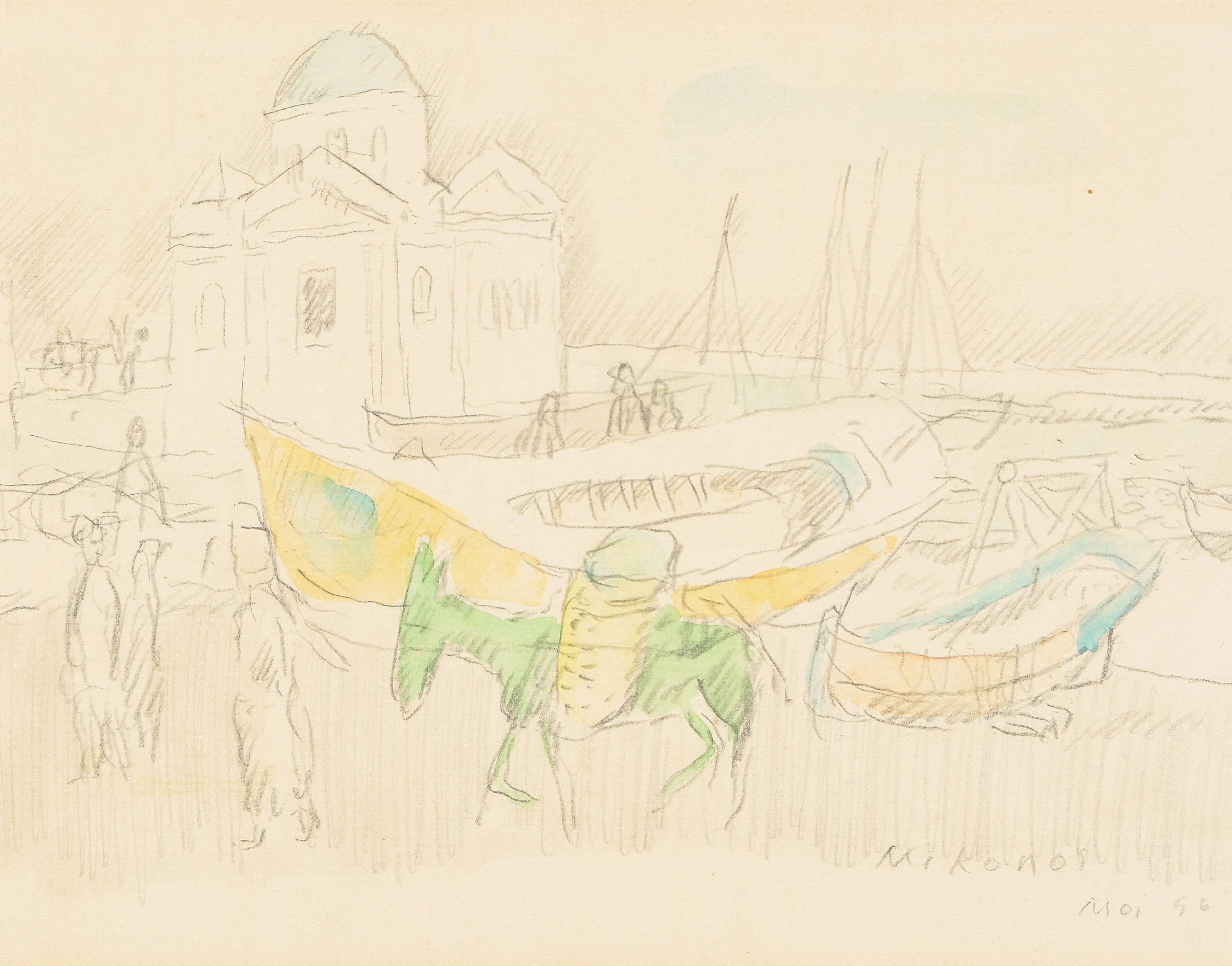 "Mikonos". 1956. Aquarell und Bleistift auf Papier. Unten rechts in Bleistift betitelt, datiert: "Mai 56" und monogrammiert. Blattgrösse 18x26 cm. Gerahmt. -Blatt leicht gebräunt und minimst fleckig. Verso an allen Rändern komplett an Passepartout montiert.