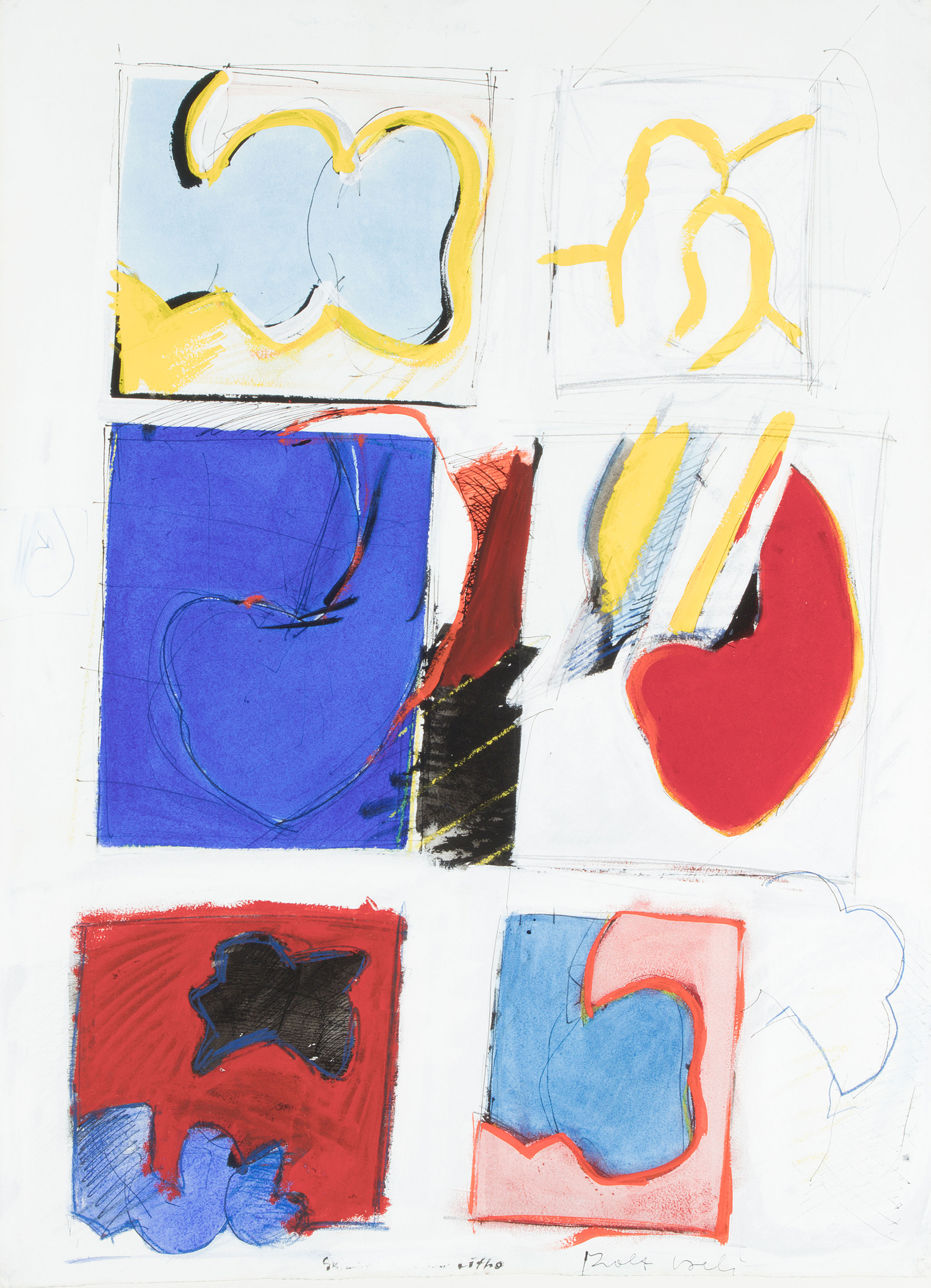 Ohne Titel. Mischtechnik auf Papier. Unten rechts in Tusche signiert. Unten mittig verwischt: „S… Litho“. Blattgrösse 78,7x56,7 cm. Gerahmt. -Blatt leicht gewellt. Leichter Lichtrand. Mehrere, winzige Einstichlöcher in den Ecken und Rändern.