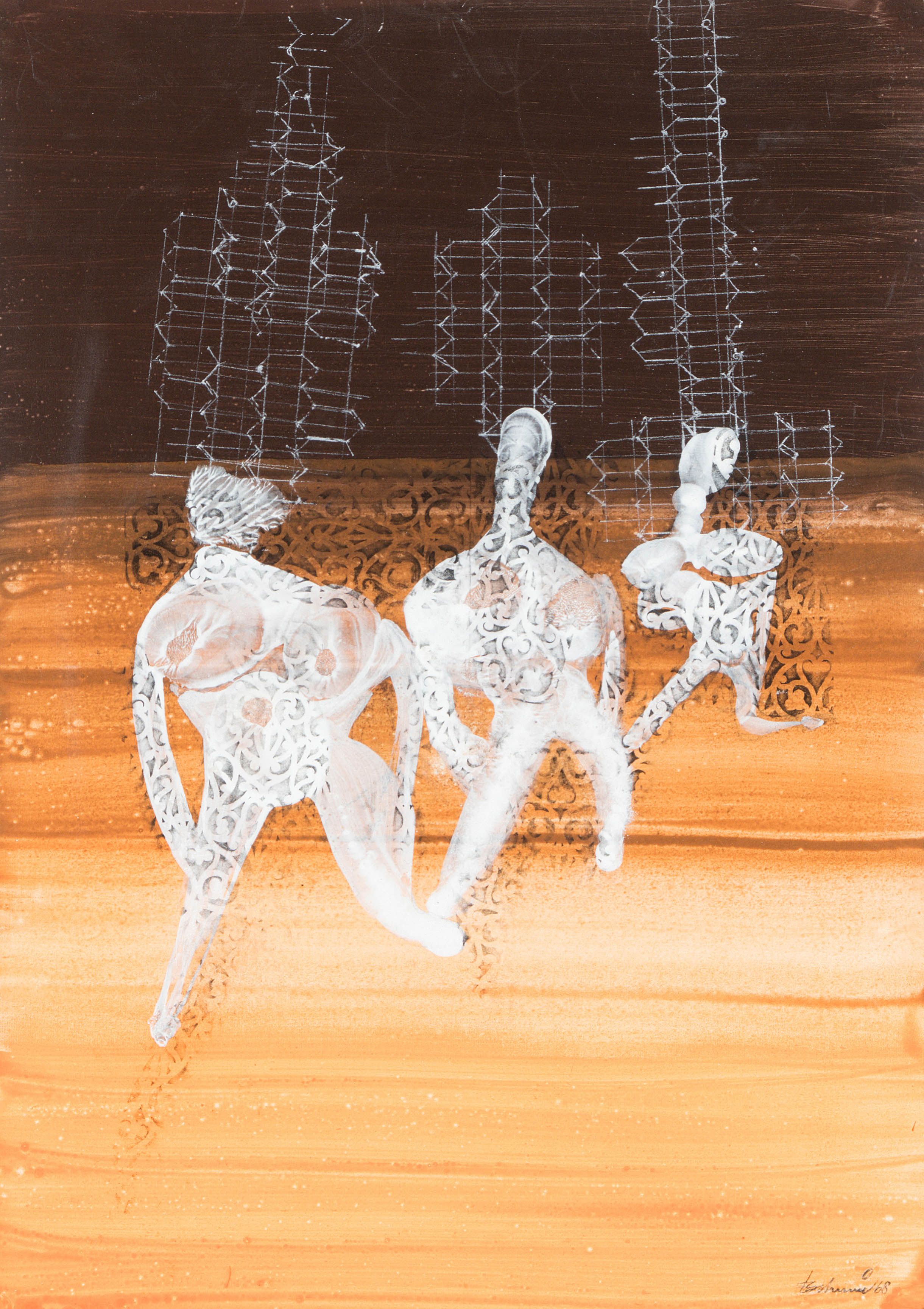"Verschleierte". 1968. Tempera auf Karton. Unten rechts signiert und datiert. Verso signiert, datiert, betitelt und mit Widmung. Kartongrösse 41x28,8 cm. Gerahmt. -Ränder und Ecken bestossen. In den Ecken winzige Einstichlöcher. Verso partiell an Rückblatt montiert.