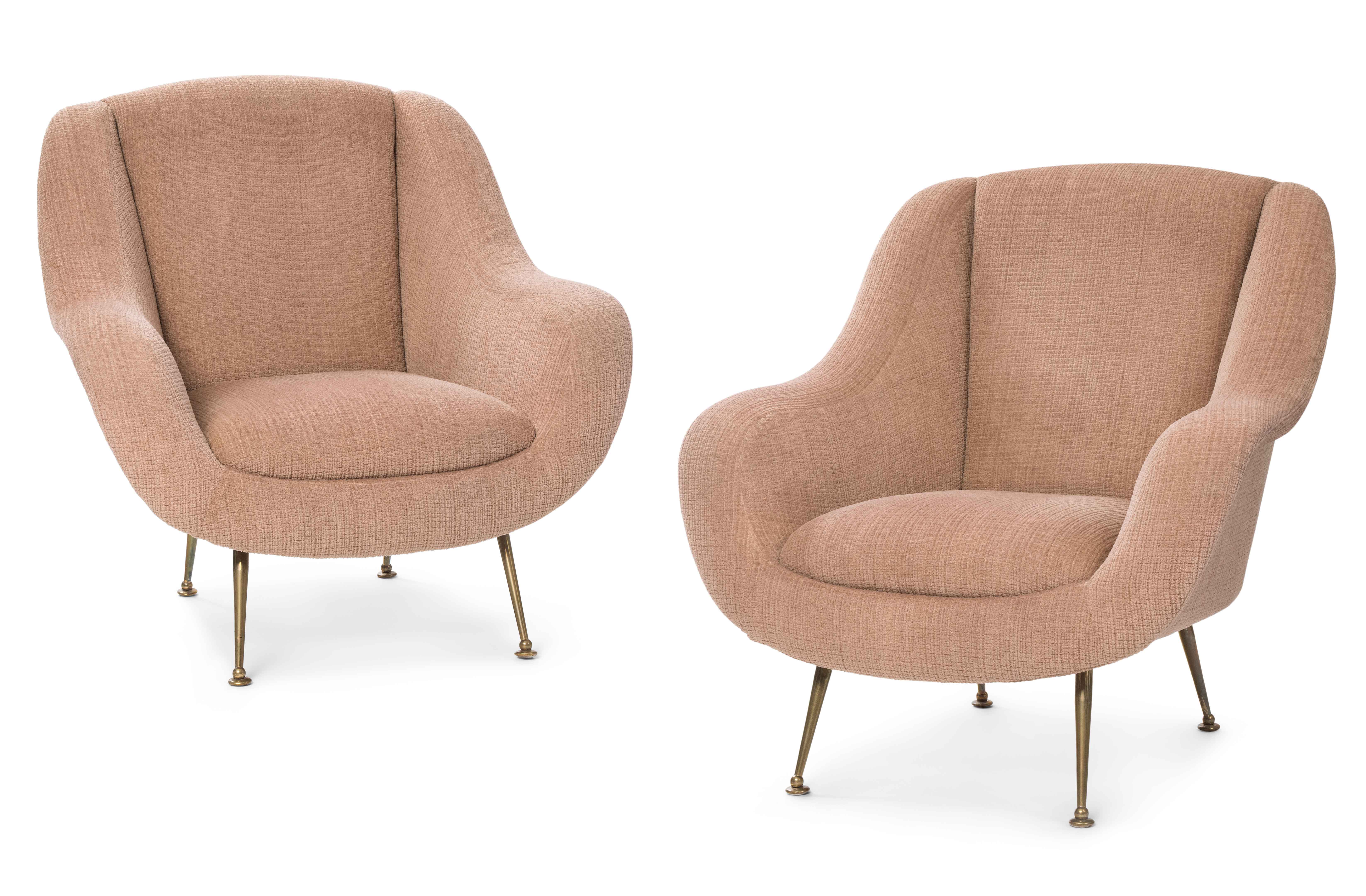 Ein Paar Sessel, ca. 1950. Veloursbezug gepolstert auf Messingfüssen. Bezug mit altersbedingter Verfärbung. Guter Zustand. 88x75x85 cm.
