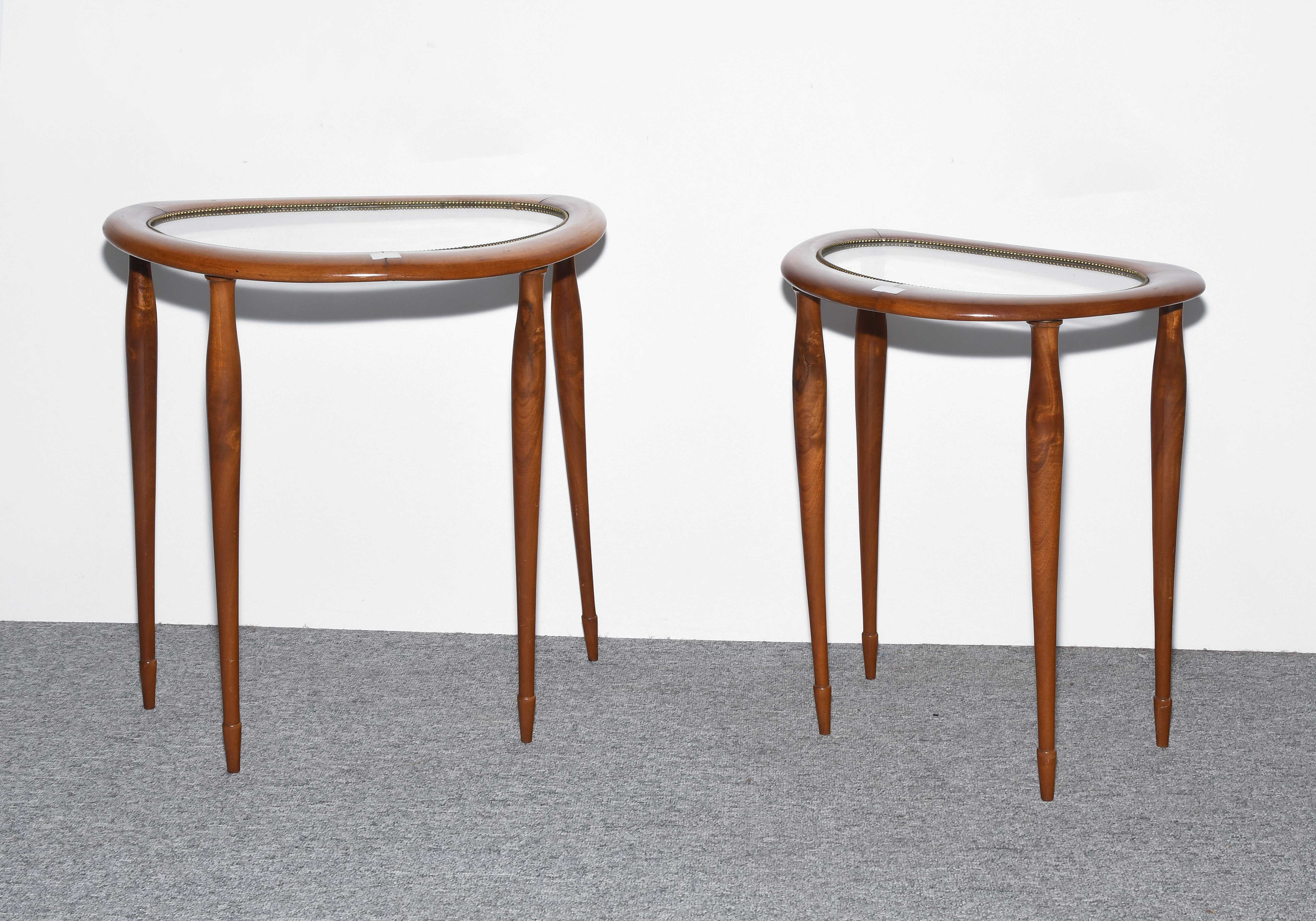 Zweisatz-Beistelltische, ca. 1950. Nierenförmig. Mahagoni und Glasplatte. Gebrauchsspuren. Guter Zusand. 49x33x49 cm und 39x29x46 cm.