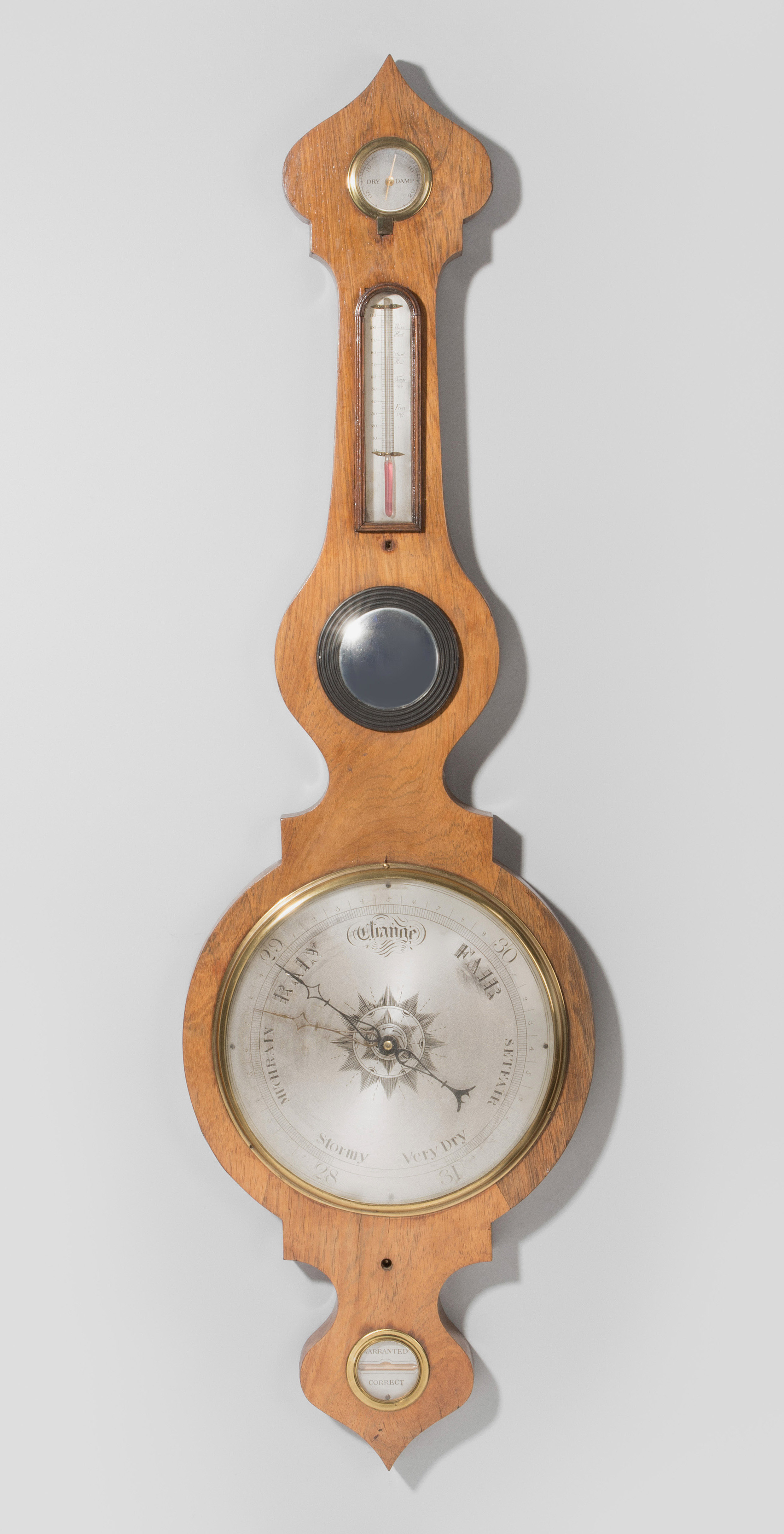 England, 19.Jh. Helles Holzgehäuse. Wetteranzeige in Englisch. Die Queksilbersäule ist von der Rückseite zugänglich. Das Thermometer mit roter Temperaturanzeige ist im Gehäusehals eingebaut. Das Hygrometer ist am oberen Ende eingelassen. Am unteren Ende befindet sich eine Wasserwaage. In der Mitte ziert ein runder Spiegel das Instrument. 106x31 cm.