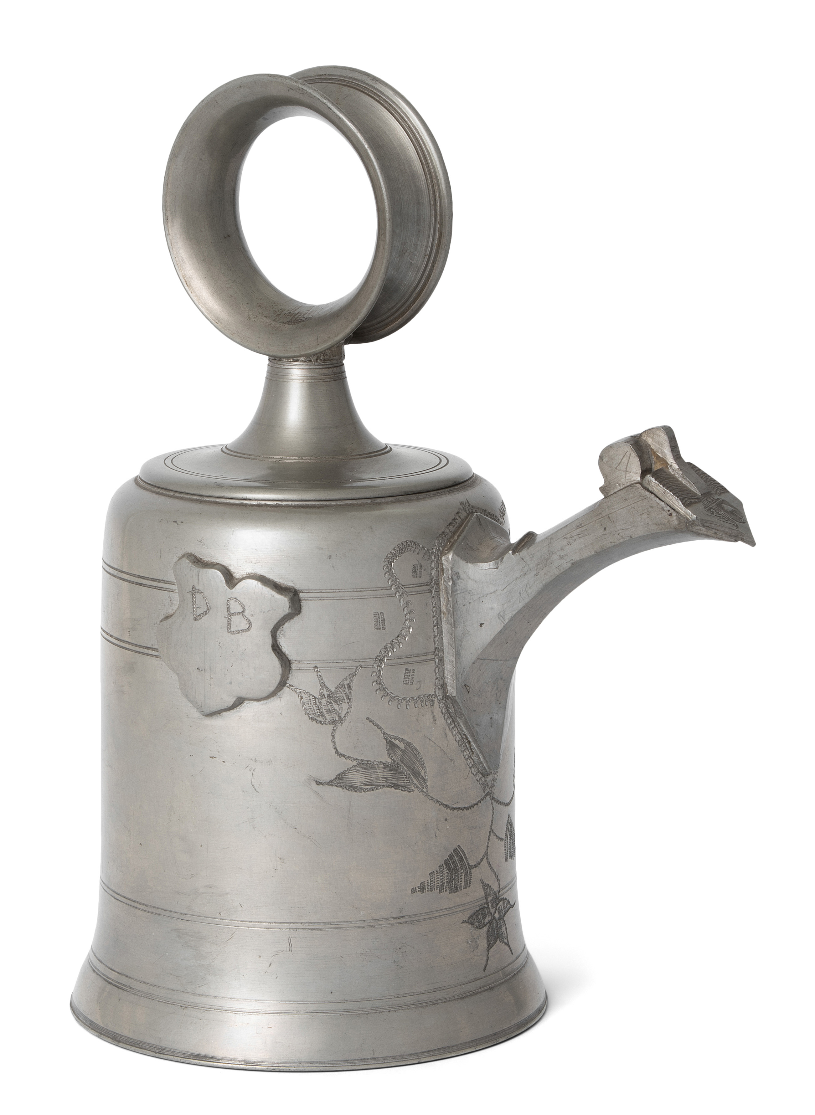 Winterthur, um 1800. Zinn. Marke des Hans Heinrich Forrer (1748–1819). Ringhenkel mit Bajonettverschluss. Schild mit eingravierten Initialen "DB". Vorn ornamentale und florale Gravuren. H 26 cm.