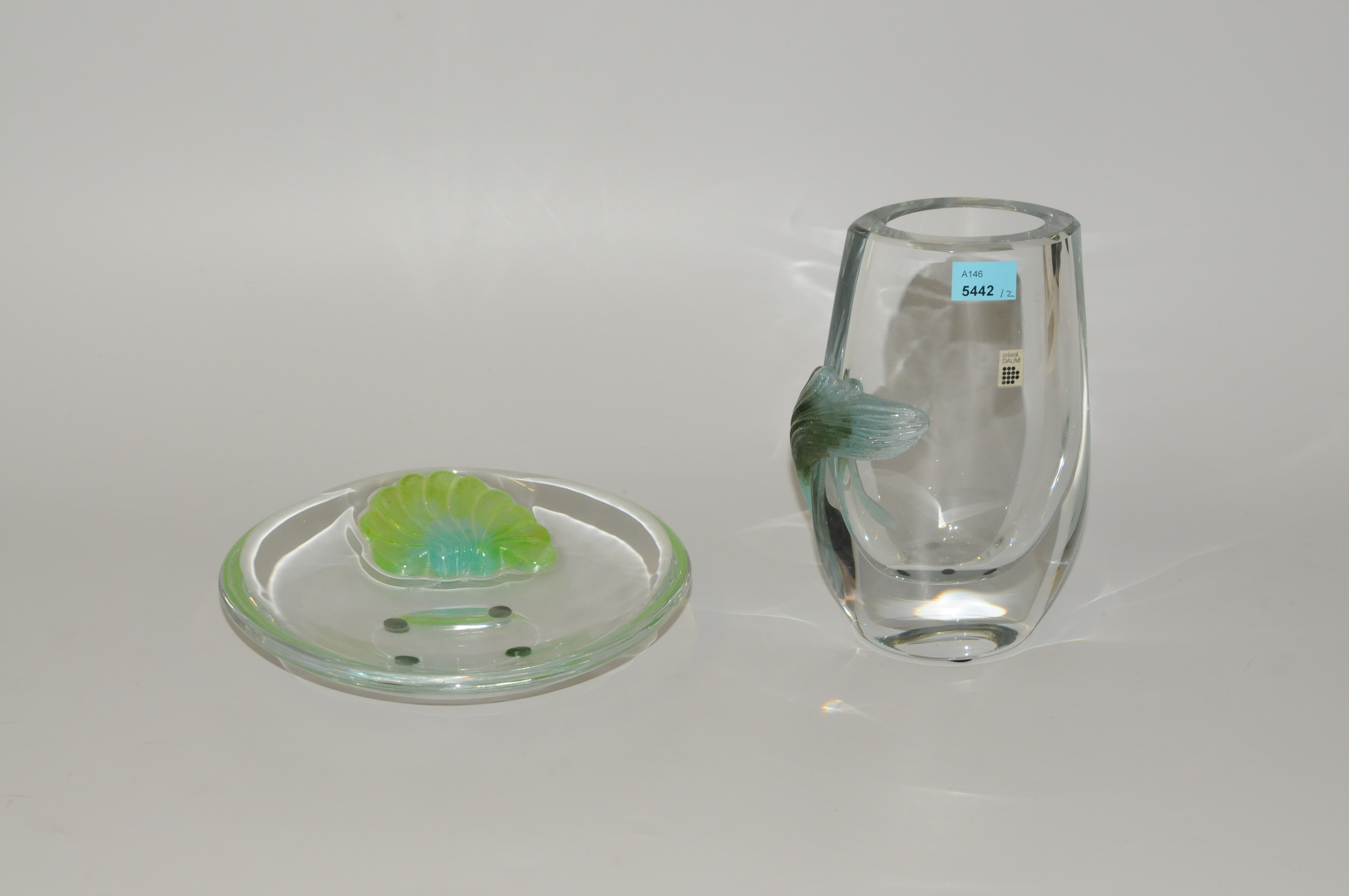 Daum, Nancy, 20.Jh. Farbloses Kristallglas bzw. Pâte-de-verre. Runde bzw. gedrückte Form. Applizierter Blattdekor. D (Schale) 18,5 cm. bzw H (Vase) 17,5 cm.