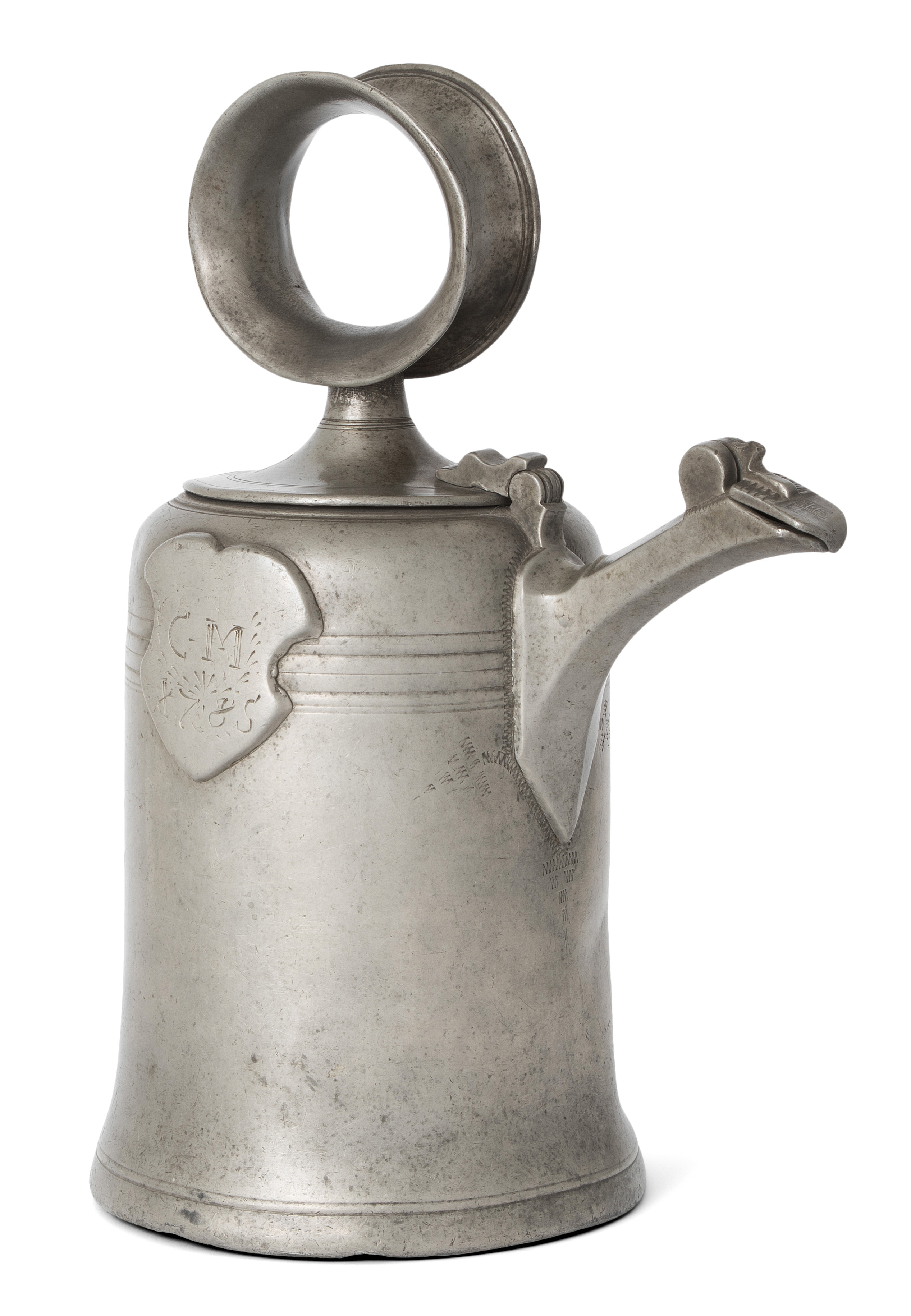 Zug, datiert 1785. Zinn. Marke des Joachim Leonz Keiser (1728–1809). Ringhenkel mit Bajonettverschluss. Schild mit eingravierten Initialen "C M" und Jahreszahl. H 35 cm.