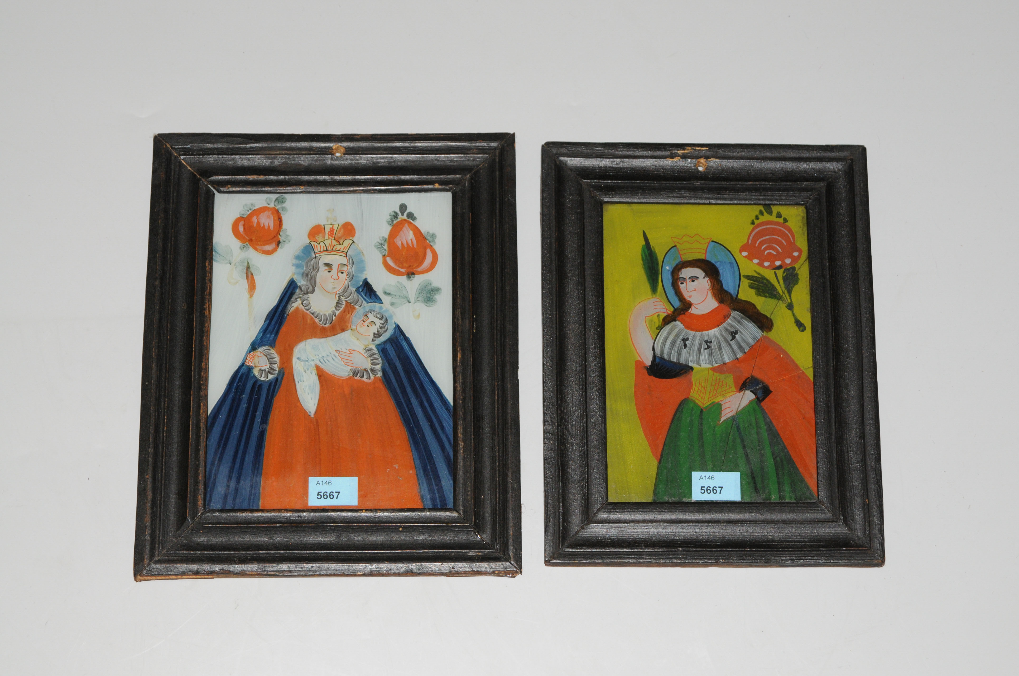 Böhmen, Buchers, 19.Jh. Polychrome Malerei hinter Glas. Maria mit Kind vor weissem Hintergrund, in den oberen Ecken 2 Blütenmotive. 17,5x12,5 cm. Originalrahmen. Dazu: Hinterglasbild. Sandl, 19.Jh. Märtyrerin auf gelbem Fond (Sprünge). 16,5x11 cm. Originalrahmen.