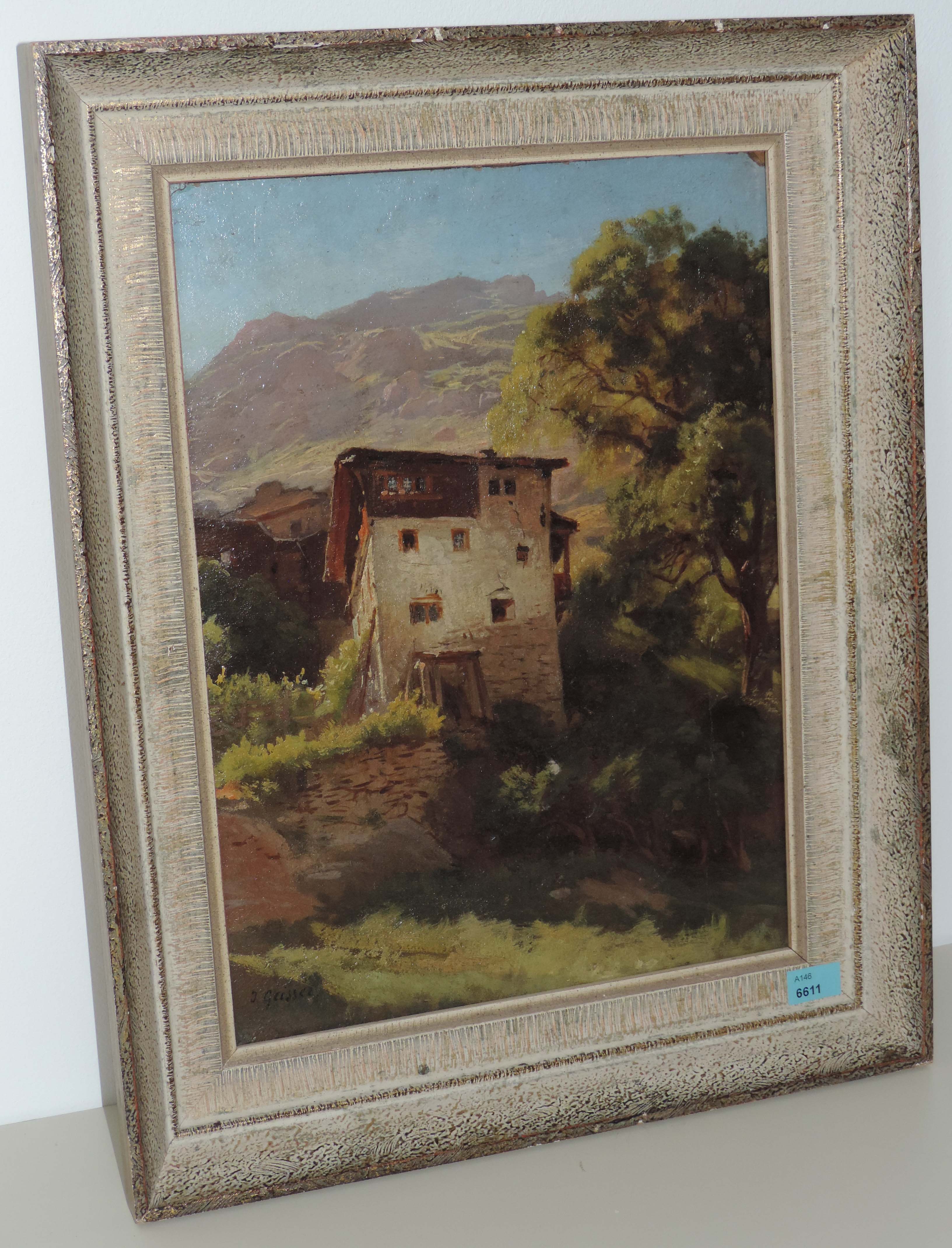Bergdorf. Öl auf Papier über Leinwand. Unten links signiert. 34x25 cm.