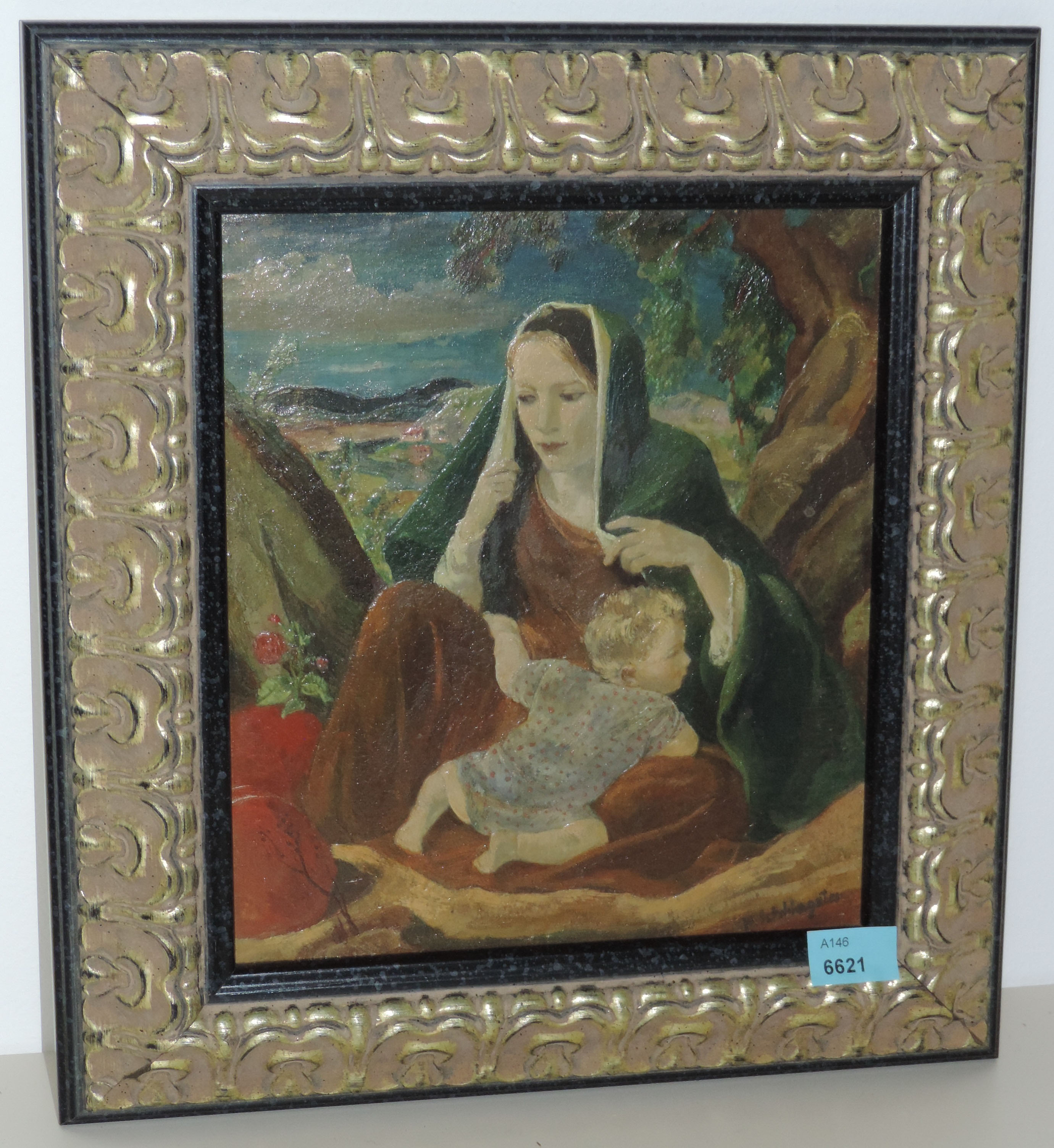 Mutter mit Kind. Öl auf Holz. Unten rechts signiert. 20x19 cm.