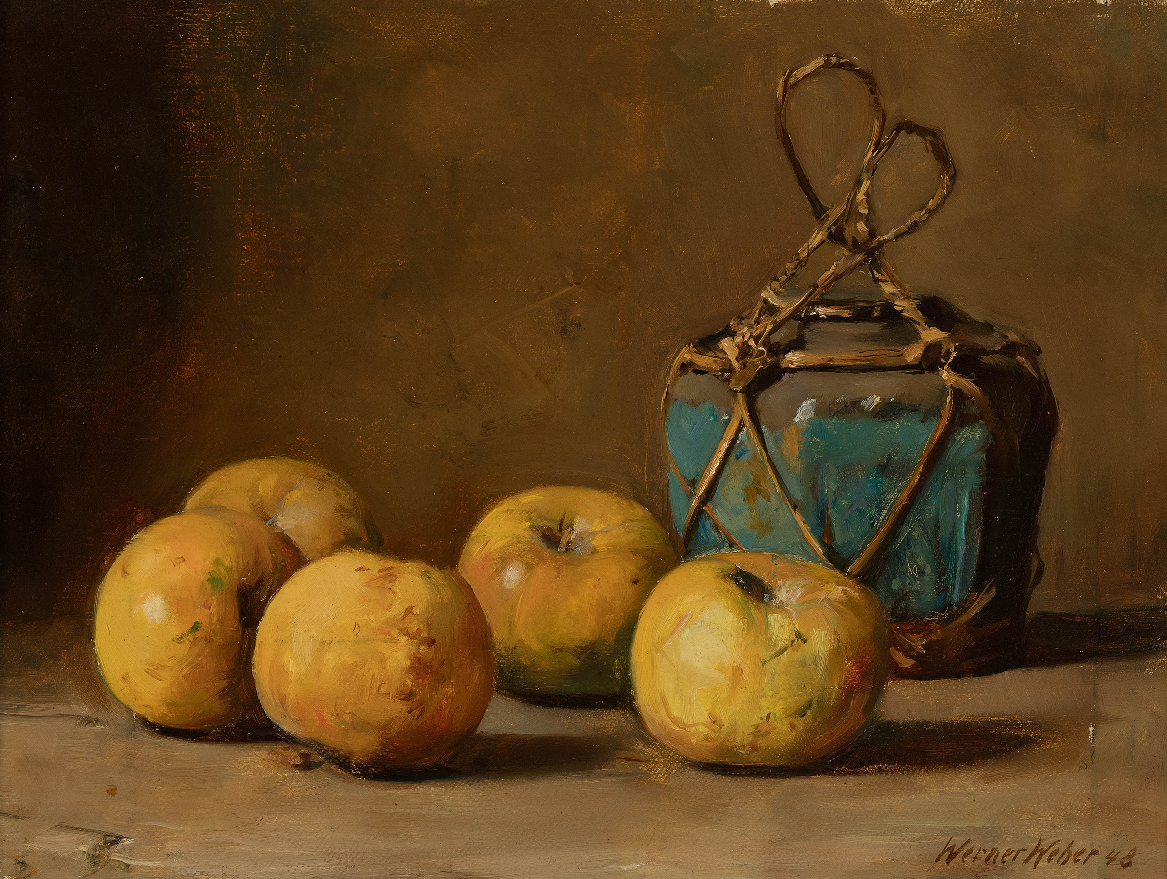 Ingwertopf mit Äpfeln, 1946. Öl auf Leinwand. Unten rechts signiert und datiert. 29x40 cm.