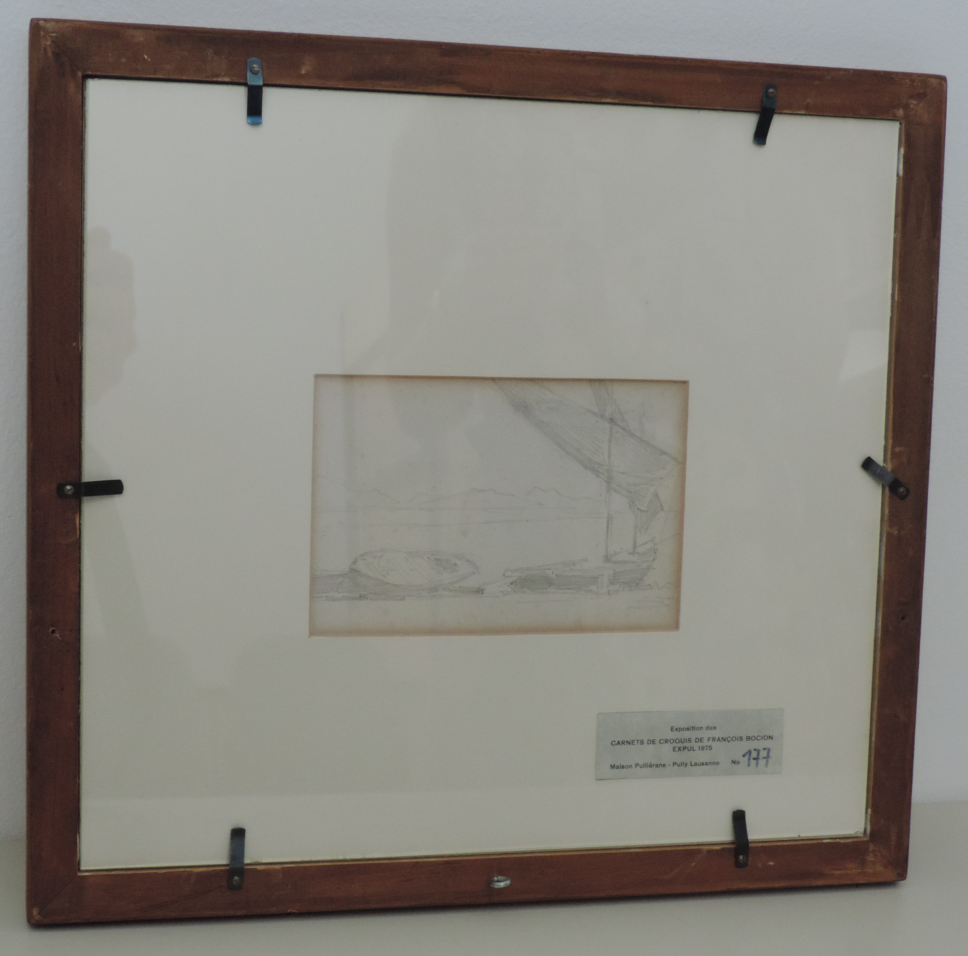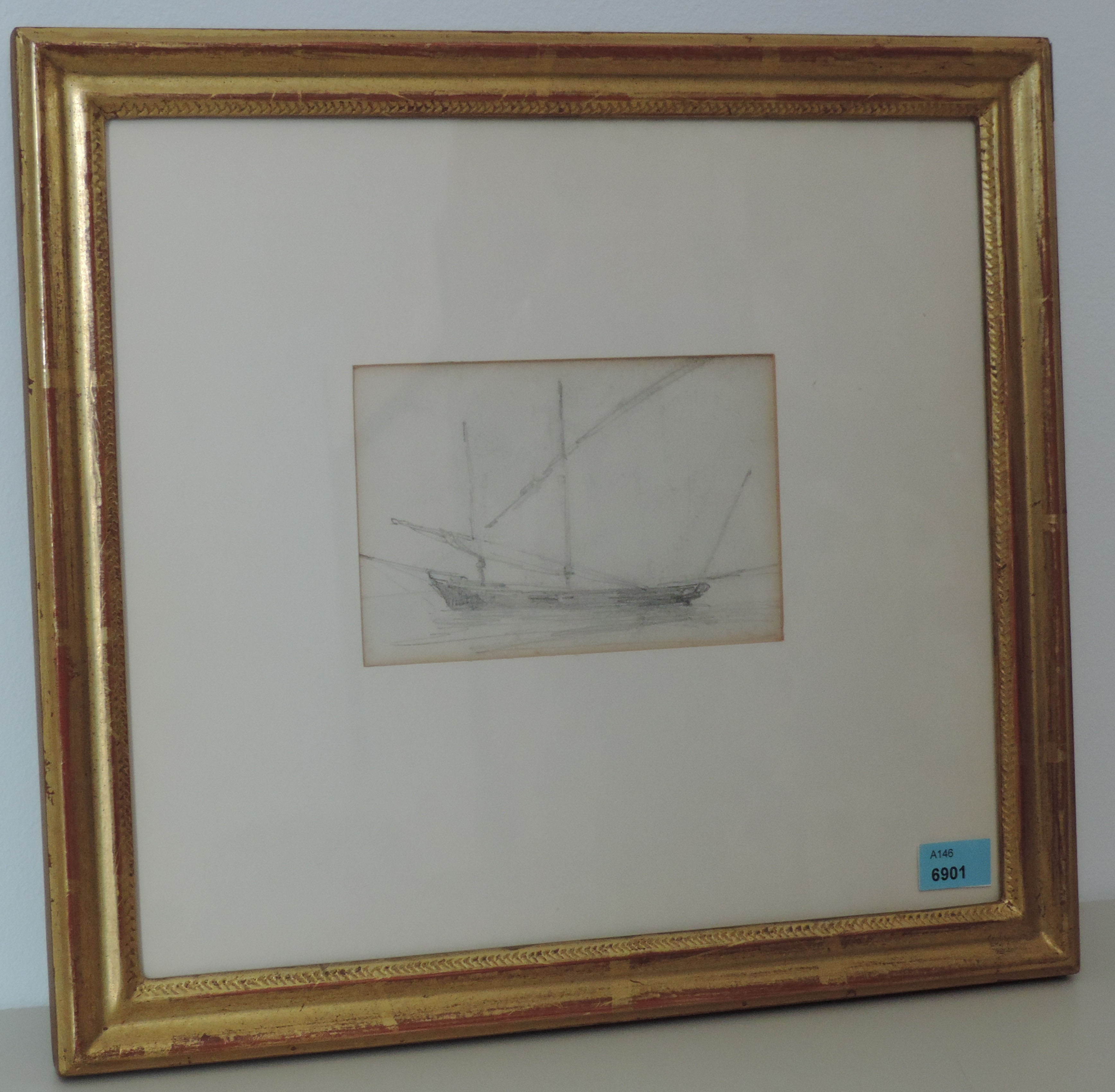 Segelboot. Bleistift auf Papier. Verso: Boote. Blattgrösse 9,3x14,6 cm. Gerahmt.