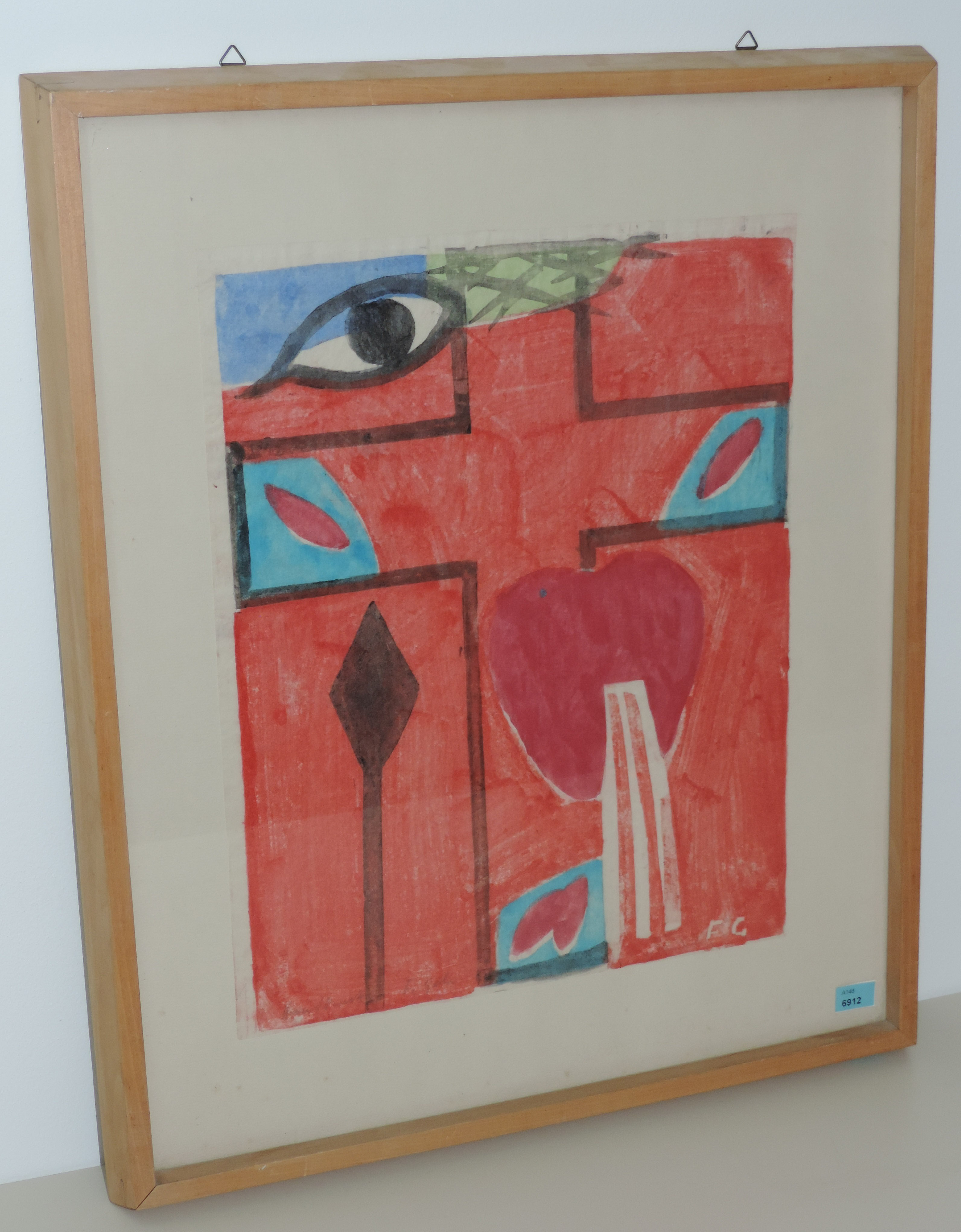 "Herz Jesu". 1956. Farbholzschnitt. Unten links signiert. Unten rechts im Druck monogrammiert. Blattgrösse 39,2x30,8 cm. Gerahmt.