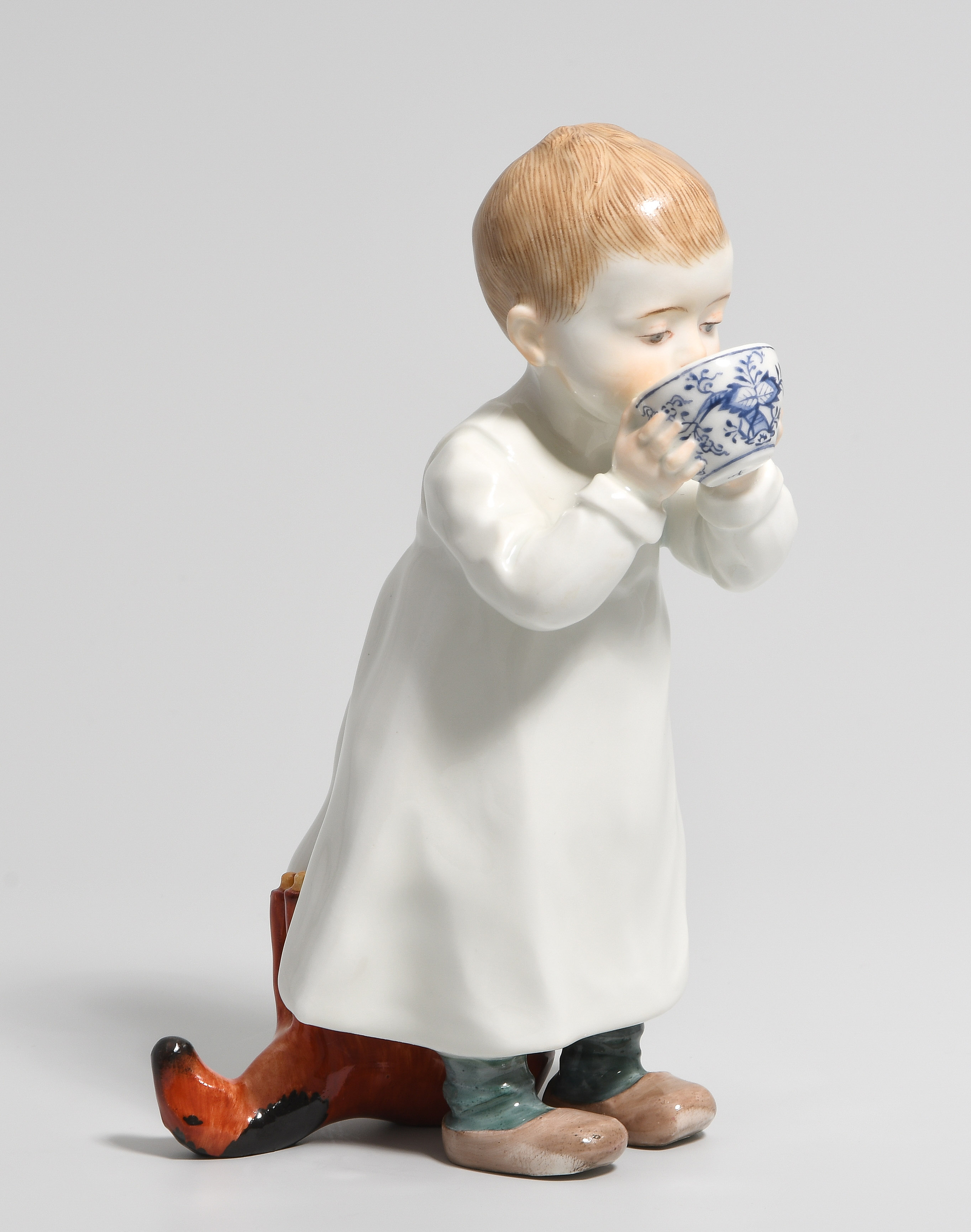 Um 1905. Kind aus einer Tasse trinkend. Modell von Konrad Hentschel ("Hentschelkind", 1. Wahl. Porzellan, farbige Bemalung. Bezeichnet: Schwertermarke, Modellnummer W 118, Malernummer 53. H 16,5 cm.