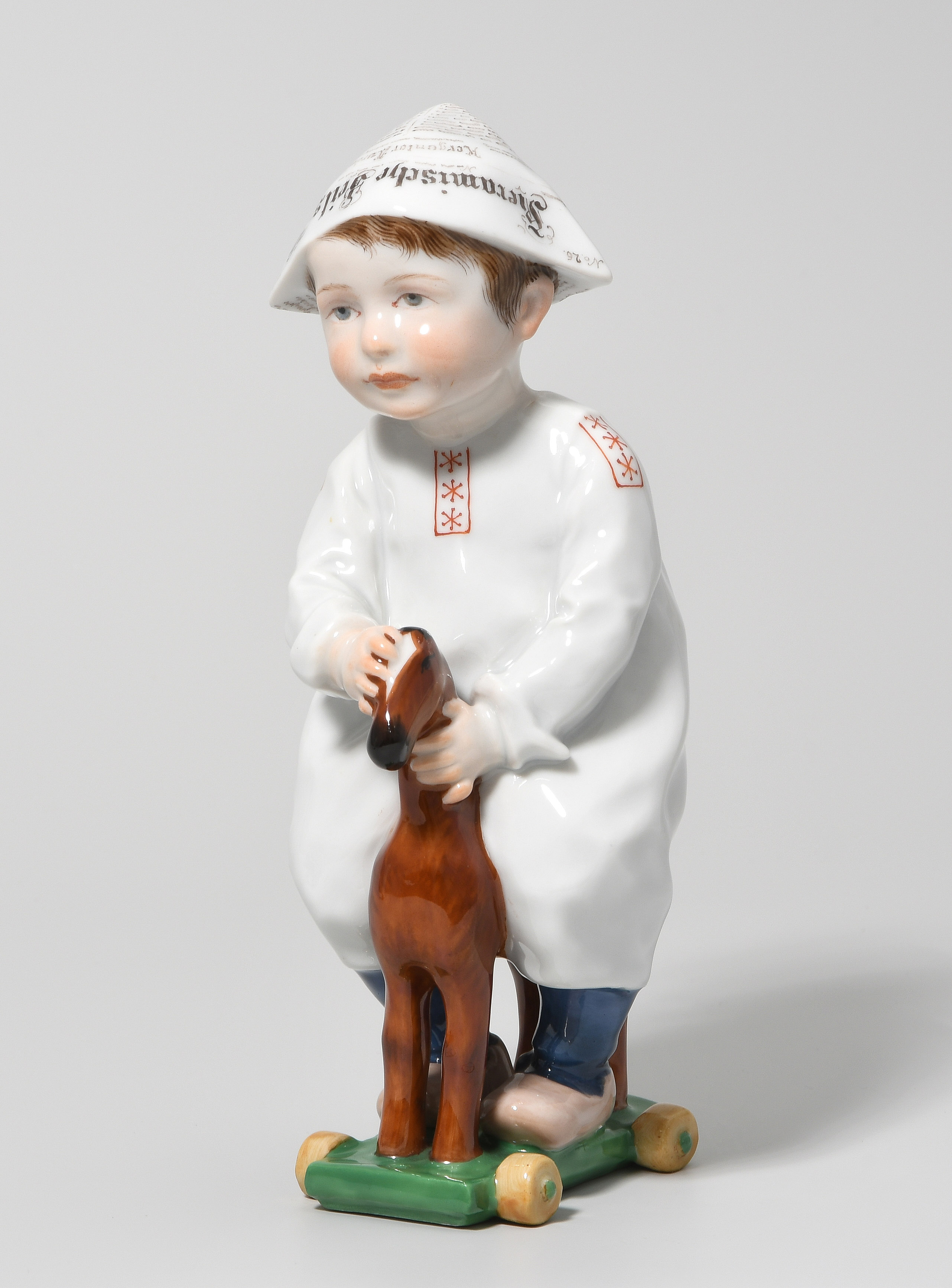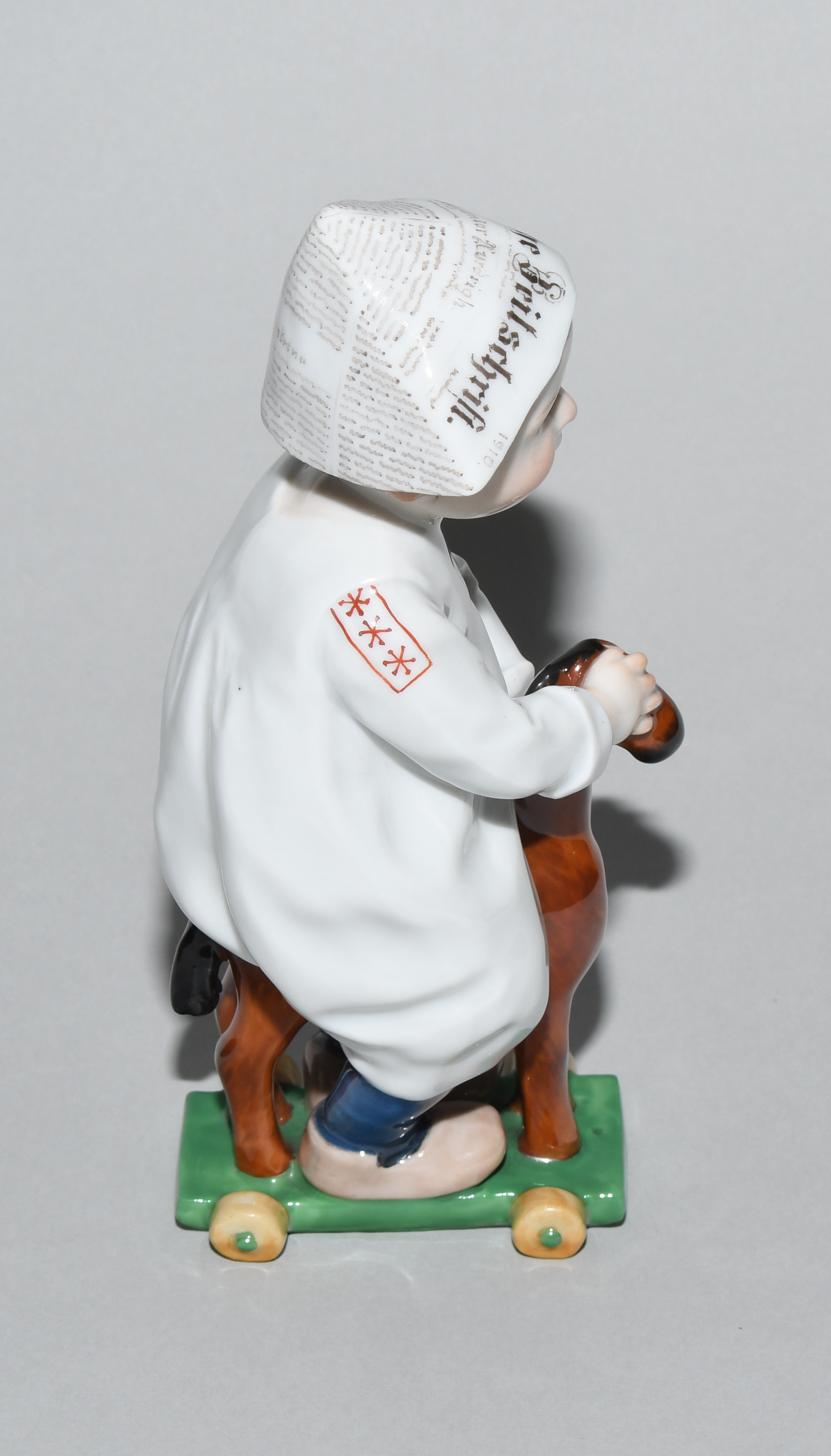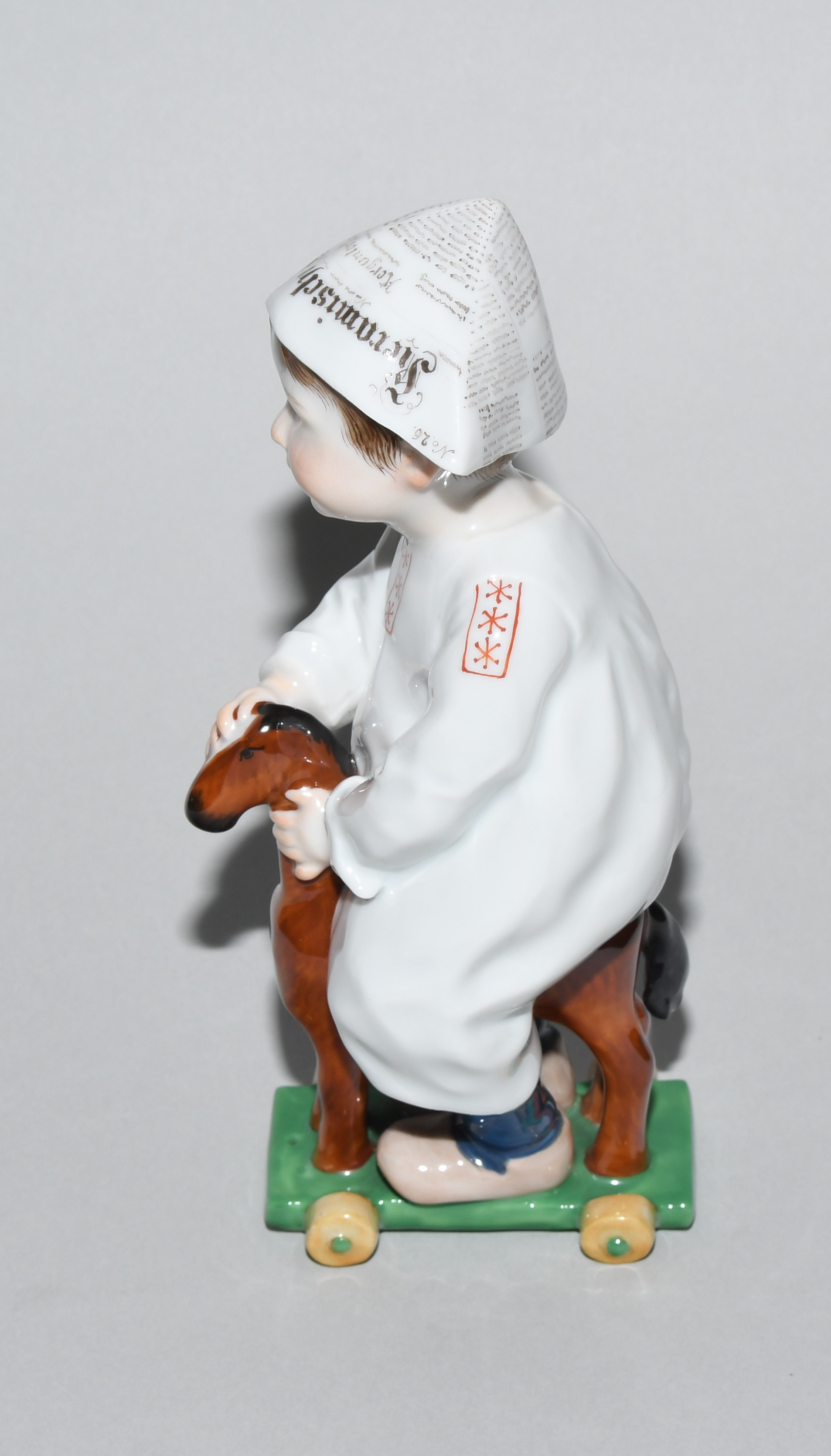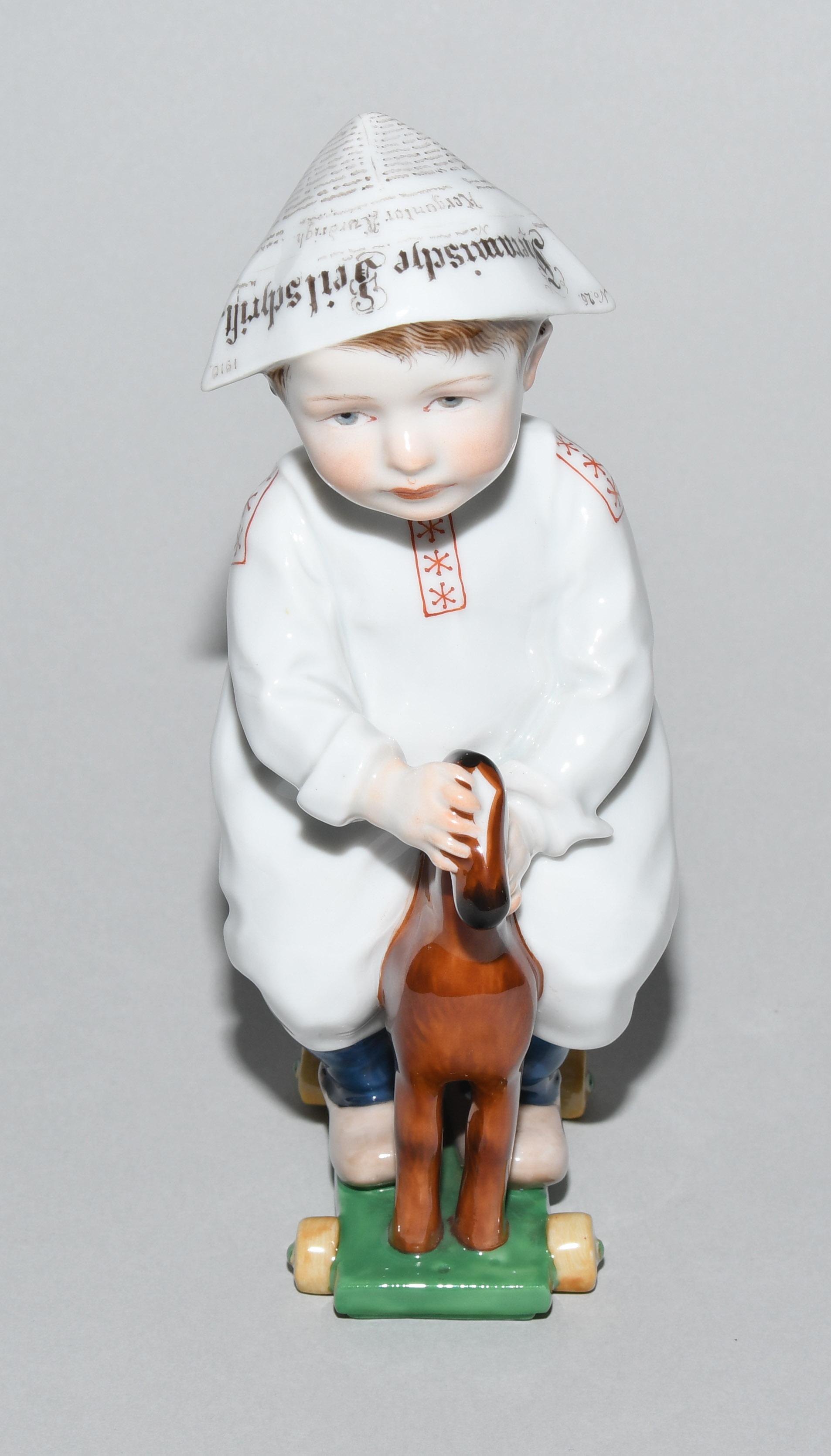 Um 1905. Kind auf einem Holzpferd reitend. Modell von Konrad Hentschel ("Hentschelkind"), 1. Wahl. Porzellan, farbige Bemalung. Bezeichnet: Schwertermarke, Modellnummer W 120, Malernummer 17. H 17 cm.