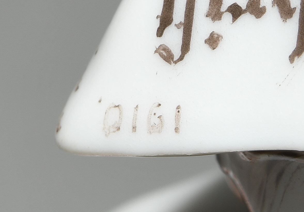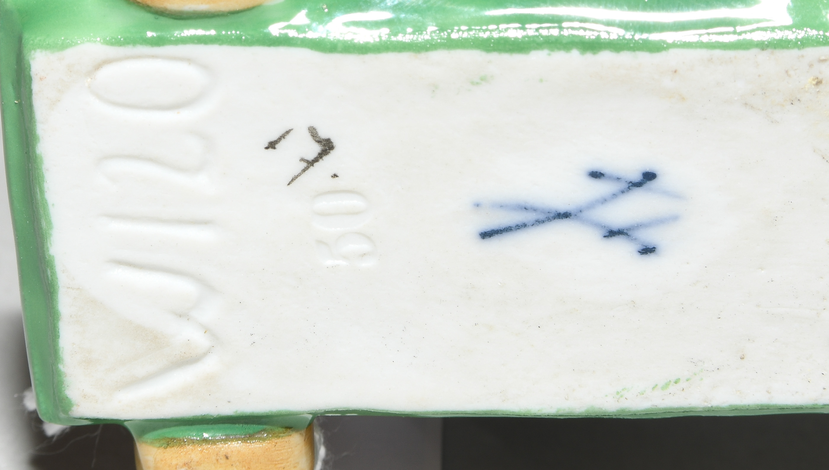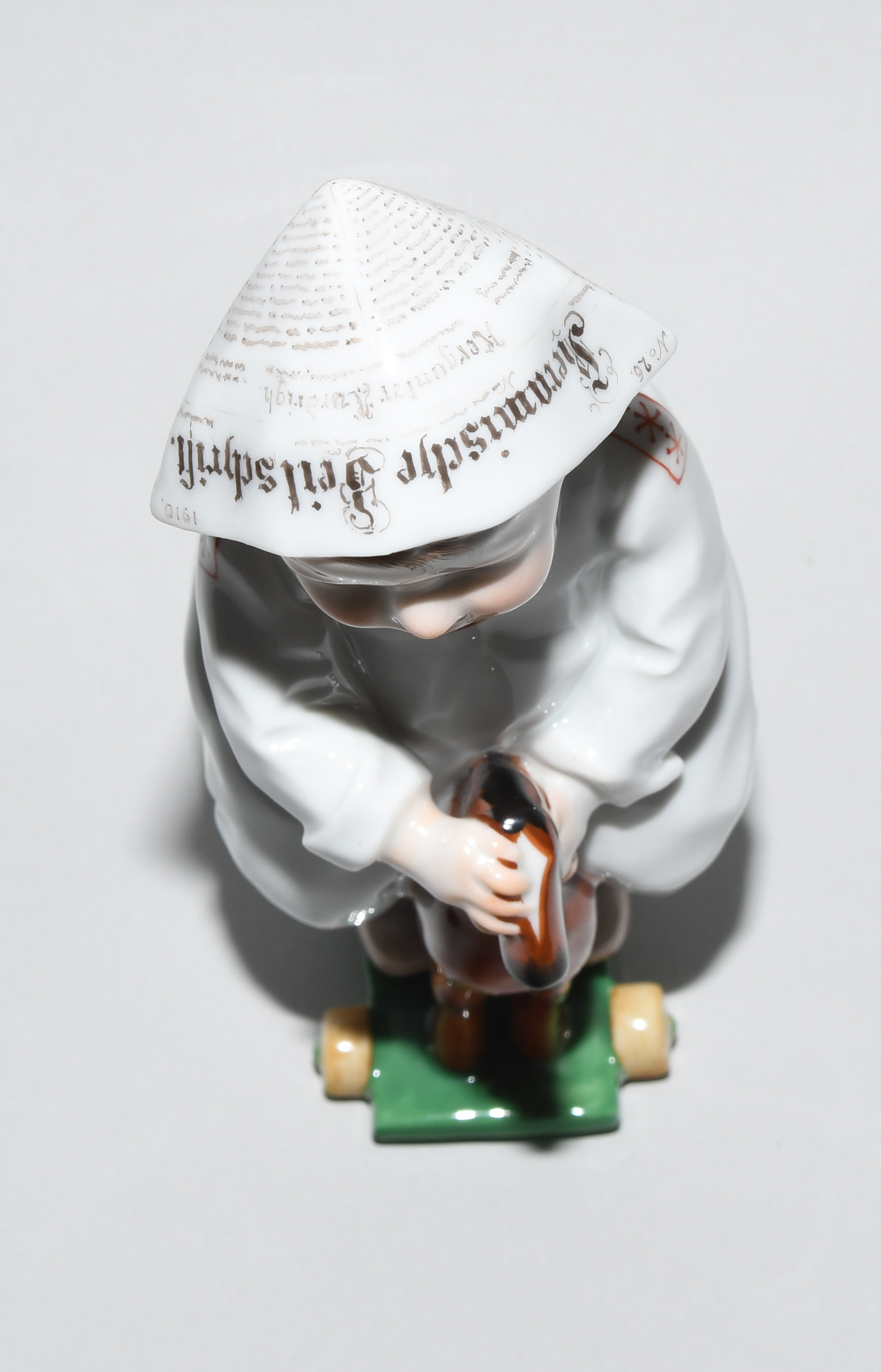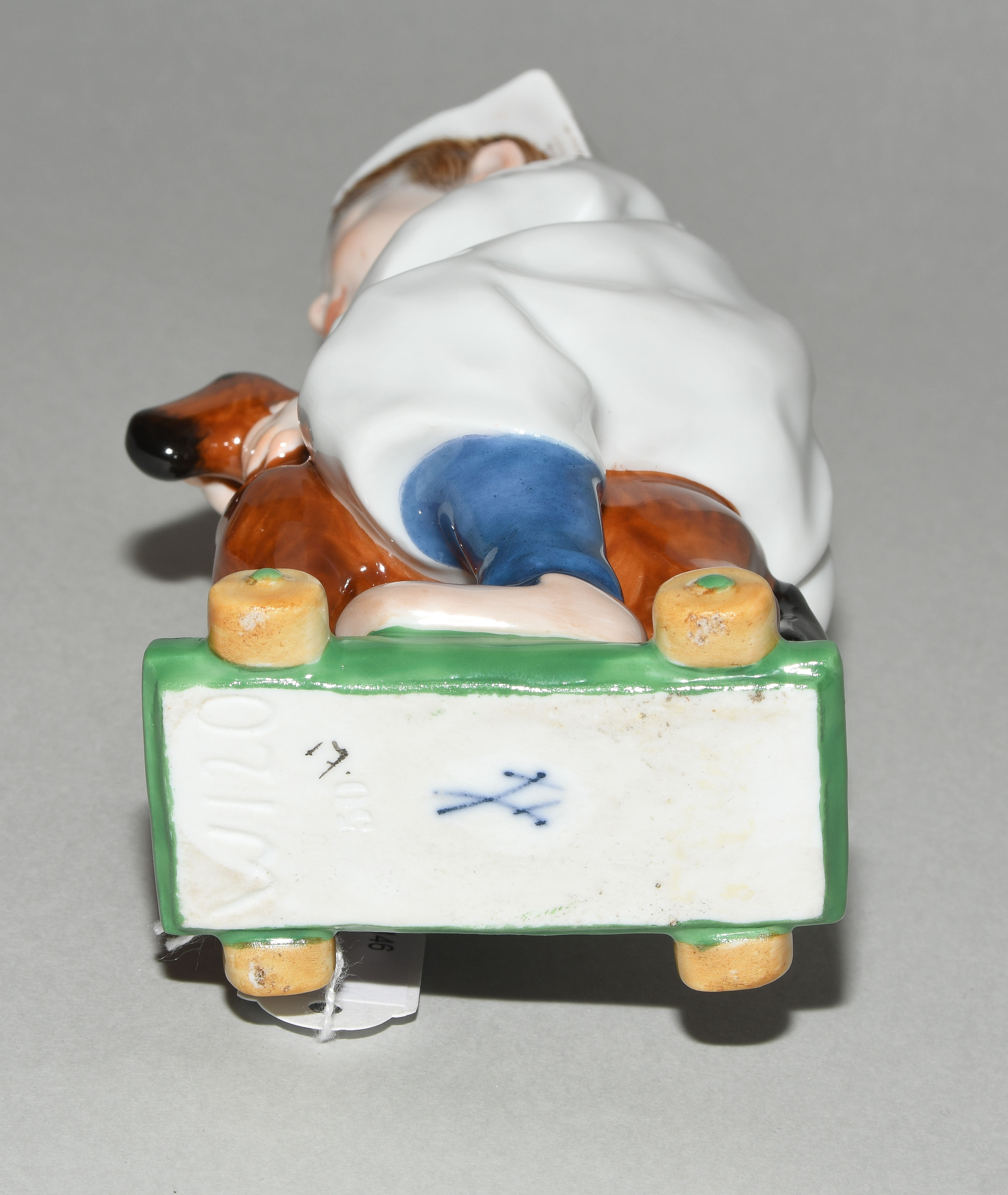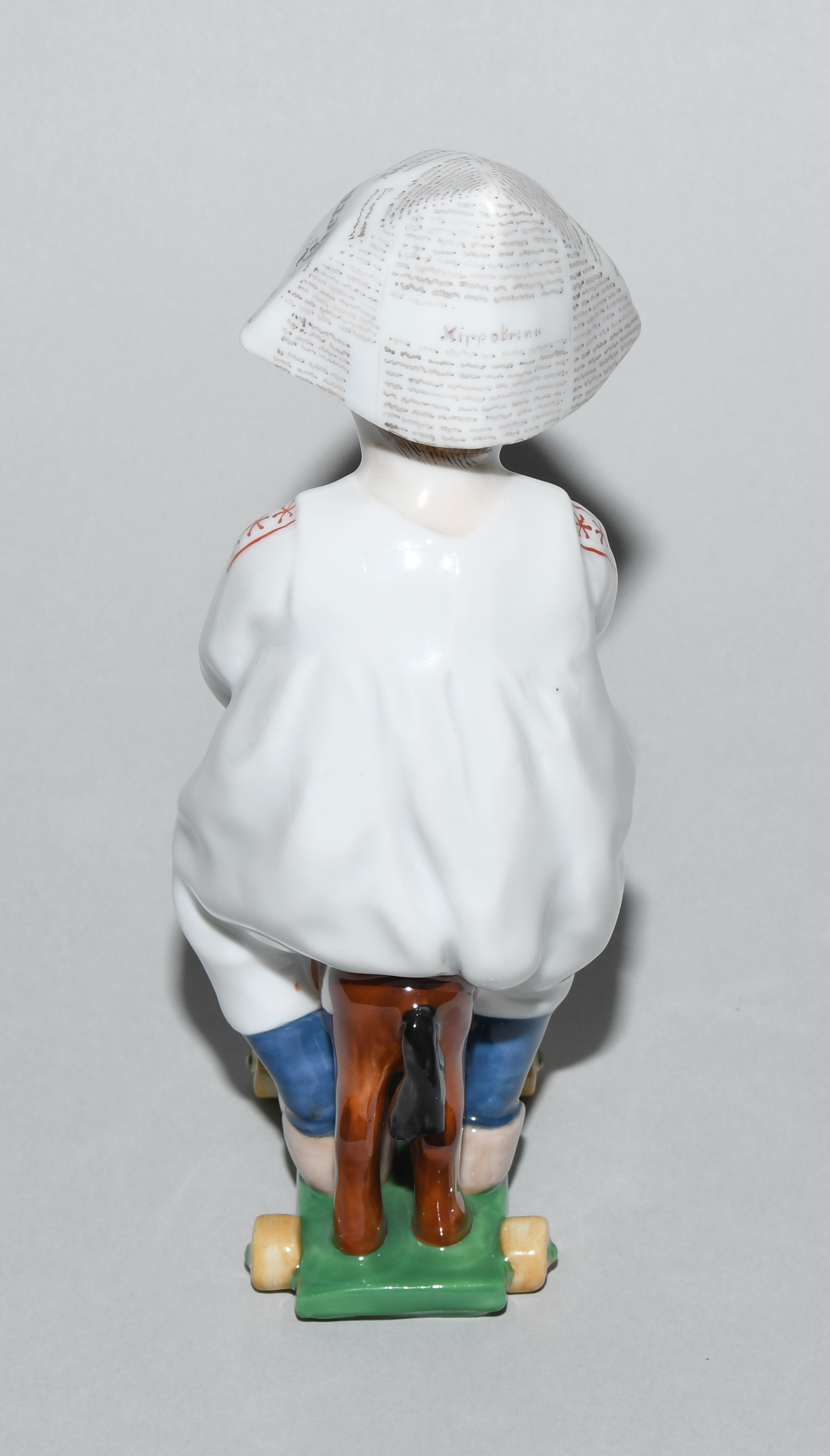 Um 1905. Kind auf einem Holzpferd reitend. Modell von Konrad Hentschel ("Hentschelkind"), 1. Wahl. Porzellan, farbige Bemalung. Bezeichnet: Schwertermarke, Modellnummer W 120, Malernummer 17. H 17 cm.