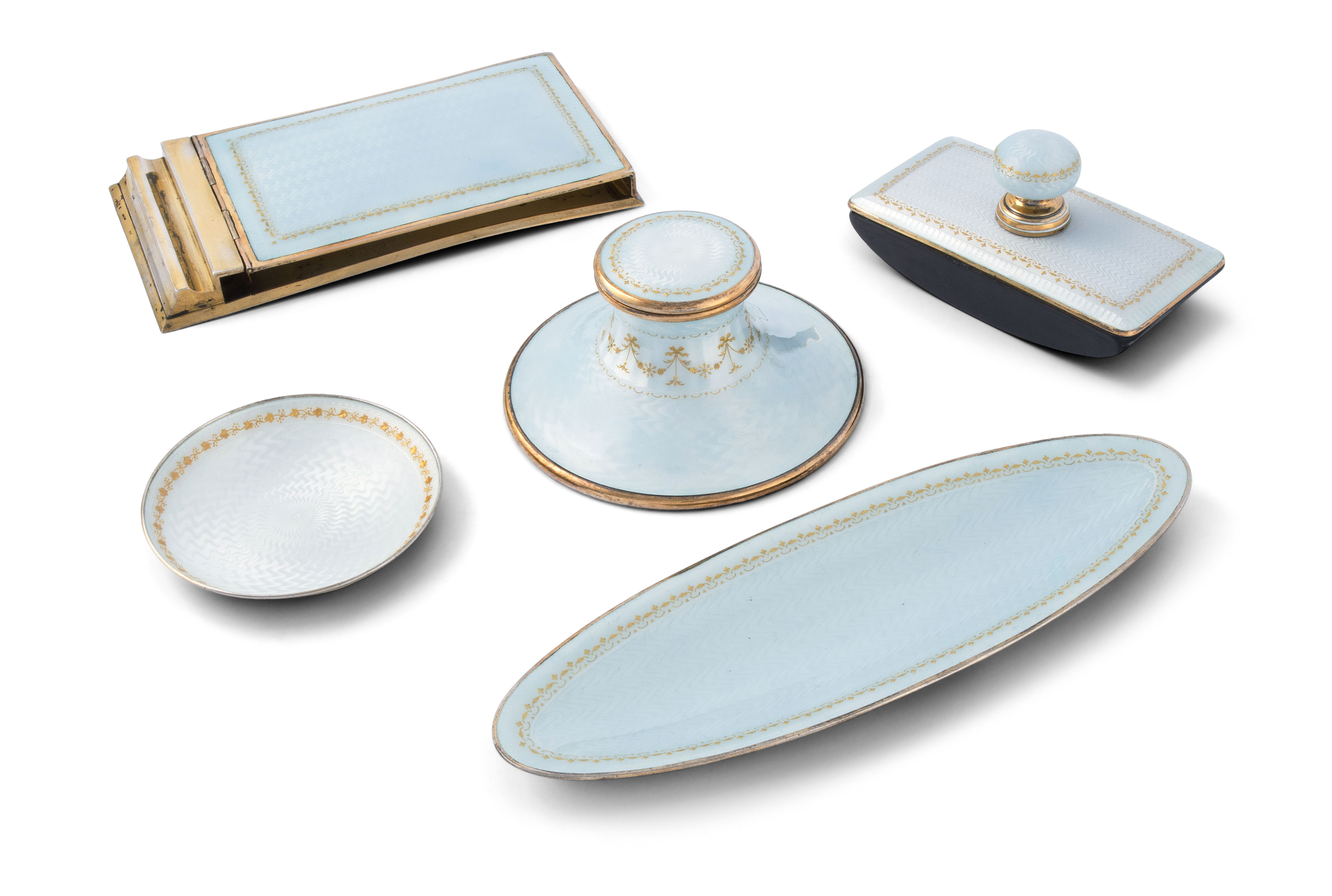 Norwegen, um 1900. Silber, vergoldet und Email. 5-teilige Garnitur mit lichtblauer Transluszidemail-Auflage auf guillochiertem Wellengrund und feiner goldfarbener Ornamentikbordüre. Bestehend aus Tintenfässchen, Löschwiege, Notizenblockhalter sowie einer ovalen, bzw. runden Schale. Meister- , Garantiemarke, Feingehalt 925. L 9–22 cm.
