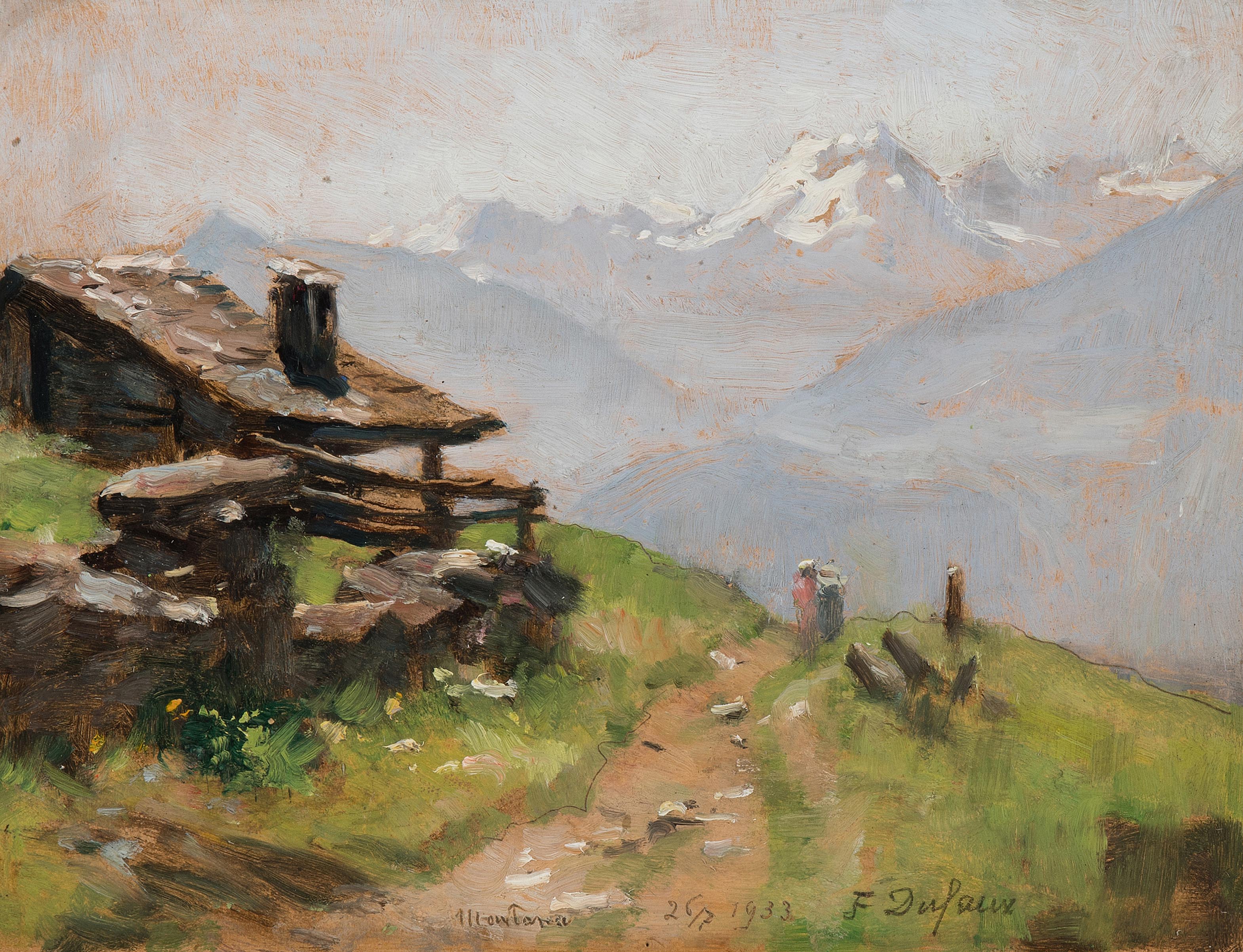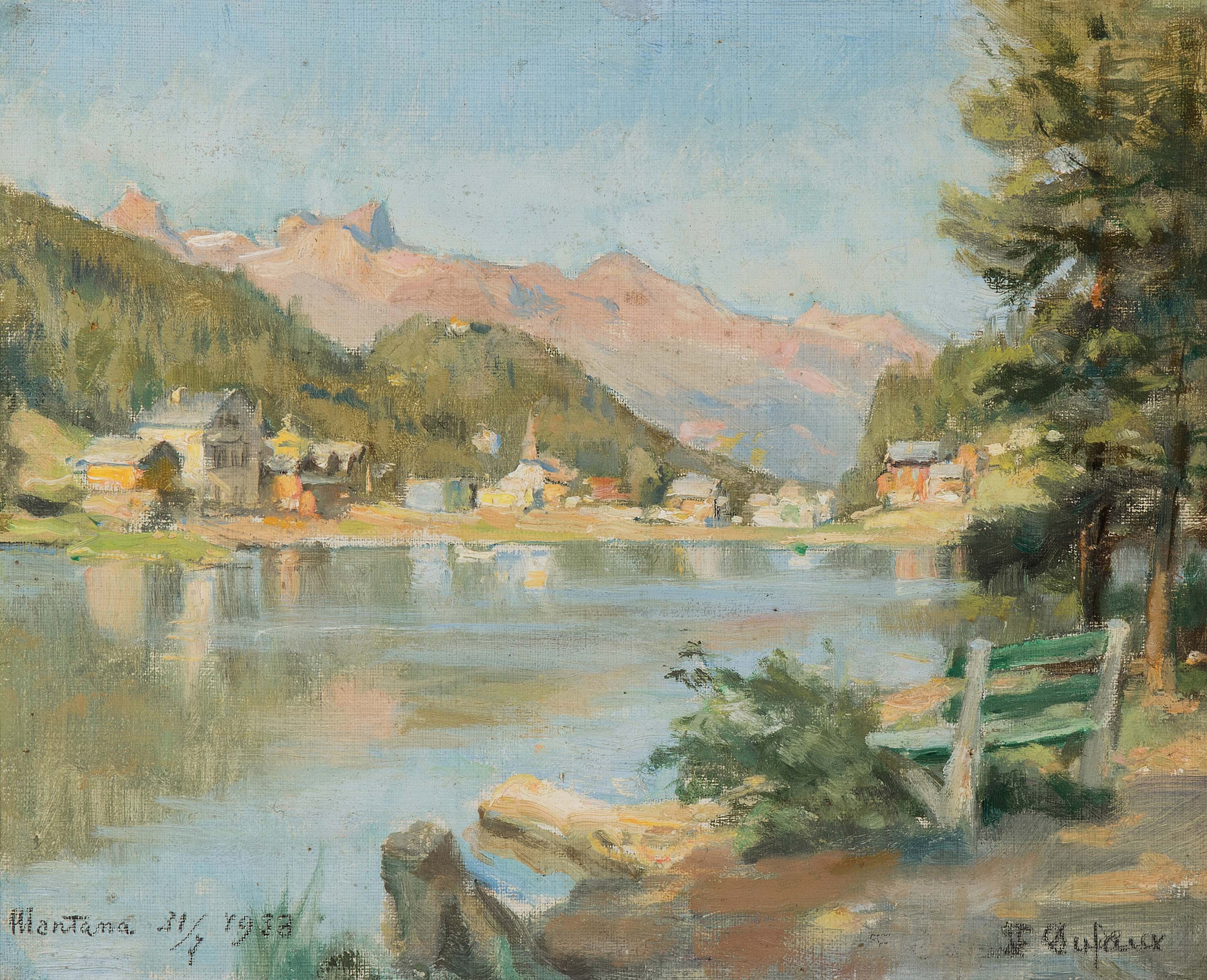Gegenstücke. Der Lac Moubra mit Crans-Montana, 1933. / Speicher oberhalb Crans-Montana. 1933. Öl auf Leinwand über Karton und Öl auf Karton. Unten links, bzw. unten mittig signiert, bezeichnet und datiert. Je ca. 18,5x25 cm.
