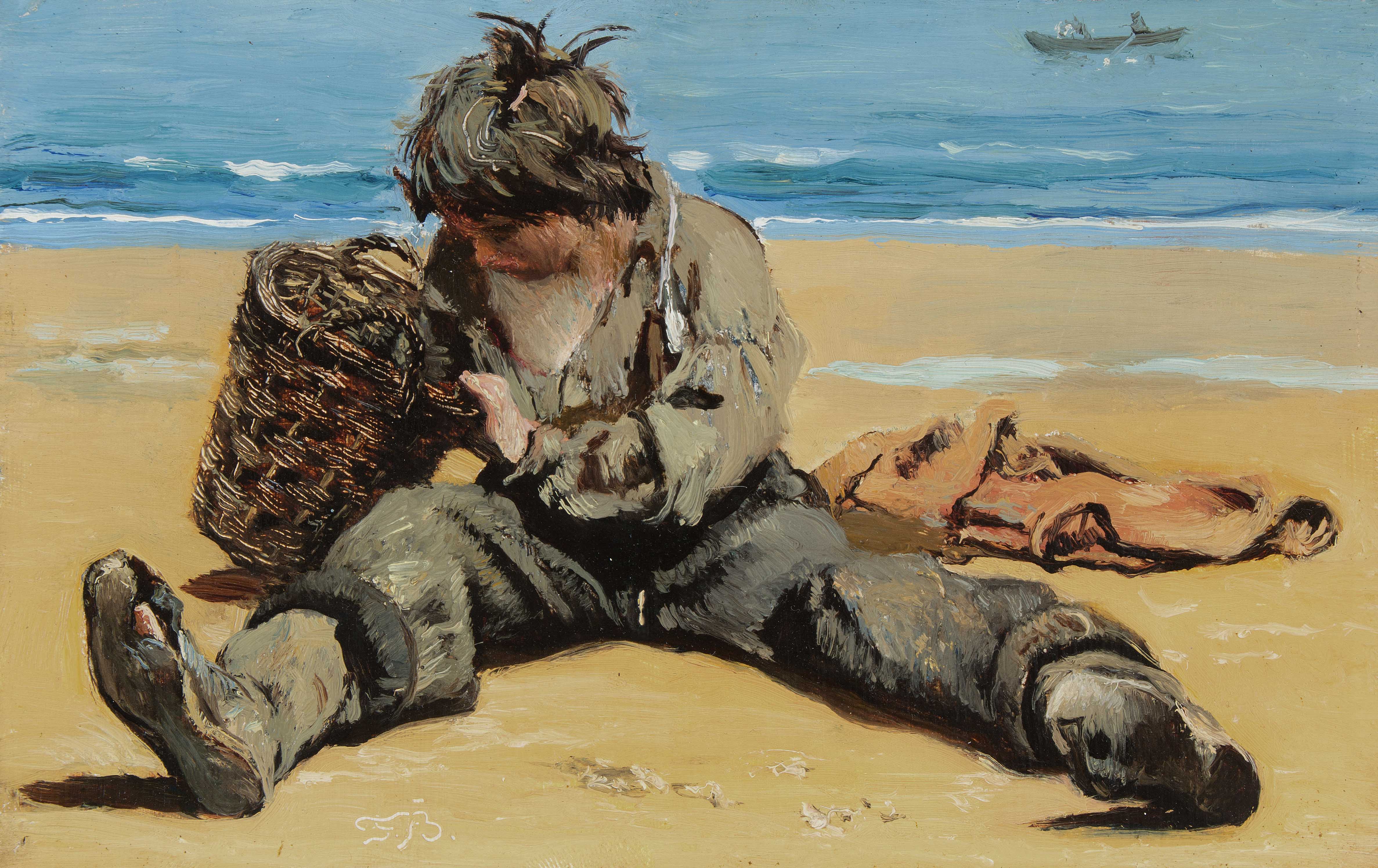 Am Strand sitzender Fischerjunge, 1876. Öl auf Papier über Karton. Unten mittig mit geritztem Monogramm. 15x24 cm.