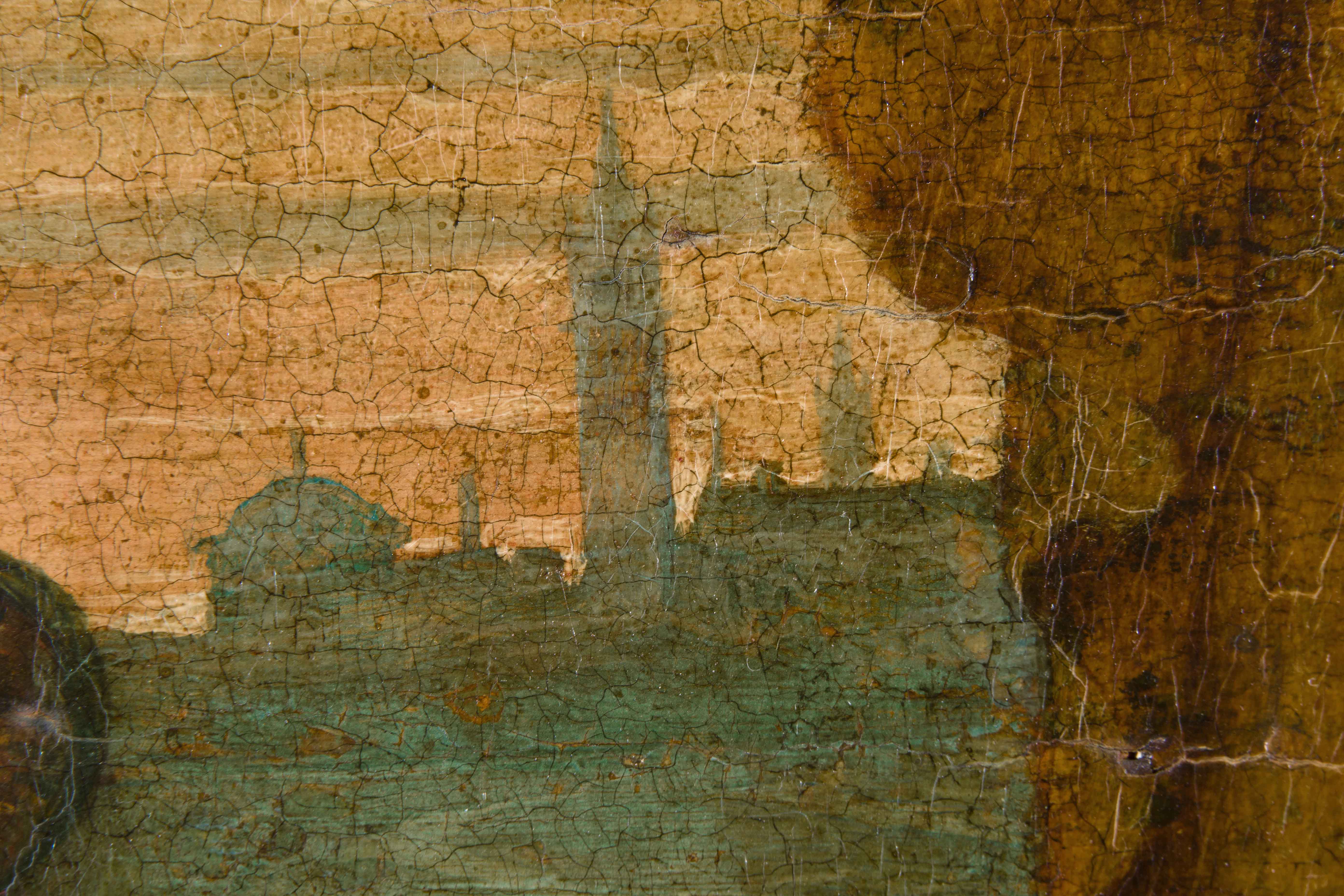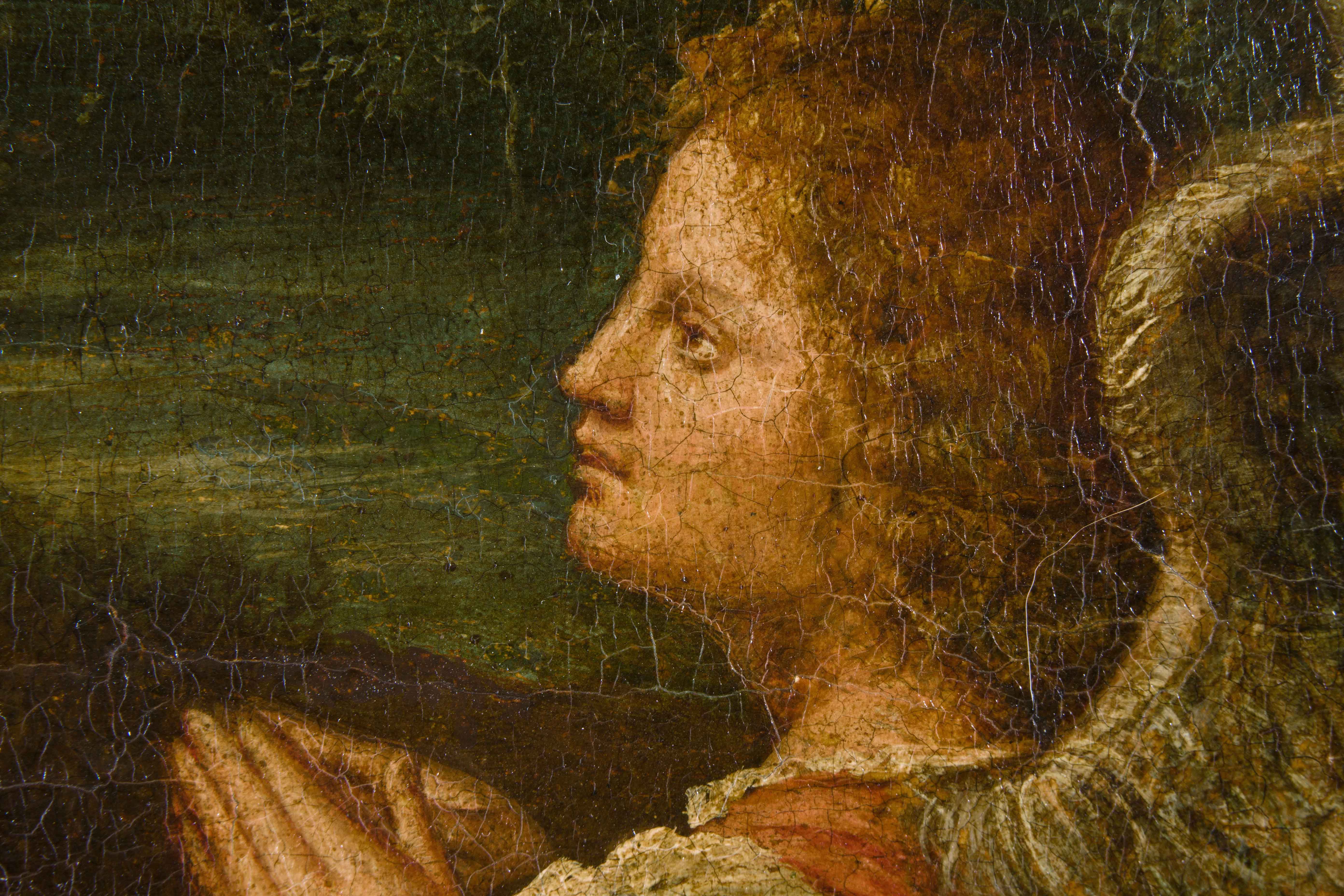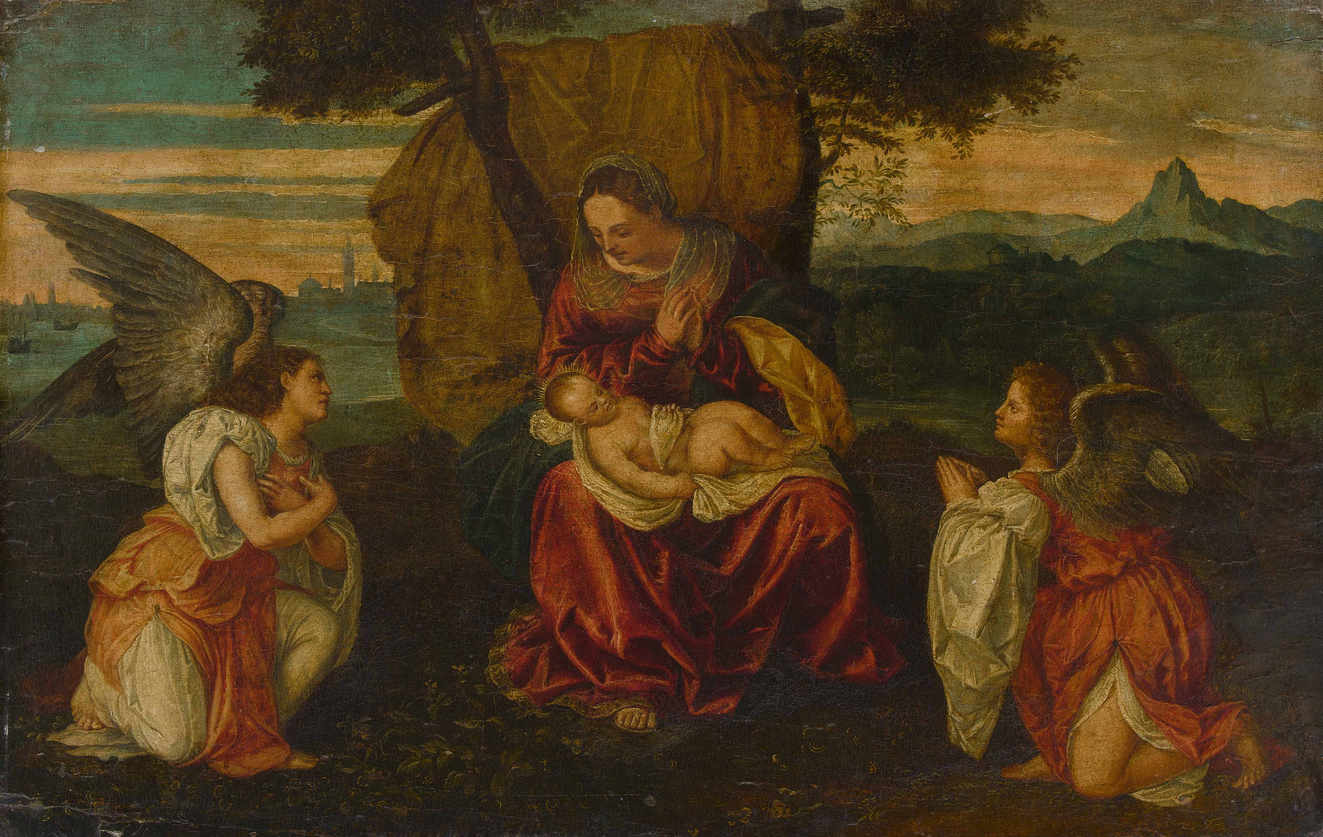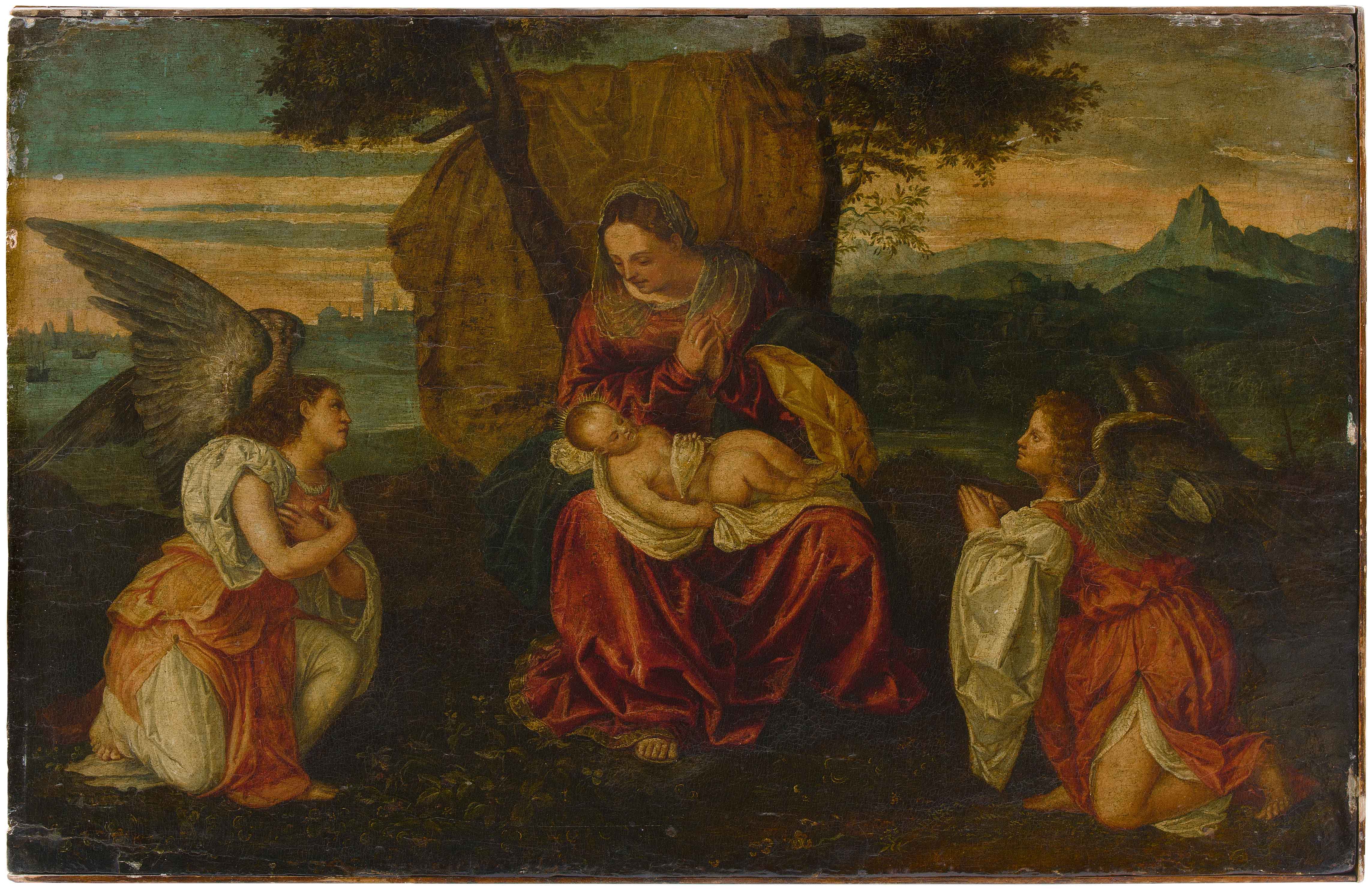 Das hier angebotene Gemälde mit Maria und dem Kind, an beiden Seiten zwei anbetende Engel, rechts eine Gebirgslandschaft (wohl die Vordolomiten), links die Lagune von Venedig, wurde dem Kanon Tizians entnommen und trug damals eine Zuschreibung an den Meister. Der Künstler Pietro Anderloni fertigte 1823 nach dieser "Anbetung der Engel" im Auftrag von Artaria & Fontaine, Mannheim, einen Kupferstich an.